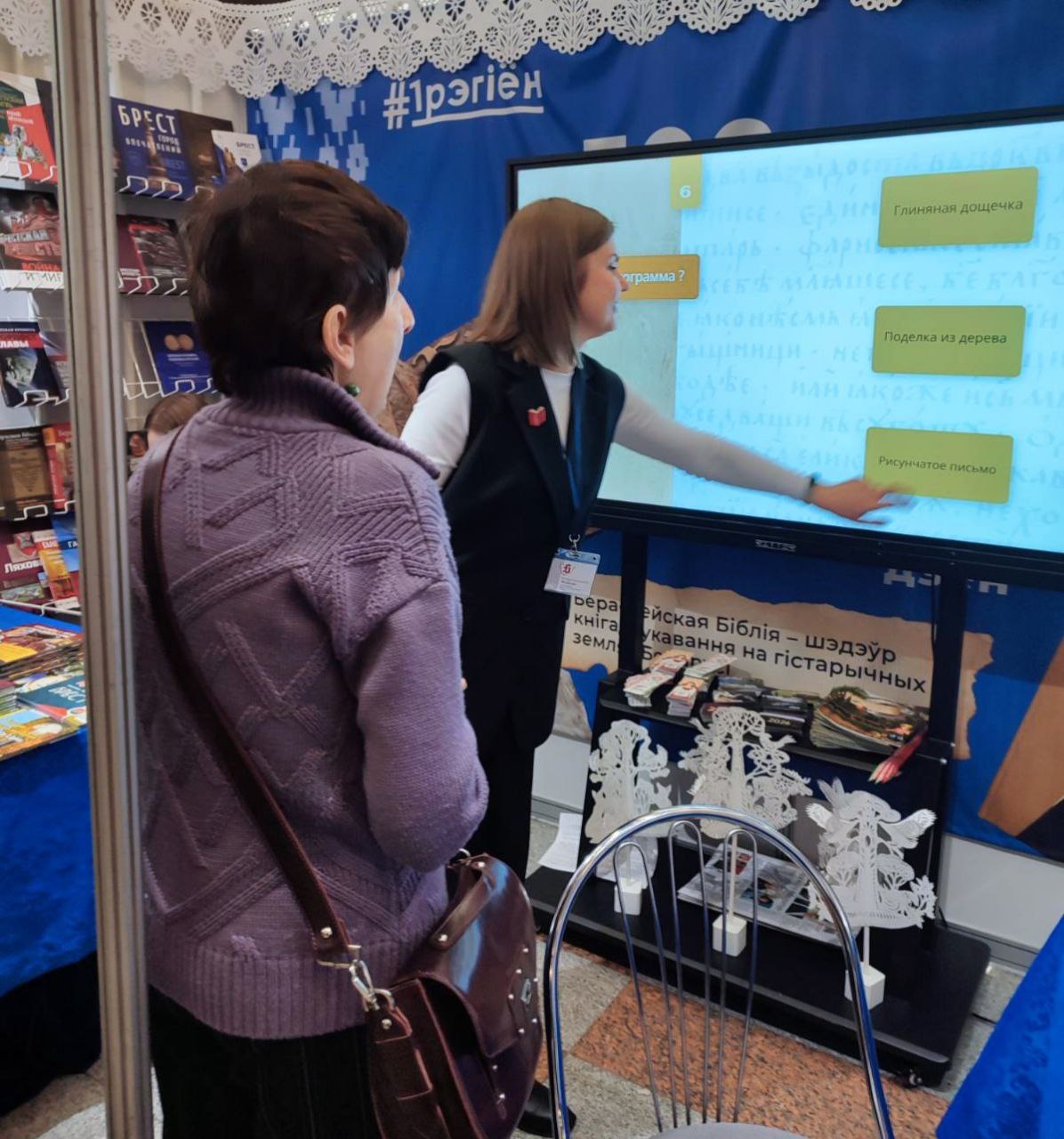 Кроме ознакомления с виртуальными проектами, посетители и гости выставки-ярмарки имели возможность совершить виртуальное путешествие в историю книги: с помощью интерактивных викторин узнать, кто, где и когда создавал рукописные книги, какие материалы и принадлежности использовались, из чего изготавливались чернила и краски, чем украшались текст и фолианты.