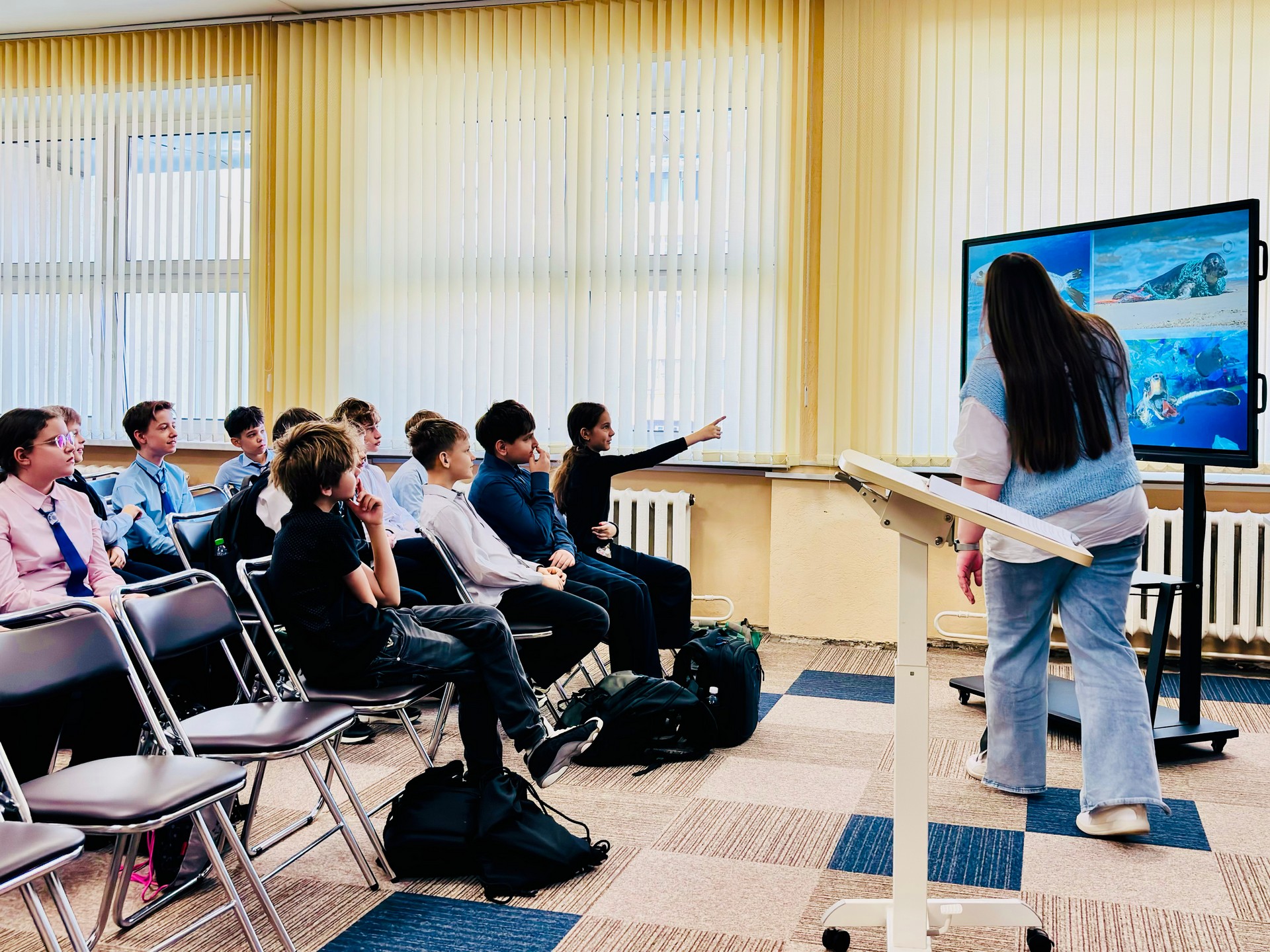 Больше внимание во время занятия было уделено глобальной проблеме загрязнения воды. Школьники узнали, какие виды отходов жизнедеятельности человека наиболее опасны для водоёмов; как загрязнения влияют на здоровье людей и экосистем целых регионов; какие пути решения проблемы существуют и что может сделать каждый из нас. С помощью библиотекаря и учителя дети сформулировали пять серьёзных последствий, которые могут стать нашей реальностью, если мы не изменим свои привычки: