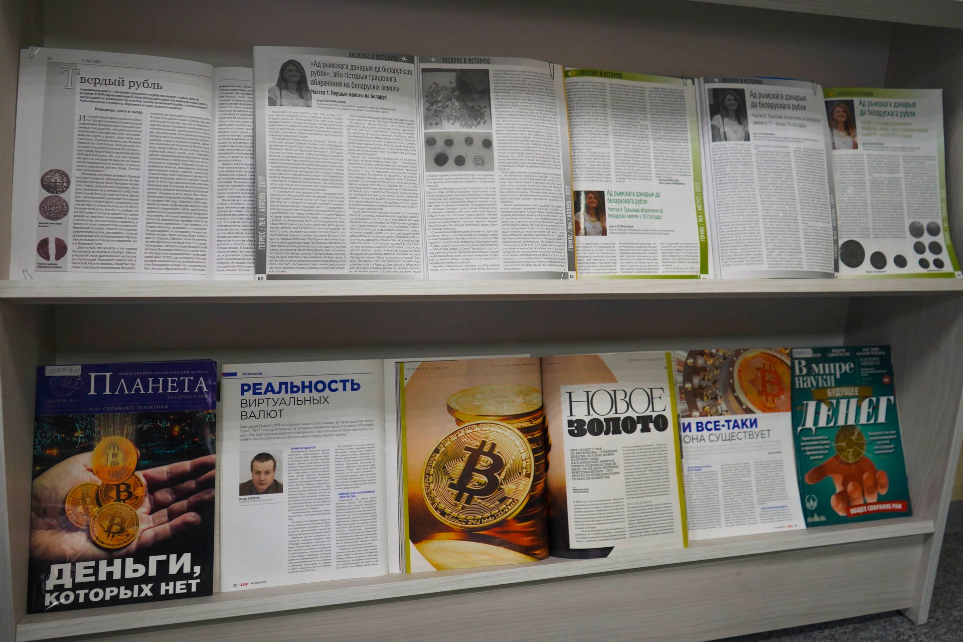 На выставке представлены журнальные публикации, раскрывающие исторические предпосылки возникновения денег, их функции и развитие. Особое внимание уделено истории денежных знаков на территории Беларуси, развитию современной денежной системы и феномену криптовалюты — «денег, которых нет».