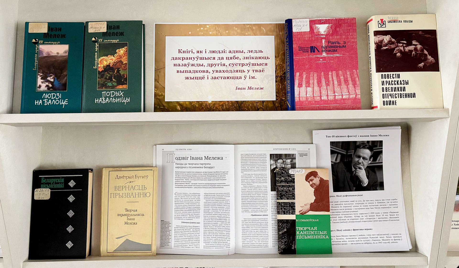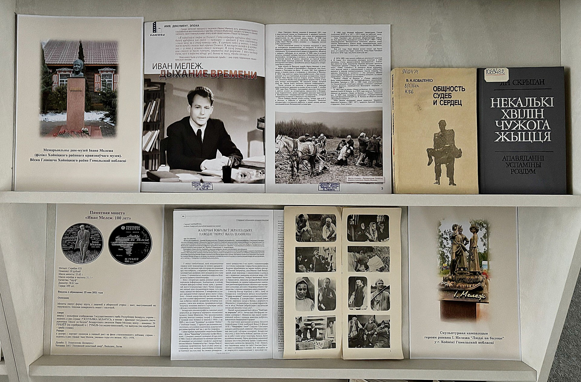 О его творческих замыслах и стилистических поисках можно узнать из материалов, представленных во второй части нашей выставки. Посетителей заинтересуют книги З. В. Дроздовой «Мастерство слова: языково-стилевые особенности "Полесской хроники" Ивана Мележа», Д. Бугаева «Верность призванию: творческая индивидуальность Ивана Мележа», С. Андреюка «Писатели. Книги: литературно-критические статьи». Особый интерес вызывает книга из серии «Жизнь знаменитых людей Беларуси» «Иван Мележ. Певец Полесья». Через воспоминания родственников и друзей, писателей и журналистов, исследователей творческого наследия вырисовывается образ Художника и Человека, который во всём своём художественном величии создал летопись жизни белорусского народа в решающие 30-е годы XX века. Книги Мележа стали подлинной национальной эпопеей, энциклопедией народной жизни, источником воспитания патриотизма и любви к родной земле. Его произведения получили всемирное признание и были переведены на многие языки. Его романы были экранизированы на студии «Беларусьфильм». Под руководством В. Турова и Д. Зайцева по мотивам «Полесской хроники» вышел художественный фильм «Люди на болоте». К. Тесаков написал радиооперу «Багряная заря». Его пьесы были поставлены во многих театрах Беларуси.