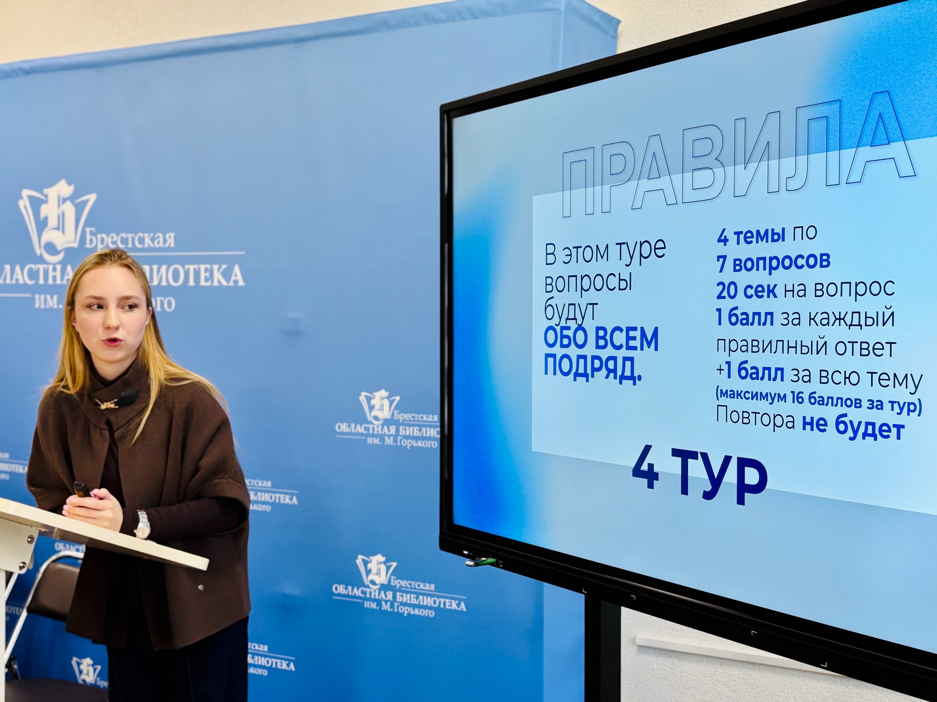 5 февраля 2026 года в Брестской областной библиотеке им. М. Горького состоялся квиз, посвящённый Международному дню эрудита. Мероприятие было организовано совместно с Молодёжным парламентом при Брестском городском Совете депутатов и собрало команды старшеклассников из гимназии № 4 и школ № 5, 13, 15 и 22.