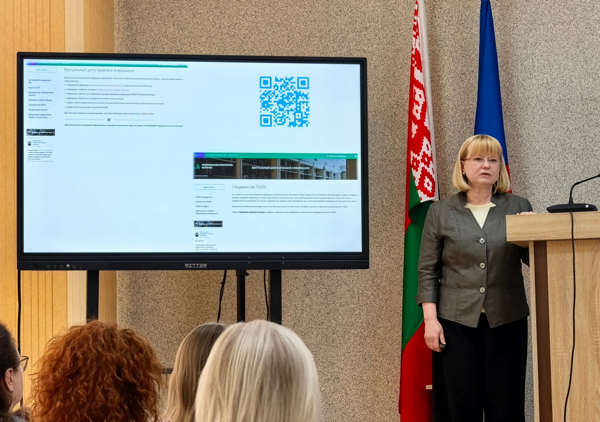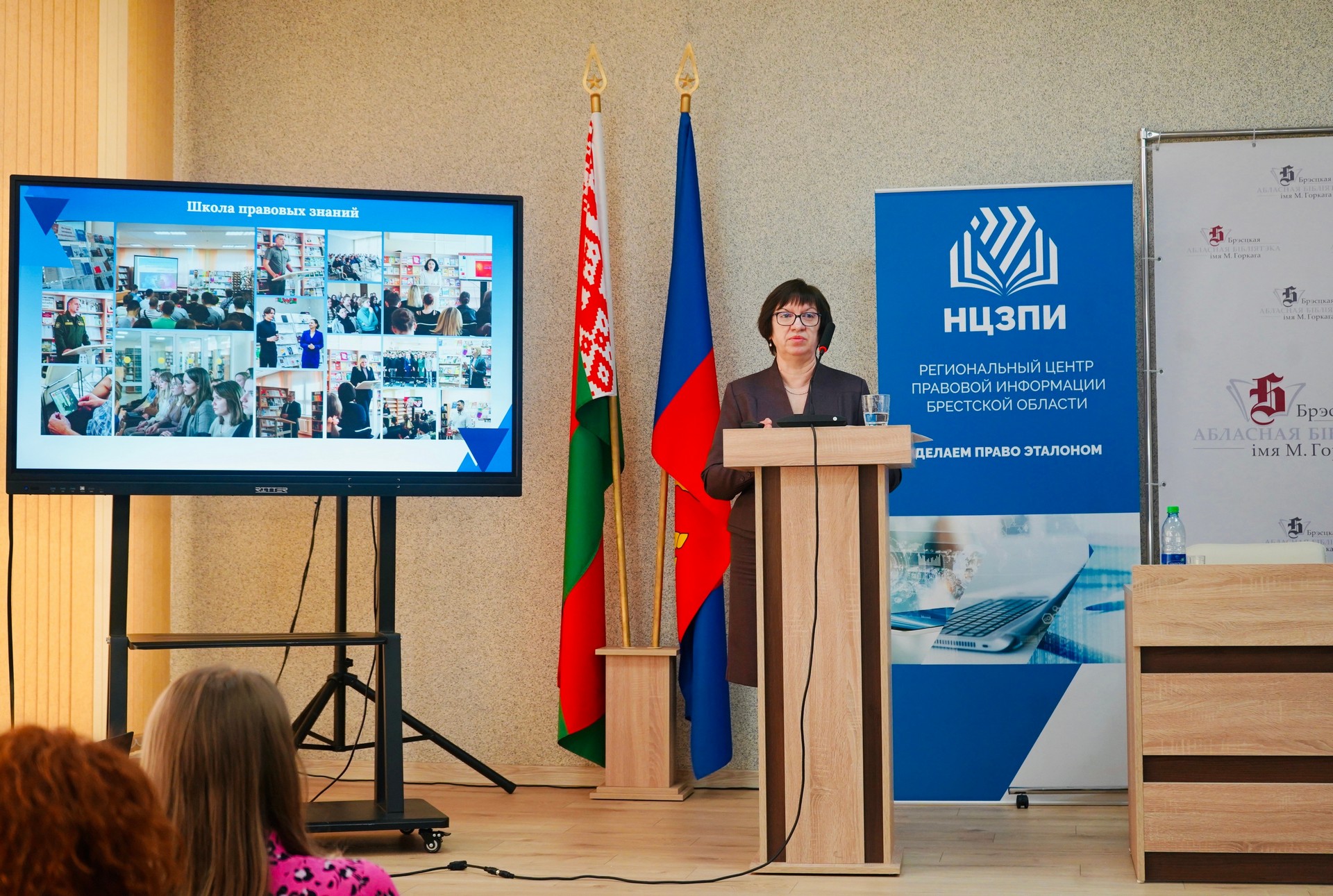 Прадзеіна А. В., галоўны бібліятэкар навукова-даследчага аддзела бібліятэказнаўства НББ, пазнаёміла ўдзельнікаў з вопытам работы НББ па арганізацыі прававой асветы і інфармавання карыстальнікаў, правяла аналіз дзейнасці публічных цэнтраў прававой інфармацыі ў цэлым па рэспубліцы, зрабіўшы акцэнт на ПЦПІ бібліятэк Брэсцкай вобласці.