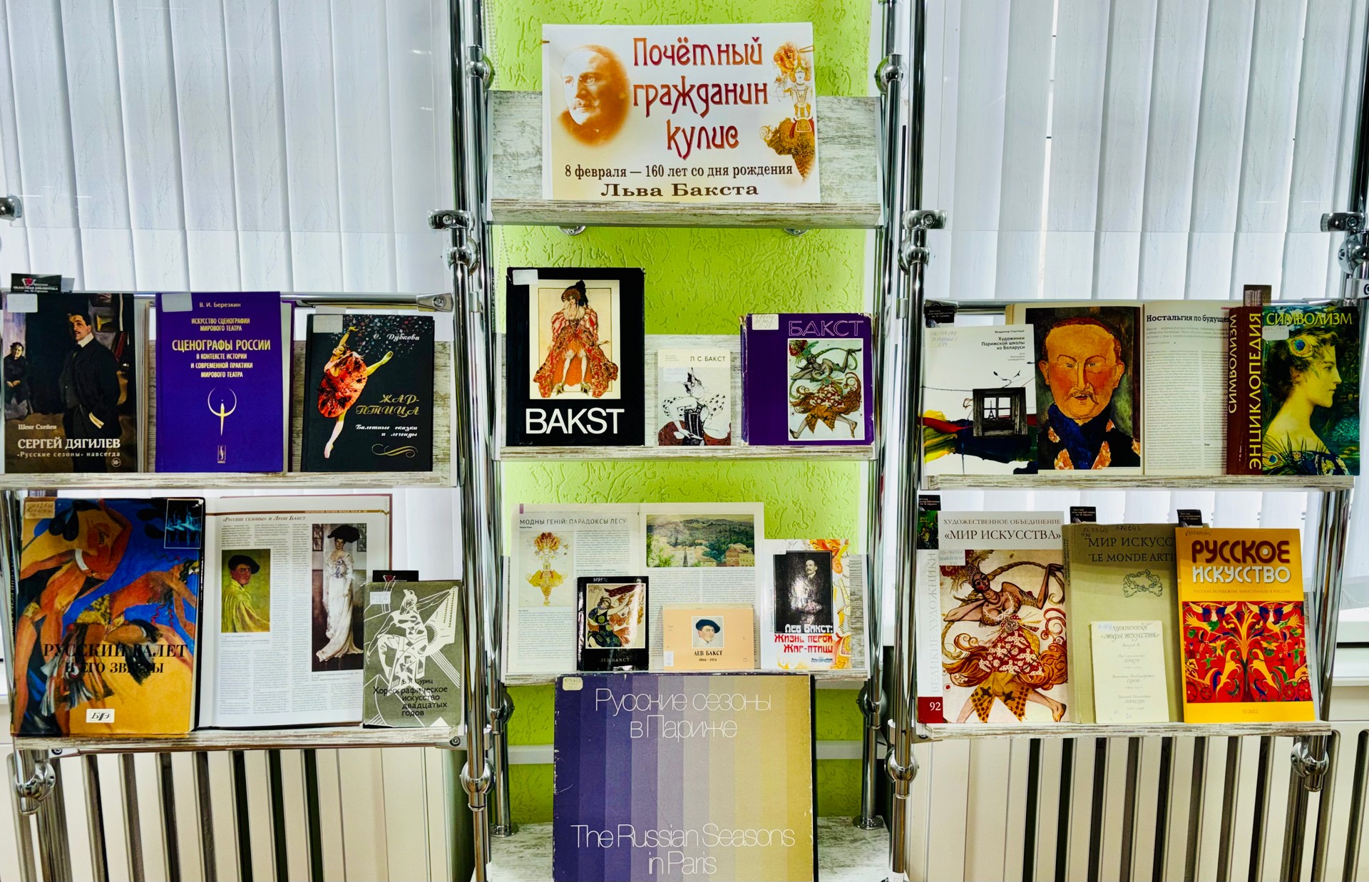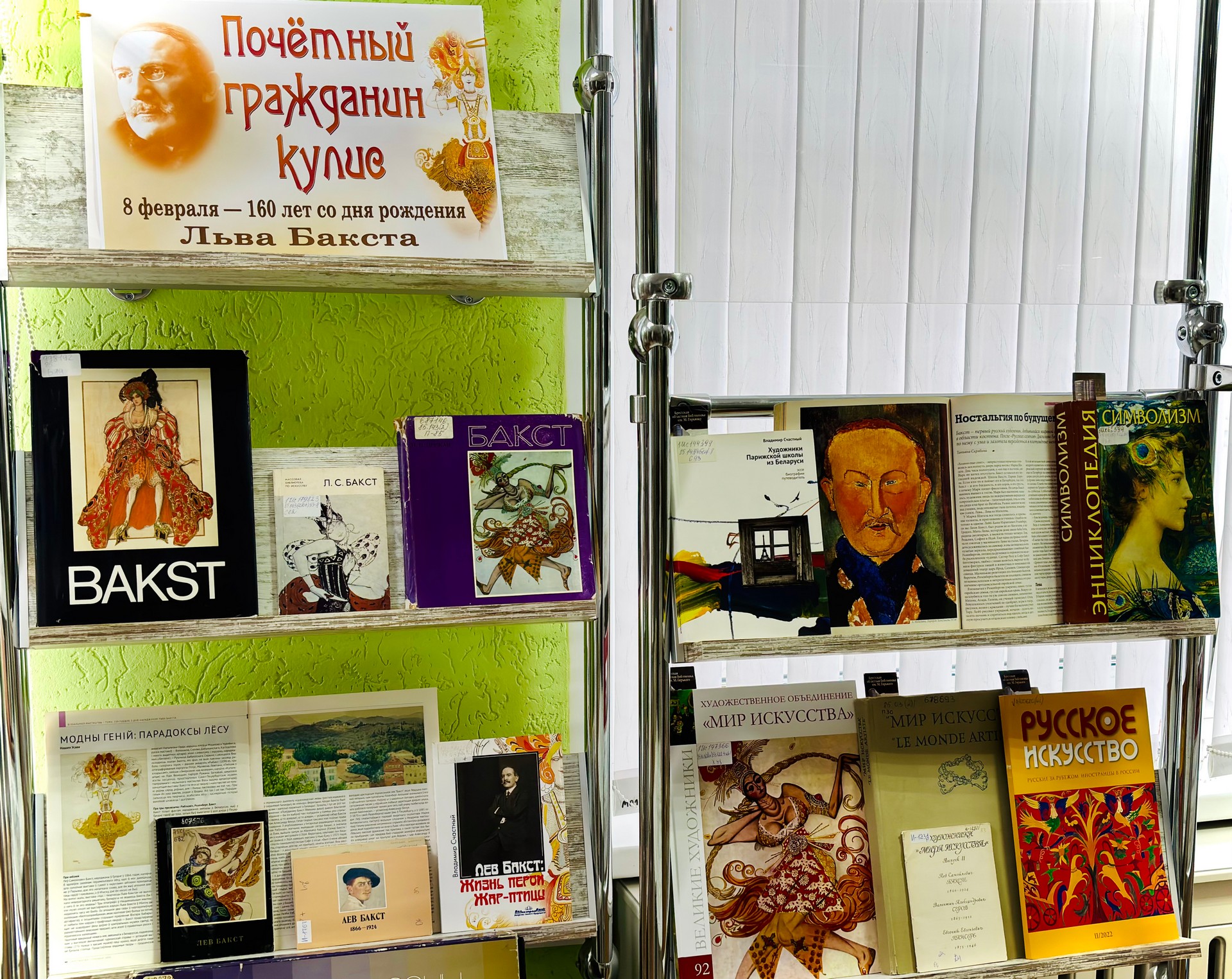З 4 лютага ў сектары літаратуры па мастацтве працуе выстава «Ганаровы грамадзянін куліс», прысвечаная 160-годдзю з дня нараджэння Льва Бакста. Выбітны мастак-сцэнограф, кніжны ілюстратар, майстар станковага жывапісу і тэатральнай графікі, мадэльер Сярэбранага стагоддзя, ураджэнец Гродна (сапраўднае імя Лейб-Хаім Розенберг, у эміграцыі — Леон Бакст) заваяваў сусветнае прызнанне дзякуючы працы над пастаноўкамі для легендарных «Рускіх сезонаў». Мастак пакінуў працы, прасякнутыя духам часу і ўнікальным стылем. У сваім творчым парыве ён спалучаў элементы сімвалізму і мадэрну, не баяўся эксперыментаваць і выкарыстоўваў антычныя і ўсходнія тэмы ў сваіх творах. Яго працы і сёння натхняюць мастакоў ва ўсім свеце. На выставе прадстаўлена каля 50 дакументаў: кнігі, перыядычныя выданні, камплекты паштовак. Звярніце ўвагу на цыкл артыкулаў даследчыка Алены Бяспалавай, які публікаваўся на працягу некалькіх гадоў у часопісе «Русское искусство», які знаёміць чытача з малавядомымі старонкамі творчай біяграфіі мастака.
