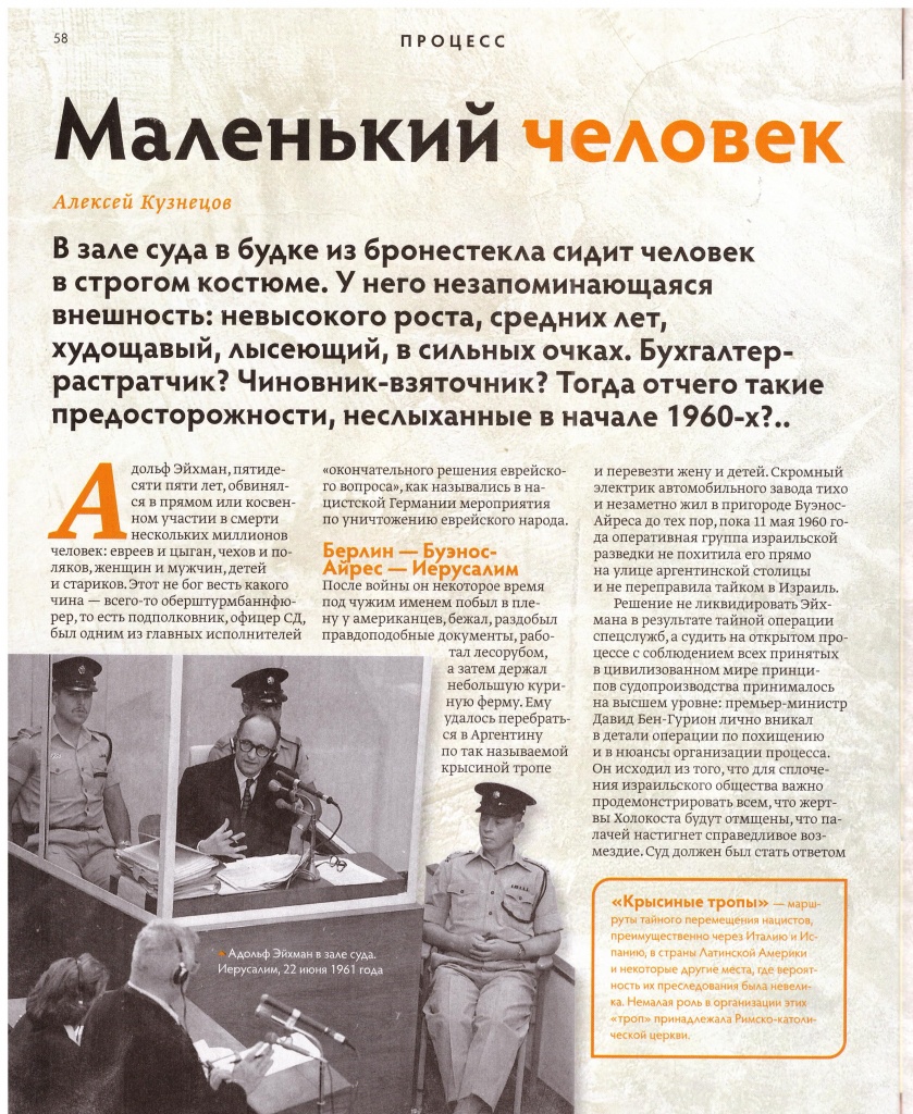 Скромный электрик автомобильного завода тихо и незаметно жил в пригороде Буэнос-Айреса до тех пор, пока 11 мая 1960 года оперативная группа израильской разведки не похитила его прямо на улице аргентинской столицы и не переправила тайком в Израиль. Решение не ликвидировать Эйхмана в результате тайной операции спецслужб, а судить на открытом процессе с соблюдением всех принятых в цивилизованном мире принципов судопроизводства принималось на высшем уровне. Важно было продемонстрировать всем, что жертвы Холокоста будут отмщены, что палачей настигнет справедливое возмездие.