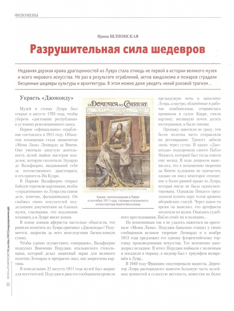 4. Шлионская, И. Разрушительная сила шедевров / Ирина Шлионская // Наука и религия. – 2025. – № 12. – С. 50–55. (Исследования)