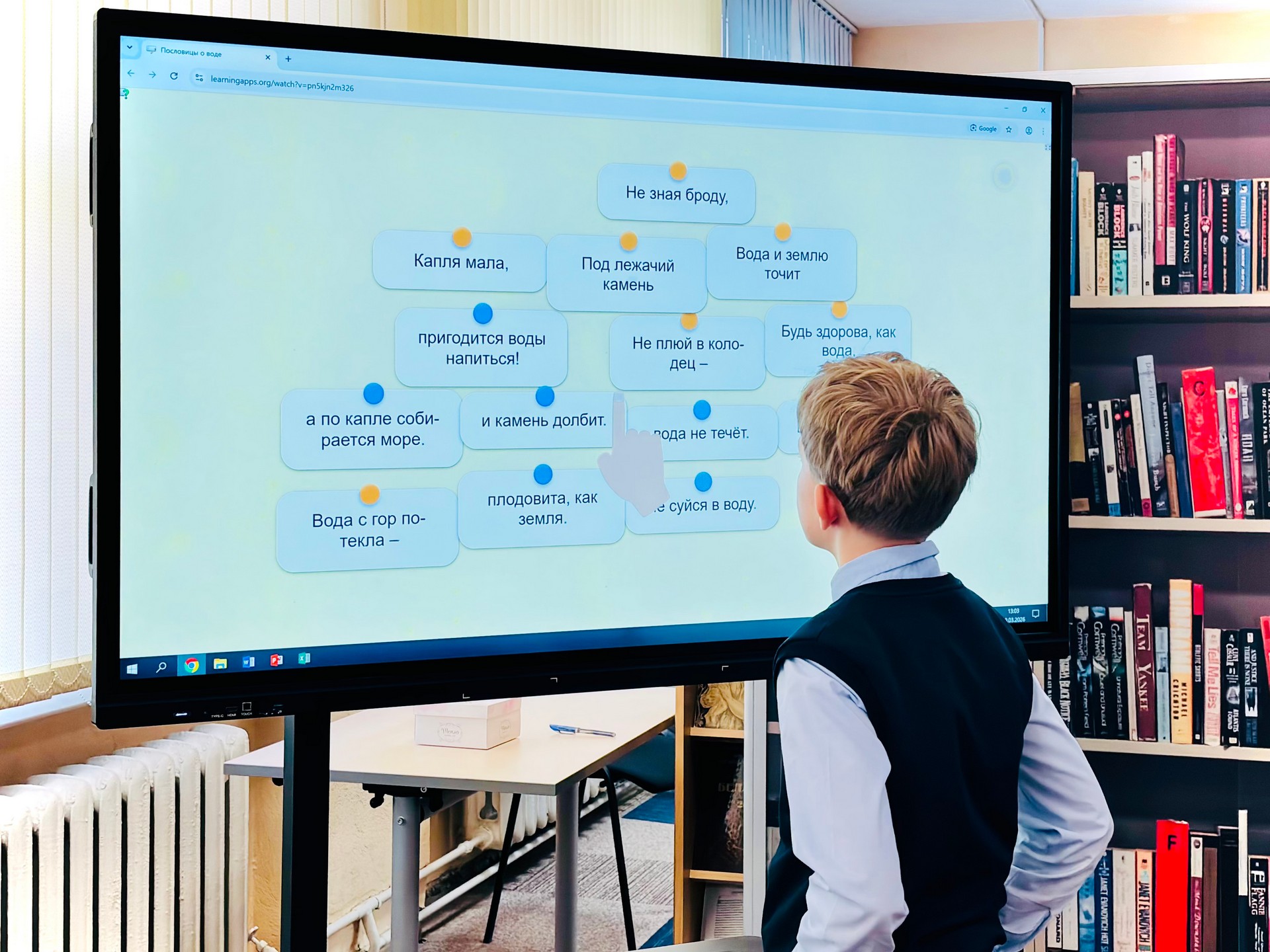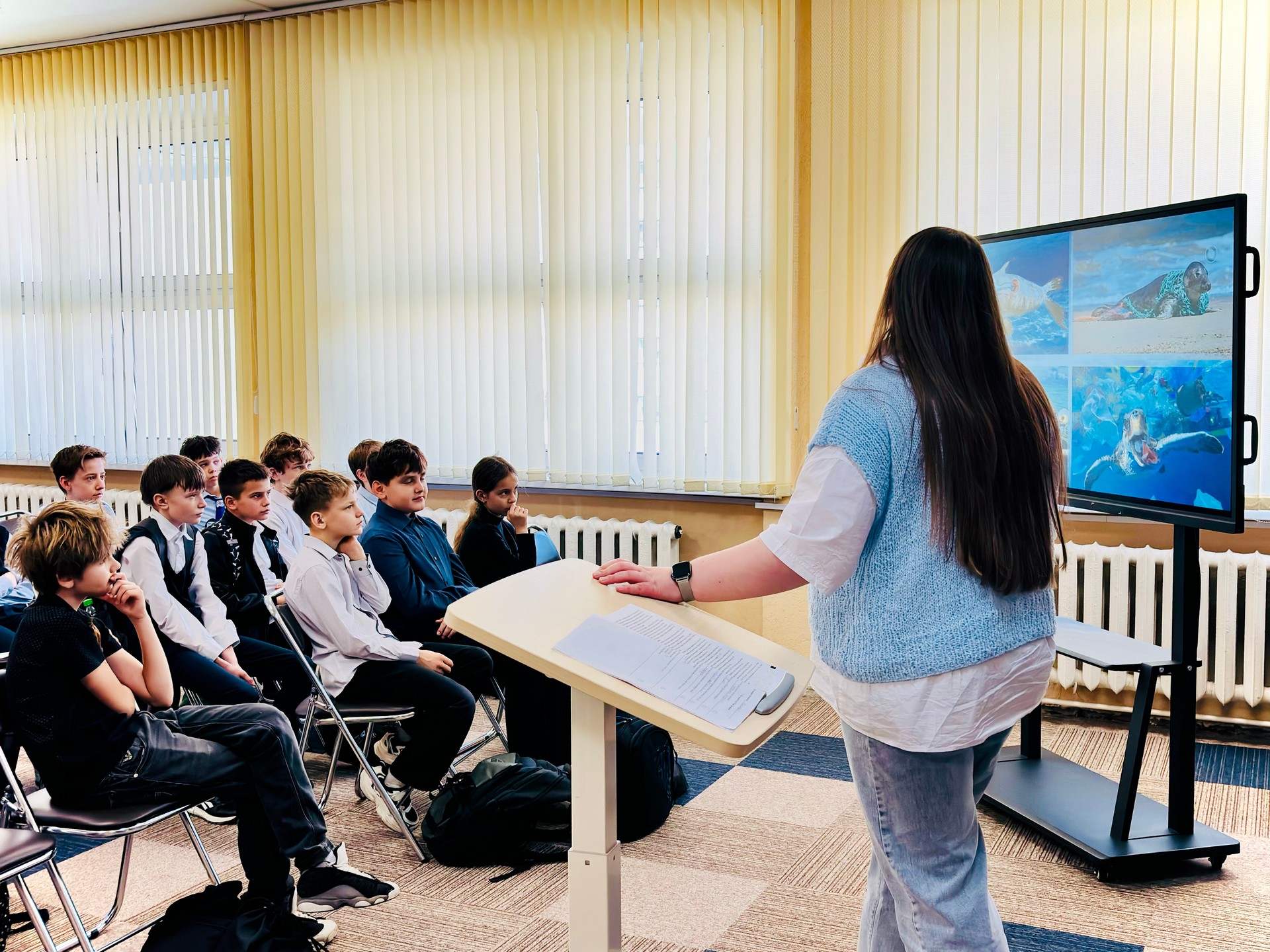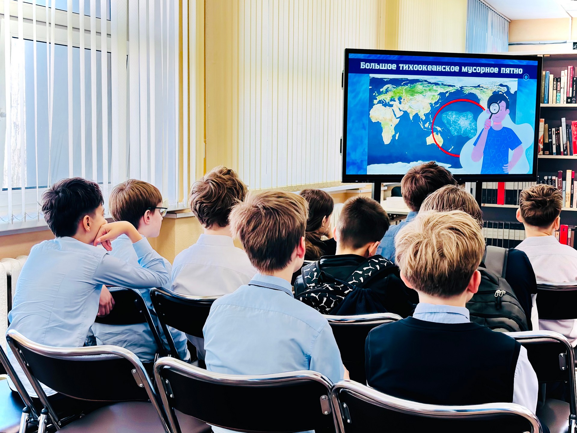 Больше внимание во время занятия было уделено глобальной проблеме загрязнения воды. Школьники узнали, какие виды отходов жизнедеятельности человека наиболее опасны для водоёмов; как загрязнения влияют на здоровье людей и экосистем целых регионов; какие пути решения проблемы существуют и что может сделать каждый из нас. С помощью библиотекаря и учителя дети сформулировали пять серьёзных последствий, которые могут стать нашей реальностью, если мы не изменим свои привычки: