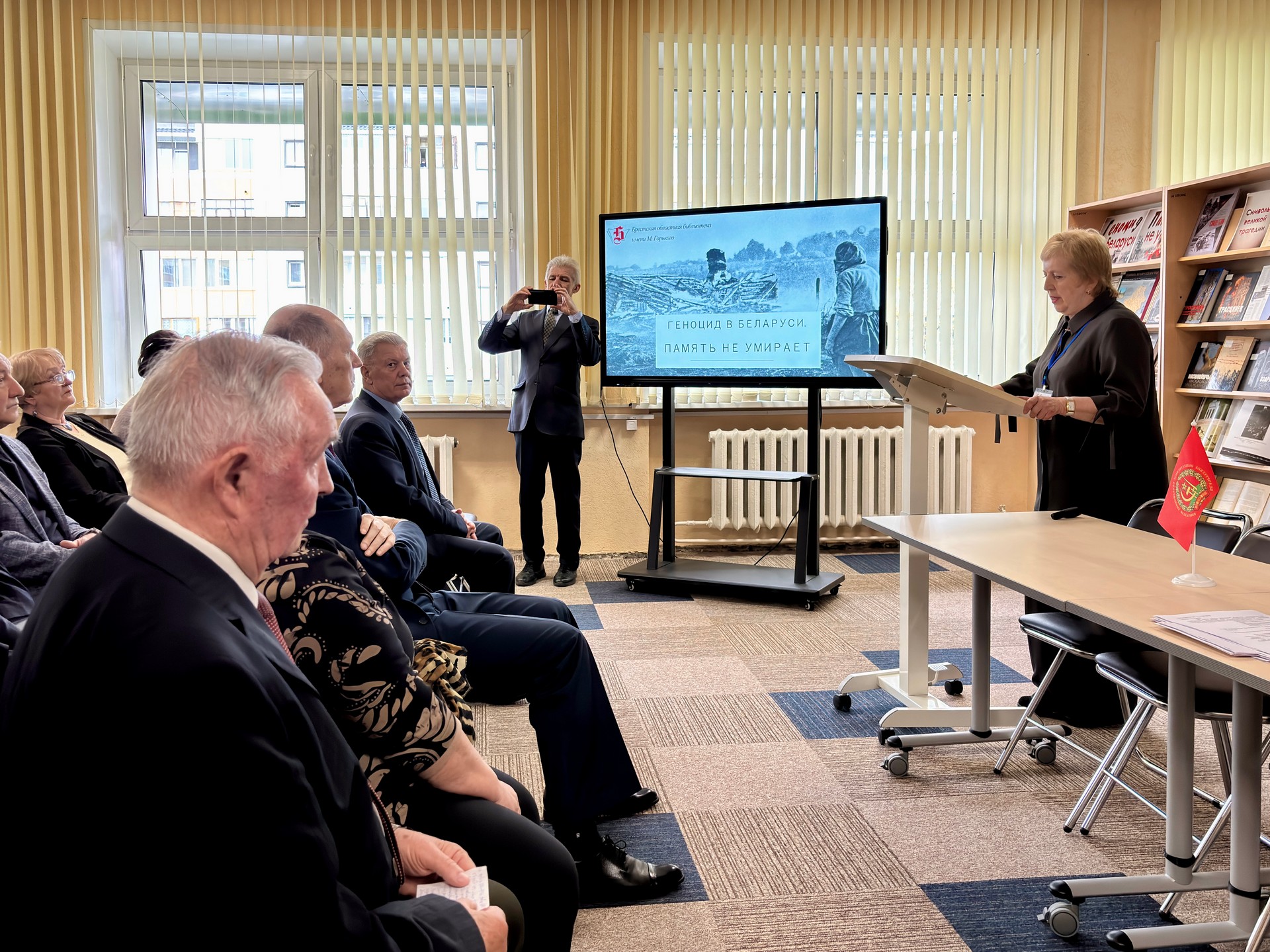 Заведующий общим читальным залом Тамара Васильевна Глазкова представила выставку литературы «Геноцид в Беларуси: память не умирает». Экспозиция включила документальные, научные, научно-популярные издания о геноциде белорусского народа, структурно представленные 3-мя разделами: «Сущность нацистской политики геноцида в Беларуси в 1941–1944 гг.», «Символы великой трагедии», «Храним память вместе». В ходе выступления особый акцент был сделан на изданиях редкого фонда: «Лагери смерти» 1944 года издания, «Зверства немецко-фашистских захватчиков» 1945 года. Также присутствующим были представлены книги из цикла «Геноцид белорусского народа», «Без срока давности», серии «Беларусь: трагедия и правда памяти». Среди новинок литературы интерес вызвали книги И. Марзалюка «Кроў на белым тле: беларускія калабарацыяністы ў часы акупацыі» (Минск, 2025), «Красный Берег — символ трагедии и скорби» (Минск, 2025).