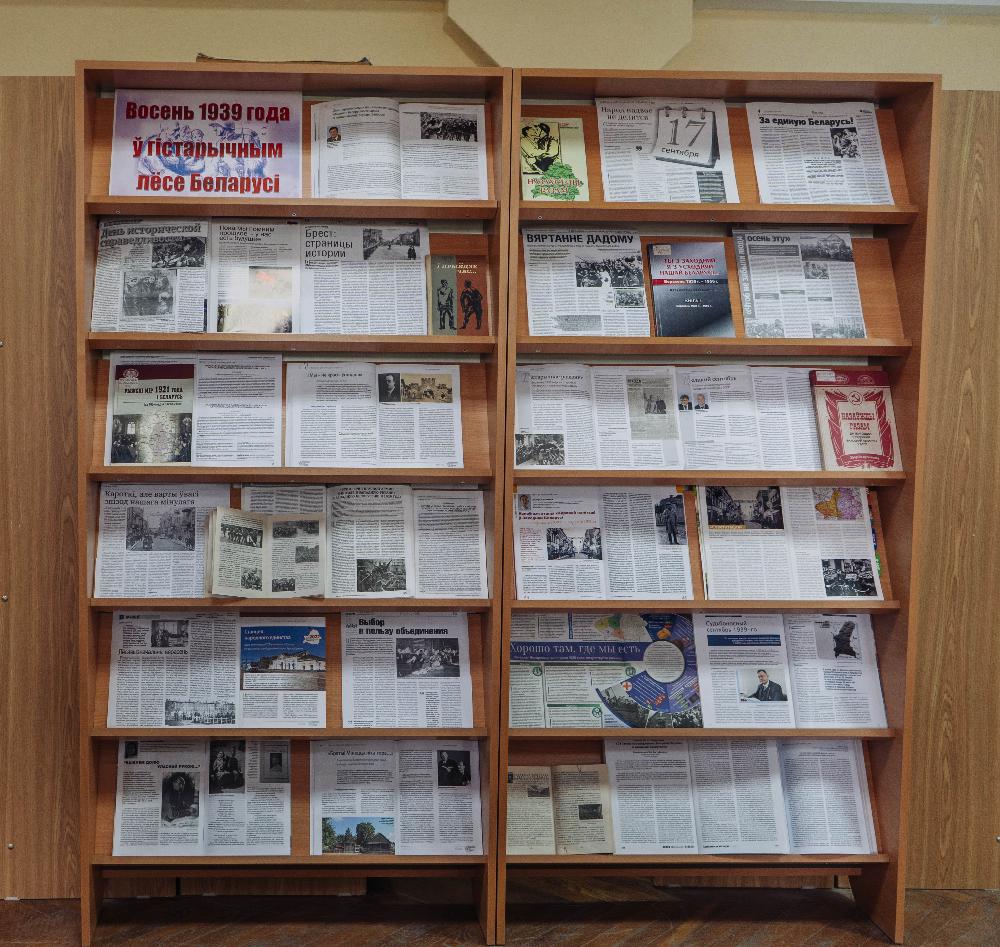 С 9 сентября по 6 октября 2024 г. в отделе периодических изданий Брестской областной библиотеки им. М. Горького экспонируется выставка «Восень 1939 года ў гістарычным лесё Беларусі», приуроченная к 85-летию воссоединения Западной Беларуси с БССР.