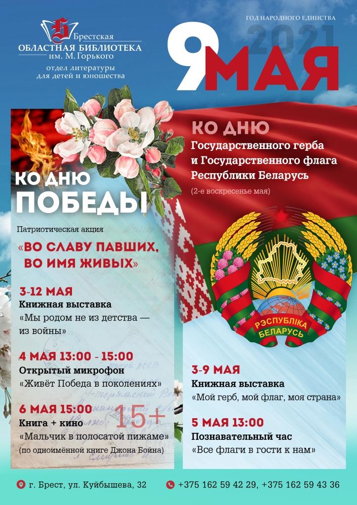 В этом году День Победы совпадает с Днём Государственного герба и Государственного флага Республики Беларусь, который празднуется каждое 2-е воскресенье мая. Для читателей младшего школьного возраста в отделе литературы для детей и юношества 5 мая в 13:00 состоится познавательный час «Все флаги в гости к нам». С 3 по 9 мая можно ознакомиться с книжной выставкой «Мой герб, мой флаг, моя страна».