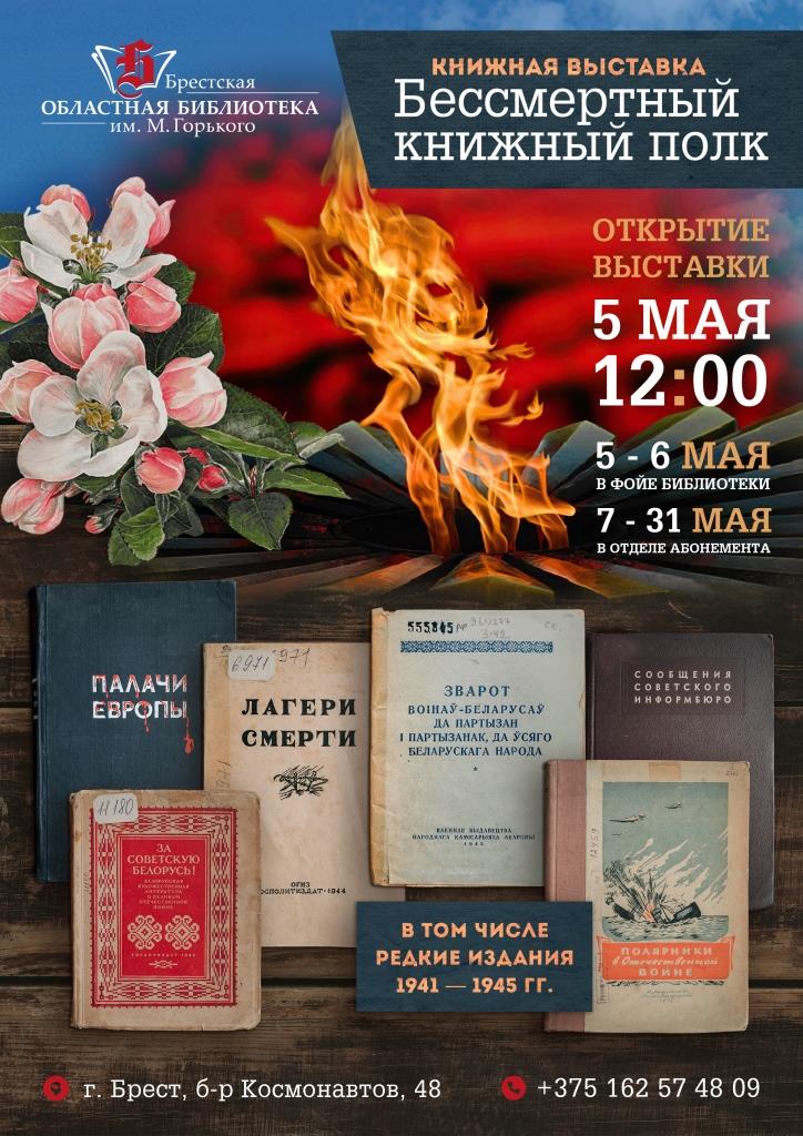 5 и 6 мая в 12:00 в фойе библиотеки для читателей и всех заинтересованных будет презентована масштабная книжная выставка «Бессмертный книжный полк». На ней представлена лучшая документальная, мемуарная и художественная литература о Великой Отечественной войне из фондов библиотеки. Наибольший интерес вызывают книги, изданные в период с 1941 по 1945 г., исключительные по своему содержанию, оформлению, тиражам и востребованности. Это сборники сообщений Советского Информбюро (Госполитиздат, 1944–1945), «Зварот воінаў-беларусаў да партызан і партызанак, да ўсяго беларускага народа» (Воениздат, 1943), поэма Аркадия Кулешова «Прыгоды цымбал» («Художественная литература», 1945) и повесть Алеся Стаховича «Шумяць лясы» («Художественная литература», 1944), посвящённые белорусским партизанам и др.