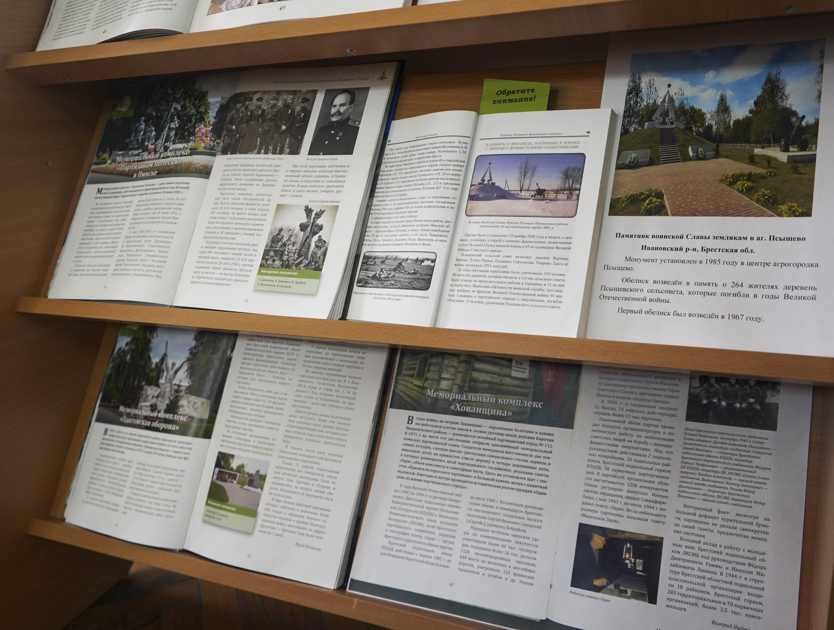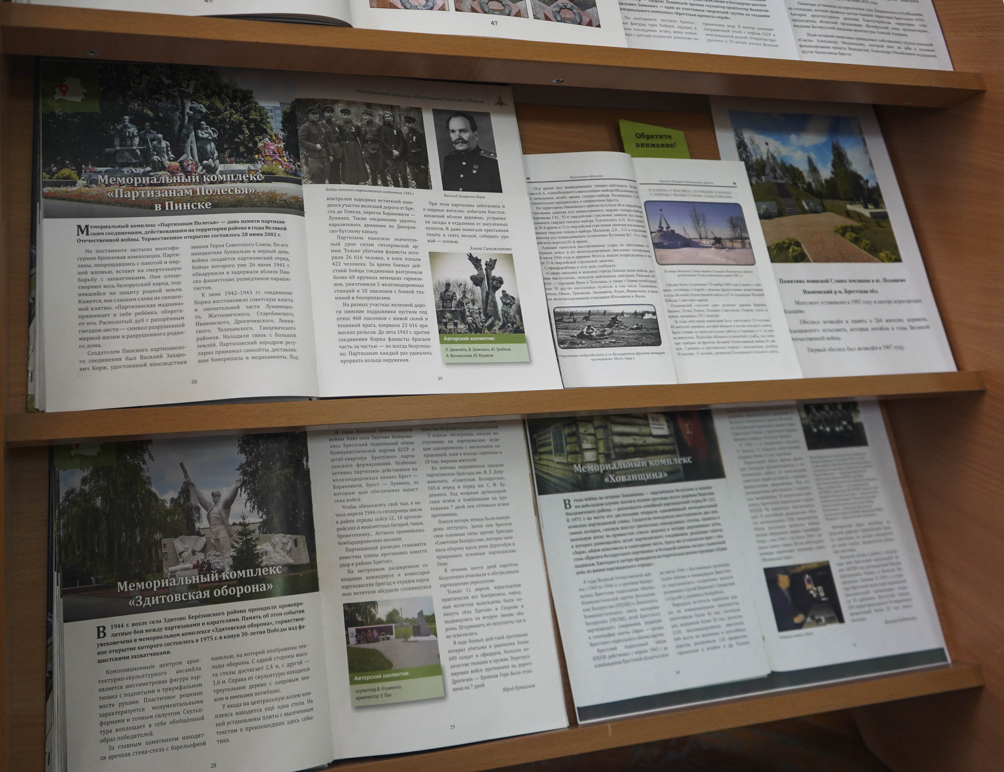На выставе прадстаўлены матэрыялы аб мемарыяльных комплексах воінскай славы Брэсцкай вобласці: «Брэсцкая крэпасць-герой», якая першай прыняла бой і больш за месяц змагалася з нямецкімі акупантамі; «Героям — вартавым межаў», «Партызанам Палесся», «Вызваліцелям Пінска», «Здзітаўская абарона», «Хаваншчына» і інш.