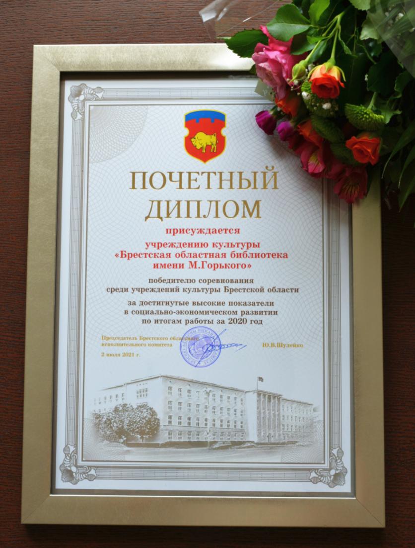 Решением № 358 Брестского областного исполнительного комитета от 17 июня 2021 г. победителем соревнования за достижение в 2020 году наилучших результатов в выполнении основных целевых показателей прогноза социально-экономического развития среди учреждений культуры признана Брестская областная библиотека им. М. Горького. Учреждение удостоено занесения на областную Доску почёта.