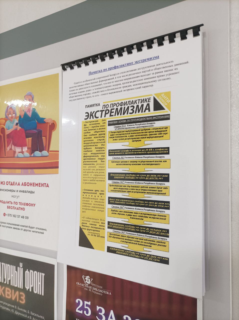 У рамках Адзінага дня бяспекі ў Брэсцкай абласной бібліятэцы імя М. Горкага адбылася сустрэча калектыва з участковым інспектарам, старшым лейтэнантам міліцыі Мікалаем Васільевічам Раманчуком. Мікалай Васільевіч расказаў аб асноўных палажэннях Закона Рэспублікі Беларусь аб супрацьдзеянні экстрэмізму і нагадаў аб адказнасці за распаўсюджванне экстрэмісцкіх матэрыялаў. У нашай бібліятэцы памятка па прафілактыцы экстрэмізму знаходзіцца ў адкрытым доступе — яна размешчана на інфармацыйным стэндзе ў фае першага паверха.