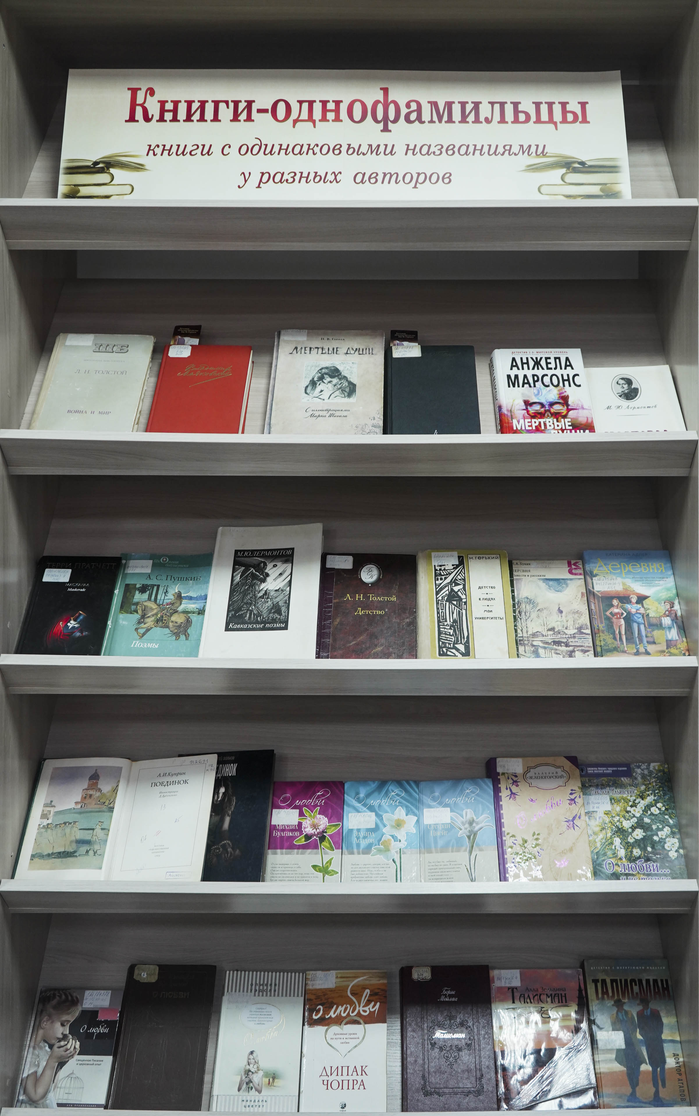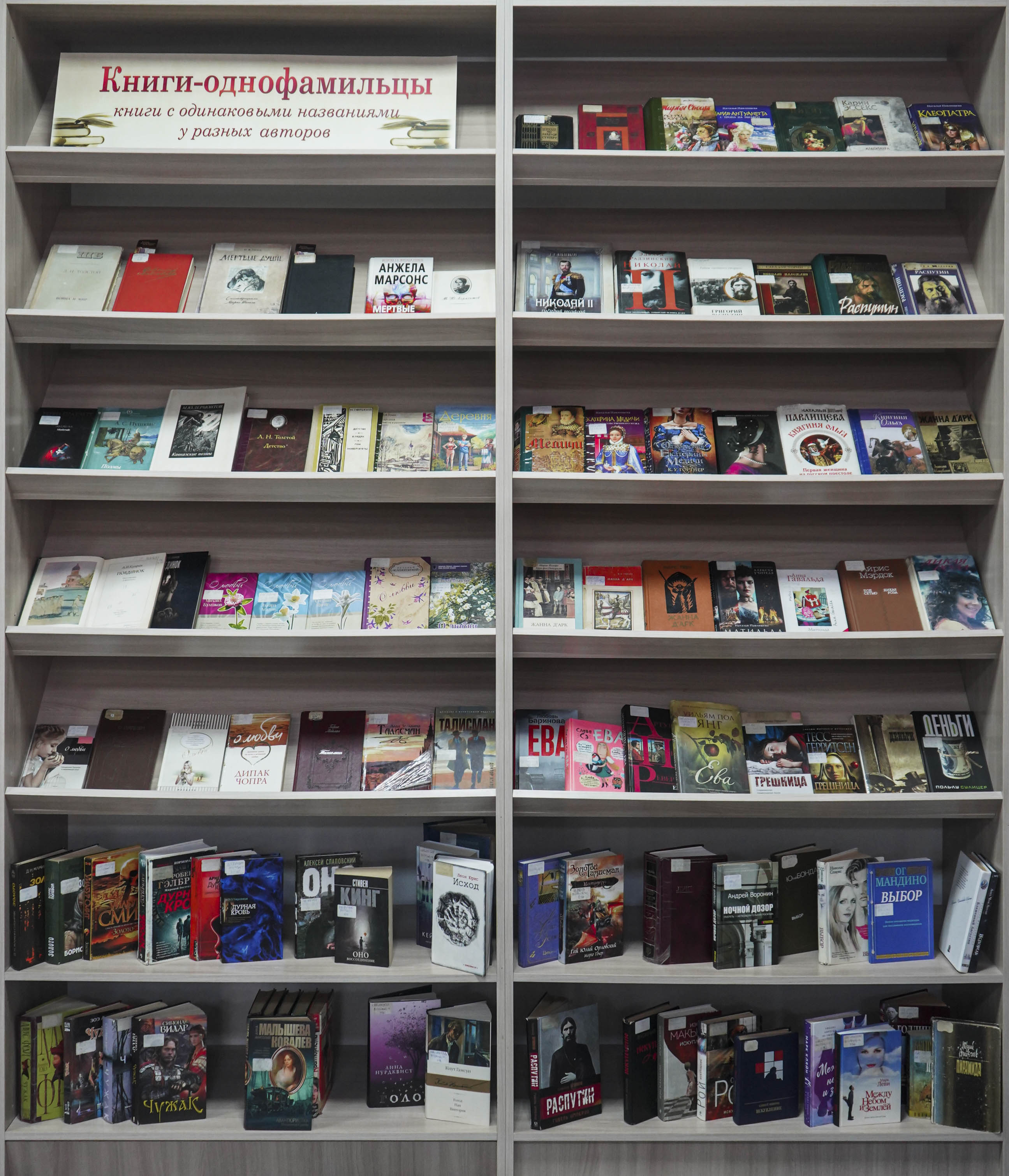 Аказваецца, такіх кніг шмат! Многія назвы твораў айчынных пісьменнікаў пераклікаюцца з назвамі кніг замежных аўтараў. Напрыклад, раман «залатога класіка» французскай літаратуры Антуана дэ Сэнт-Экзюперы «Цытадэль» і фантастычны твор Гая Юлія Арлоўскага «Цытадэль». Гэта кнігі зусім розных жанраў, розныя па змесце, але з аднолькавай назвай вартыя вашай увагі. Так, авантурна-дэтэктыўны раман сучаснай пісьменніцы Кацярыны Адлер «Вёска» з серыі «Раманы Рунэту» і класічны твор Івана Буніна «Вёска» акунуць вас у мінулае і сучаснасць сельскіх жыхароў. Супадзенні — у дадзеным выпадку ў назвах кніг — заўсёды выклікаюць цікавасць. Кніга пад назвай «Ева» ёсць у амерыканскага пісьменніка Уільяма Пола Янга, латвійскага пісьменніка Славы Сэ, сучаснага іспанскага празаіка Артура Перэс-Рэвертэ. Таксама «Ева» — гэта дэбютны раман масквічкі Любові Барынавай. Знаёмае нам з гісторыі імя Жаны д'Арк прадстаўлена ў раманах пісьменнікаў Марка Твена, Менгеле Ёзэфа, Крука фон Патурцына, а таксама гісторыкаў Анатоля Левандоўскага і Уладзіміра Райцеса. Назва «Пра каханне» мае дзевяць кніг-цёзак! Гэта зборнік паэта Эдуарда Асадава, кнігі псіхолага Дзіпака Чопры, аўстрыйскага пісьменніка Стэфана Цвейга, англійскай журналісткі і пісьменніцы Алівіі Уэдслі, рускіх празаікаў Міхаіла Булгакава, Леаніда Жухавіцкага, Валерыя Зеленагорскага, беларускага паэта Мікалая Ільінскага і зборніка.