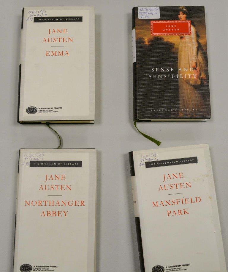 На выставе прадстаўлены як творы самой пісьменніцы, так і кнігі і артыкулы пра яе, яе жыццё і творчасць. Раздзел, у якім прадстаўлены творы Джэйн Осцін, знаёміць з арыгіналамі на англійскай мове, якія выйшлі ў знакамітай брытанскай серыі «The Millenium Library». Сярод іх самыя вядомыя творы: «Розум і пачуцці» («Sense and Sensibility»), «Гонар і прадузятасць» («Pride and Prejudice»), «Мэнсфілдскі парк» («Mansfield Park»), «Довады розуму» («Persuasion»), «Сэндзітон і іншыя апавяданні» («Sanditon and other stories»), «Эма» («Emma»). Прапануюцца таксама пераклады Джэйн Осцін на рускую і польскую мовы. Для чытачоў, якія толькі вучацца чытаць па-англійску, прапанаваны творы пісьменніцы ў кнігах для чытання, забяспечаных слоўнікам і каментарыямі.