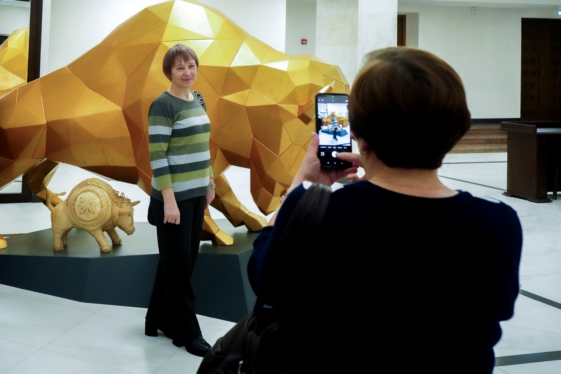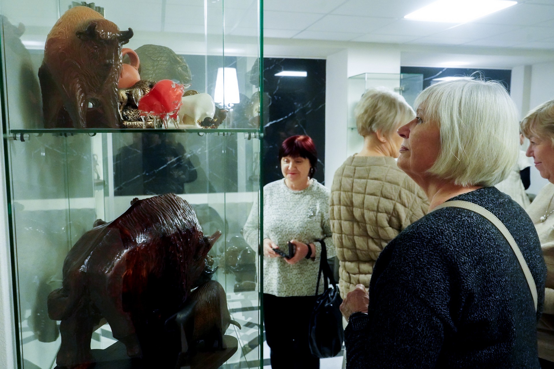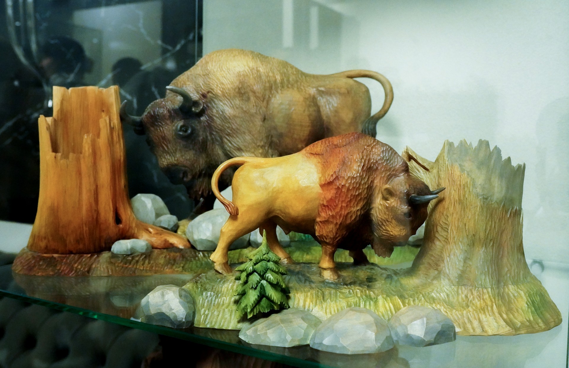 У Музеі зубра сабрана больш за 300 экспанатаў: ад мініяцюрных фігурак (самая маленькая — усяго 1 см!) да маштабных мастацкіх работ. Кожны зубр унікальны і непаўторны, некаторыя фігуры выкананы з незвычайных матэрыялаў: дуба, які праляжаў стагоддзі ў палескіх балотах, лёну, шкла і нават бурштыну. Ёсць зубр нават з пластыліну. Большасць экспанатаў — гэта дары ад замежных дэлегацый, калектываў прадпрыемстваў і творчых майстроў.