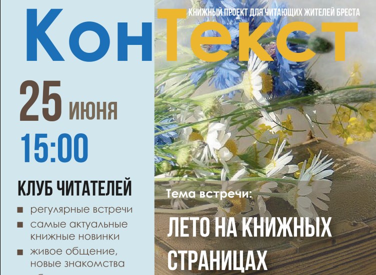 Лета — дзіўная і выдатная пара адпачынку, сонца, прыемных сустрэч і ўражанняў. 25 чэрвеня ўдзельнікі чытацкага клуба «КонТекст» вырашылі прысвяціць сустрэчу гэтай тэматыцы. «Лето на книжных страницах» — менавіта так гучала агульная назва пасяджэння.