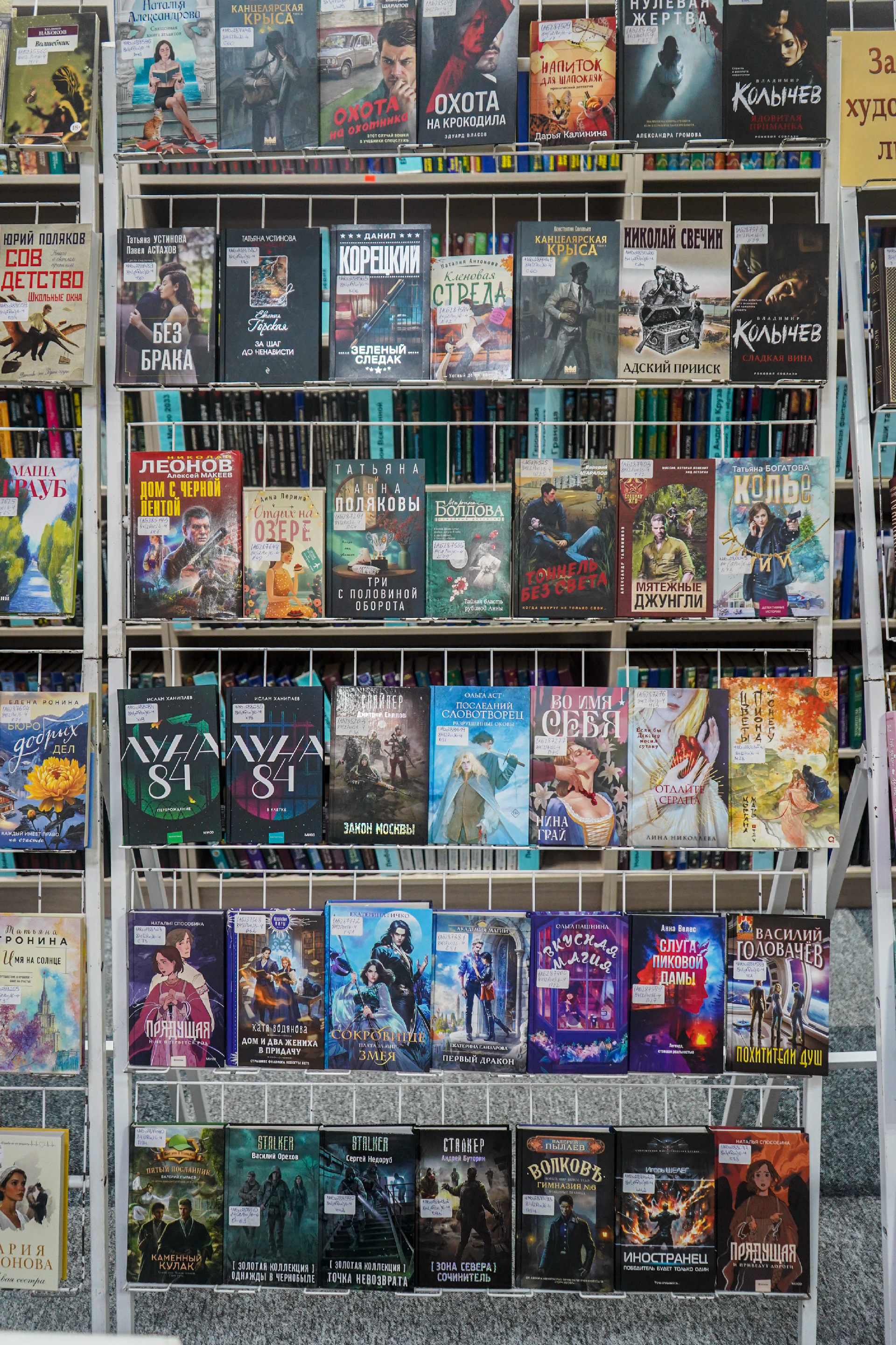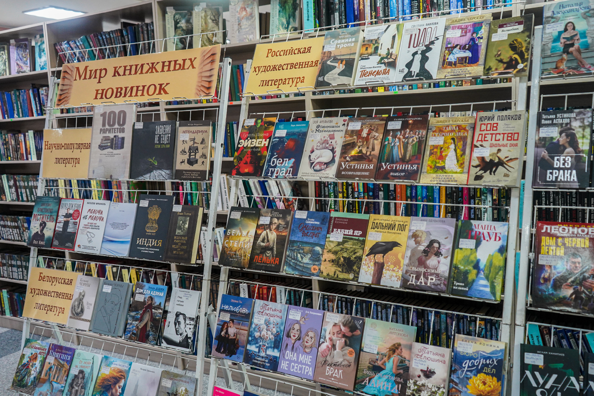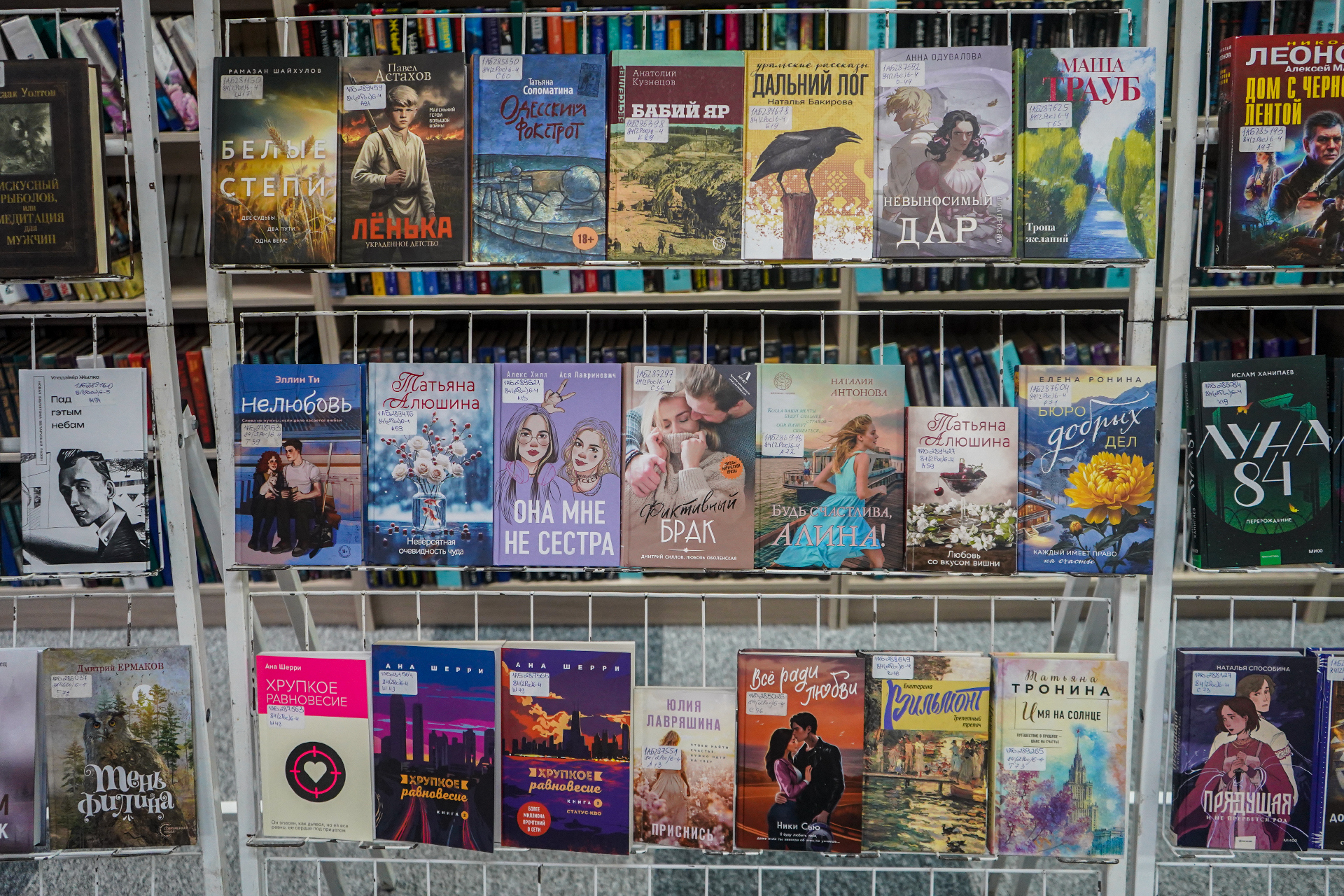 На выставе таксама экспануюцца кнігі: П. Астахаў «Лёнька. Украденное детство» (Масква, 2025) — гэта гісторыя рускага хлопчыка Алёшы, якому споўнілася дзевяць гадоў, калі пачалася Вялікая Айчынная вайна і ў родную вёску на Смаленшчыне ўступілі першыя калоны нямецкіх салдат (раман заснаваны на дакументальным матэрыяле, гістарычных фактах і, вядома, на жывых успамінах галоўнага героя гэтай кнігі — Аляксея Астахава); А. Міхалкова «Что дальше, миссис Норидж?» — новы зборнік апавяданняў, прысвечаных расследаванню ангельскай гувернанткі Эмы Норыдж; К. Качур «Ген Рафаила» (Масква, 2025); А. Гош «Дымная река» (Масква, 2023) і «Огненный поток» (Масква, 2024) — другая і трэцяя (фінальная) часткі «Ибисной трилогии»; Д. Карызі «Воспитание бабочек» (Санкт-Пецярбург, 2025) (Упершыню на рускай!) — жудасная, гіпнатычная гісторыя падарожжа адной жанчыны, якая адправілася на пошукі зніклага дзіцяці; Ж. Дзікер «Дикий зверь» (Масква, 2025) — захапляльны псіхалагічны трылер з дэтэктыўнай інтрыгай; С. Рушдзі «Кишот» (Масква, 2025); Дж. Клавел «Благородный дом: роман о Гонконге» (Масква, 2025) і «Ураган» (Масква, 2024) — раман, які завяршае «Азиатскую сагу» Клавела.