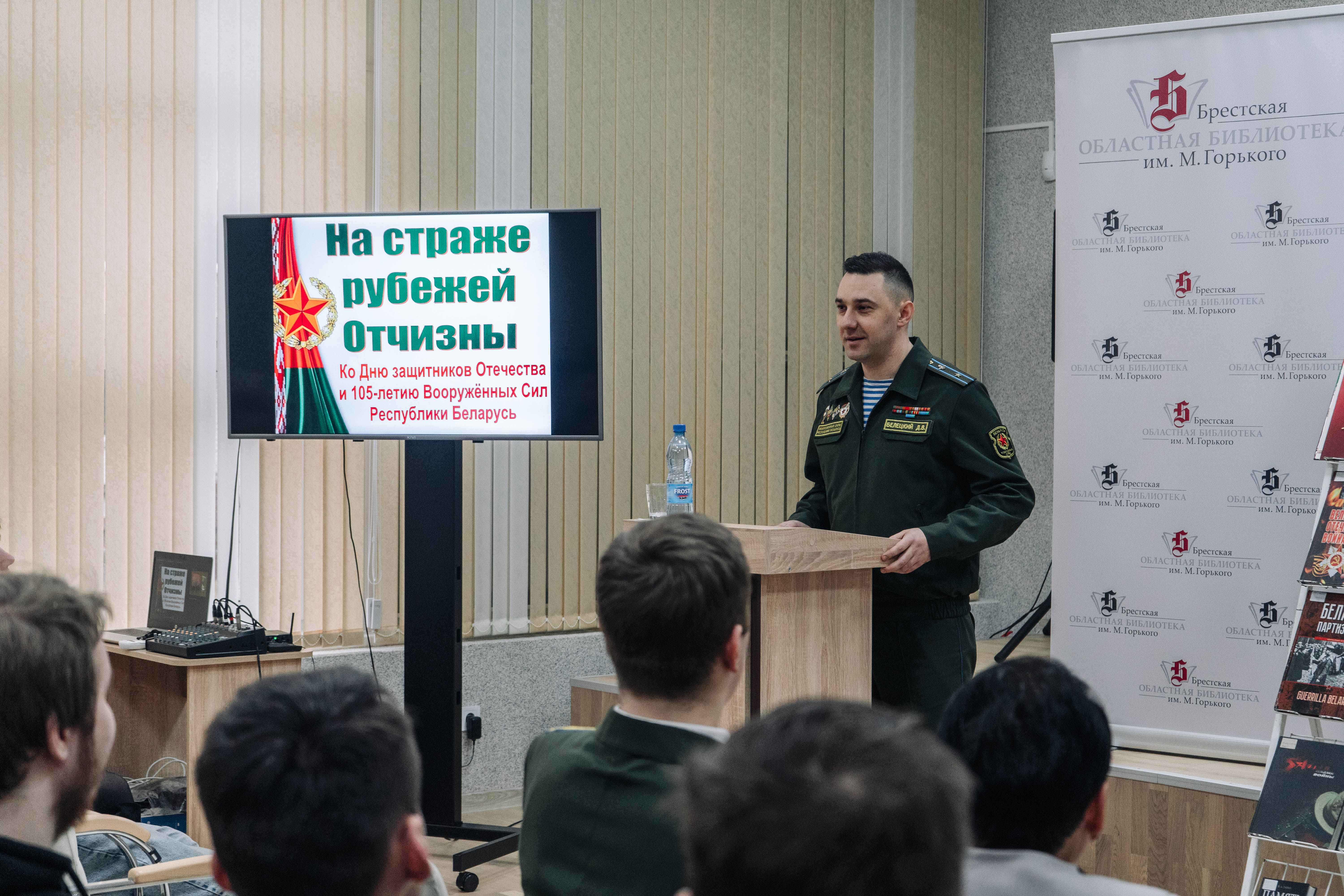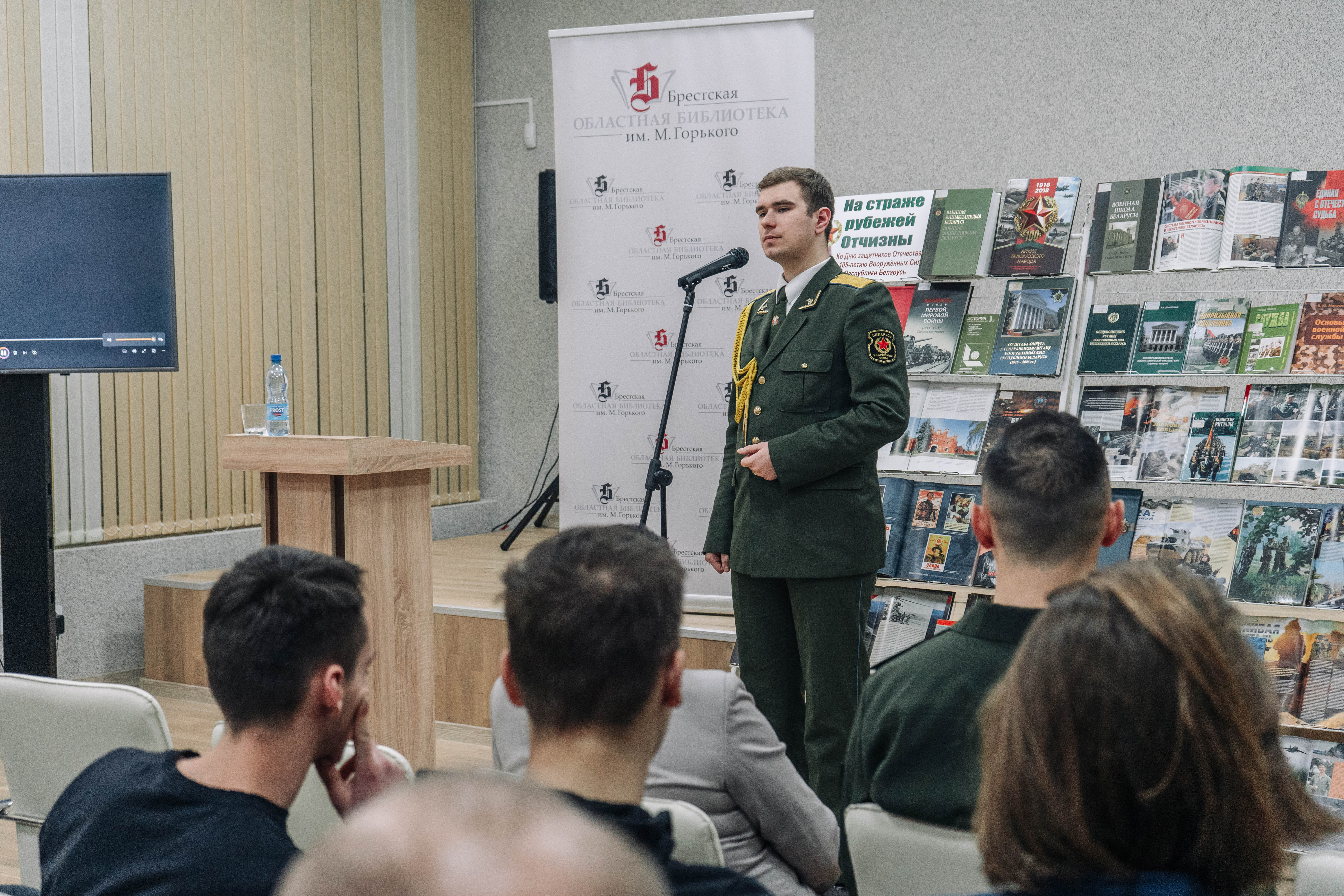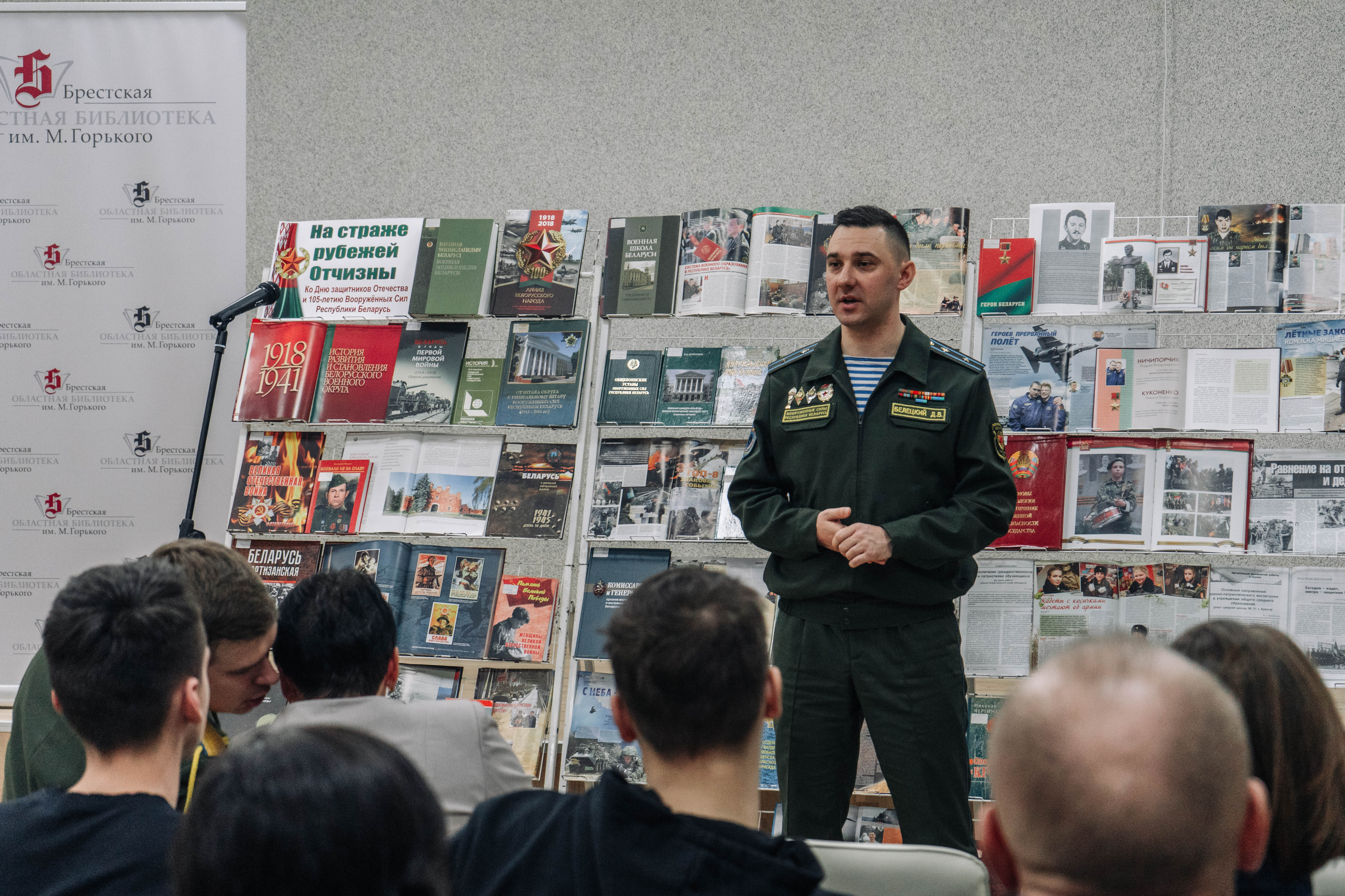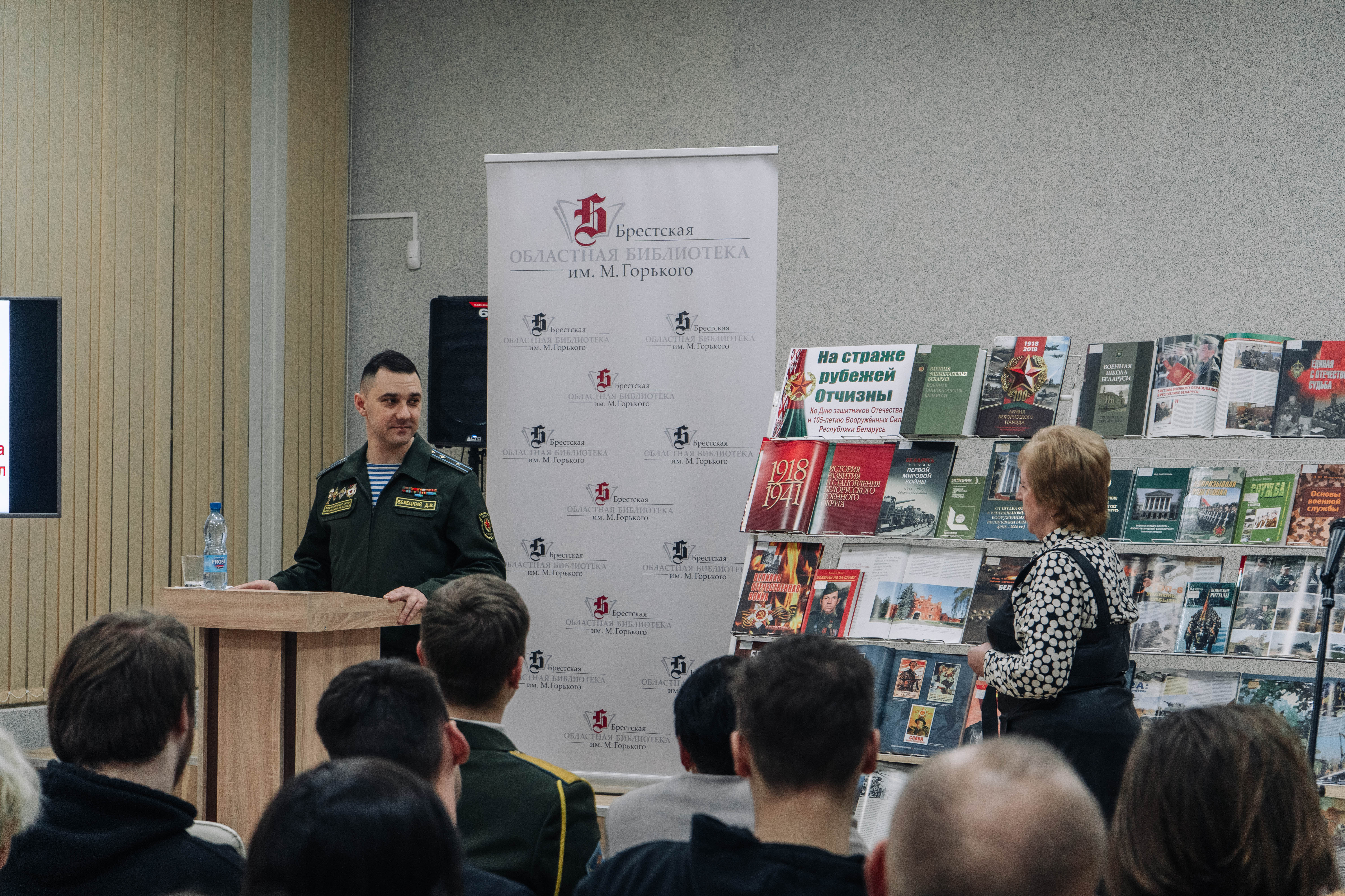 20 лютага 2023 г. у Брэсцкай абласной бібліятэцы імя М. Горкага адбылося мерапрыемства, прысвечанае Дню абаронцаў Айчыны і Узброеных сіл Рэспублікі Беларусь. Цяперашні год — гэта год 105-годдзя з дня заснавання Узброеных сіл Беларусі. І вельмі значна, што на сустрэчу з моладдзю — навучэнцамі трох каледжаў г. Брэста — былі запрошаны прадстаўнікі 38-й Брэсцкай асобнай гвардзейскай Венскай Чырванасцяжнай дэсантна-штурмавой брыгады: гвардыі маёр Дзмітрый Віктаравіч Бялецкі, гвардыі радавы Уладзіслаў Юр’евіч Макарэвіч і Наталля Уладзіміраўна Бараноўская.