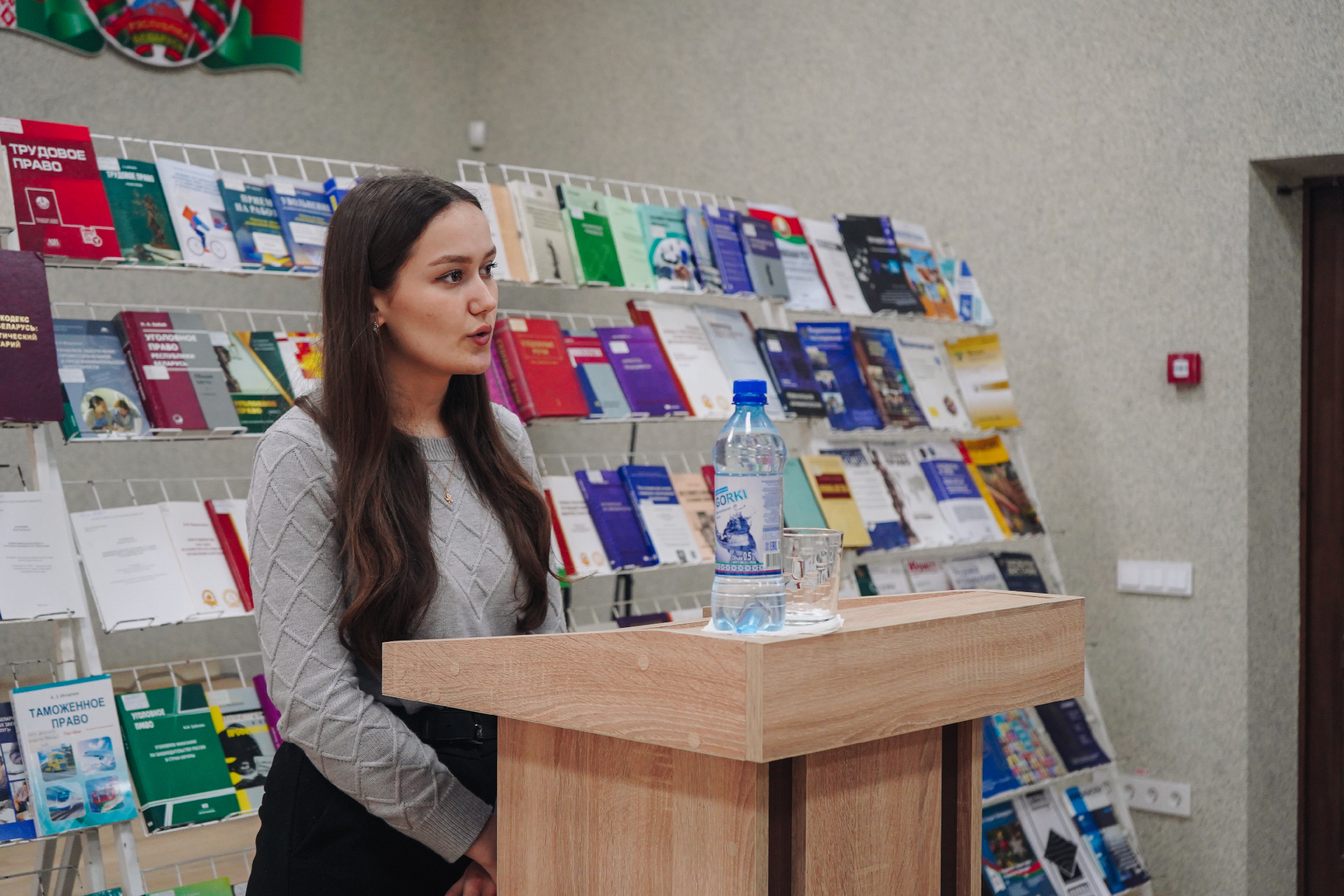 Студэнтка III курса, старшыня студэнцкага навуковага таварыства юрыдычнага факультэта Аксана Герасімук падрыхтавала выступленне «Навуковы экспрэс: адкрый свет навукі на юрыдычным факультэце».