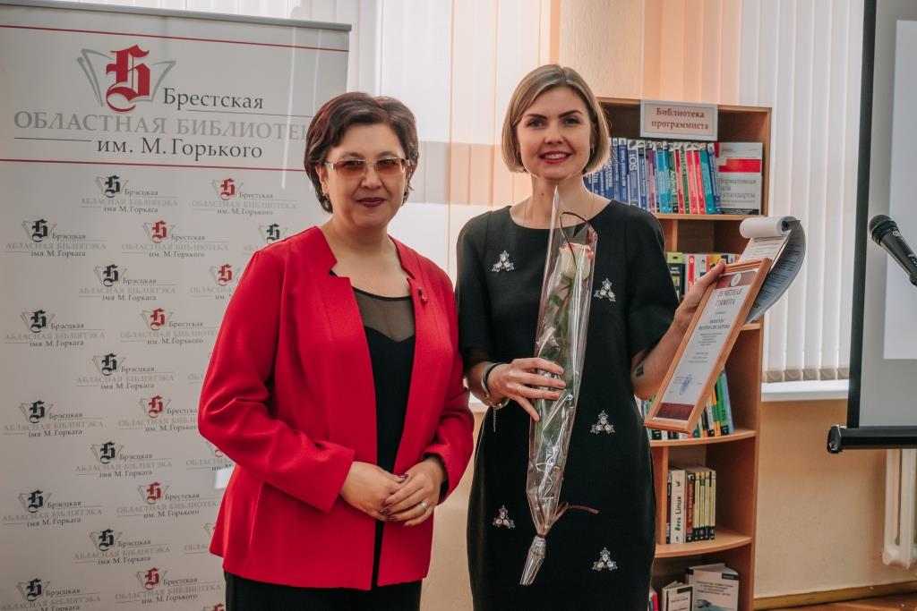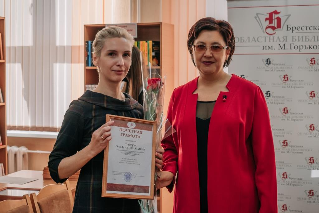 Благодарности министра культуры Республики Беларусь объявлены Стрижевич Елене Яковлевне, директору Брестской областной библиотеки им. М. Горького, и Морощук Ирине Николаевне, главному библиотекарю общего читального зала.