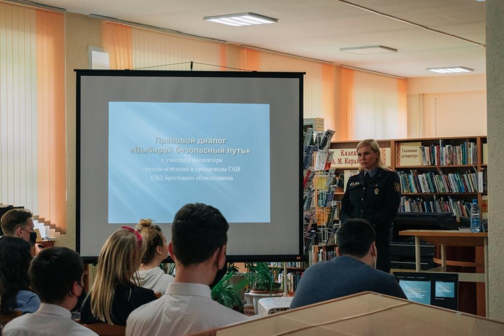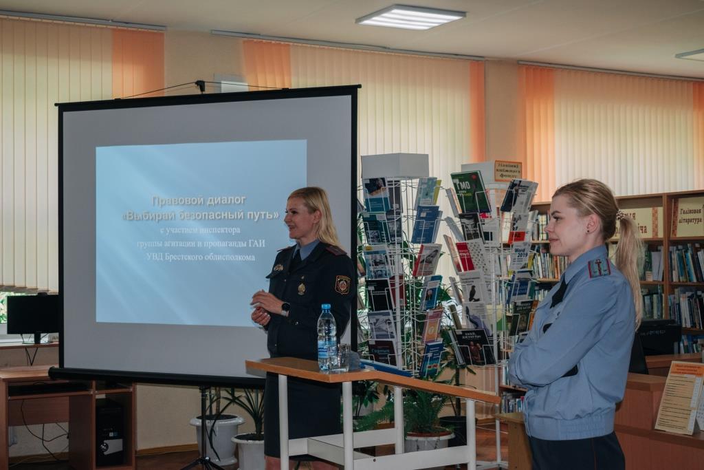 Супрацоўнікі групы агітацыі і прапаганды ДАІ УУС Брэсцкага аблвыканкама Мілюкова Наталля Віктараўна і Крук Вераніка Уладзіміраўна правялі прававы дыялог «Выбірай бяспечны шлях», удзельнікамі якога сталі юнакі і дзяўчаты чыгуначнага каледжа і прафесійна-тэхнічнага ліцэя чыгуначнага транспарту. У гутарцы закрануты пытанні бяспекі дарожнага руху: адказнасці пешаходаў, правіл перамяшчэння на роварах, скутэрах, мапедах і інш. Мерапрыемства прайшло ў форме дыялогу, на пастаўленыя пытанні адказвалі і самі слухачы.