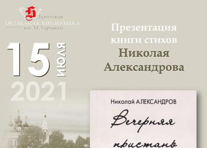 15 июля в 17:00 в отделе краеведческой литературы и библиографии Брестской областной библиотеки им. М. Горького состоится презентация книги стихов Николая Александрова «Вечерняя пристань».