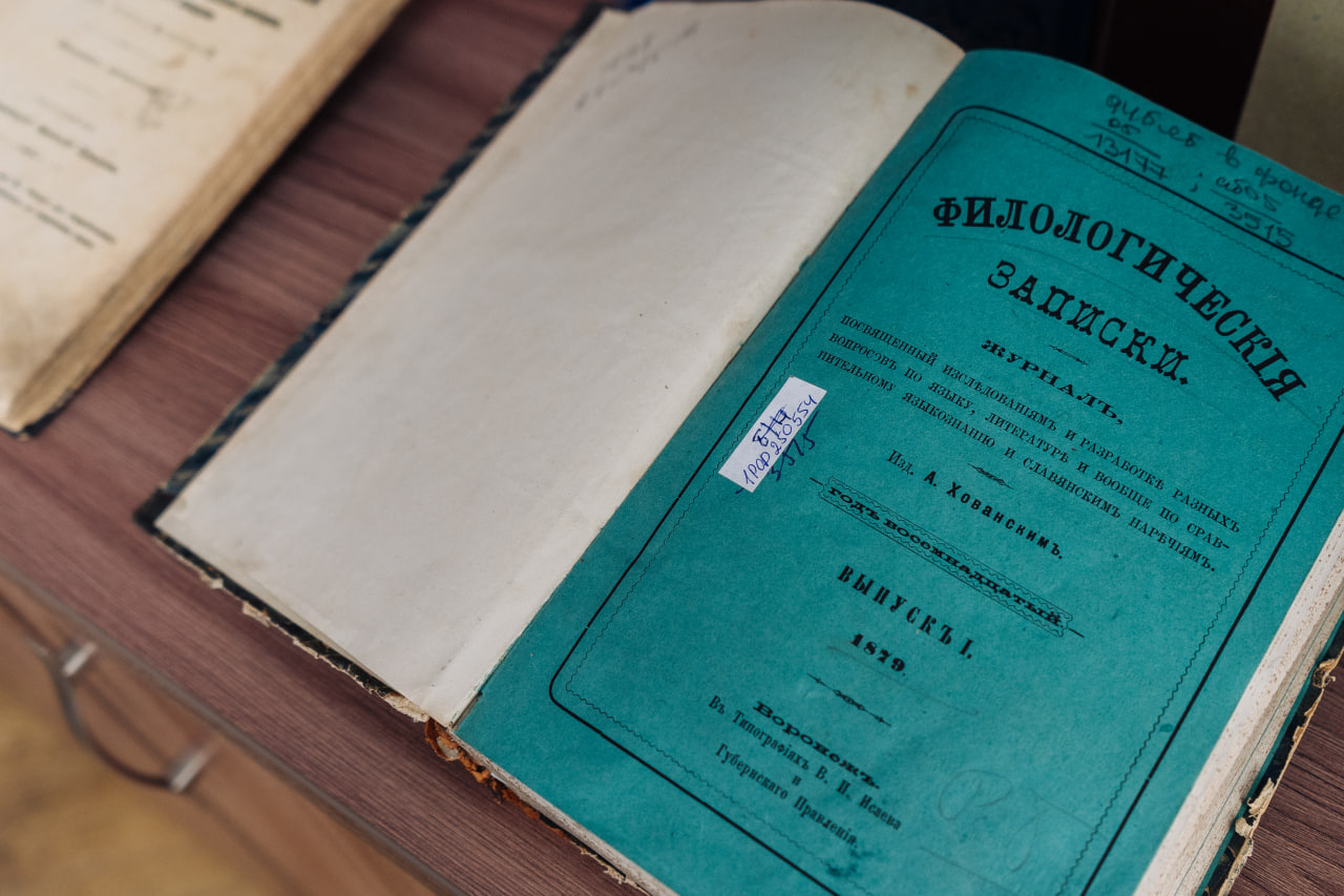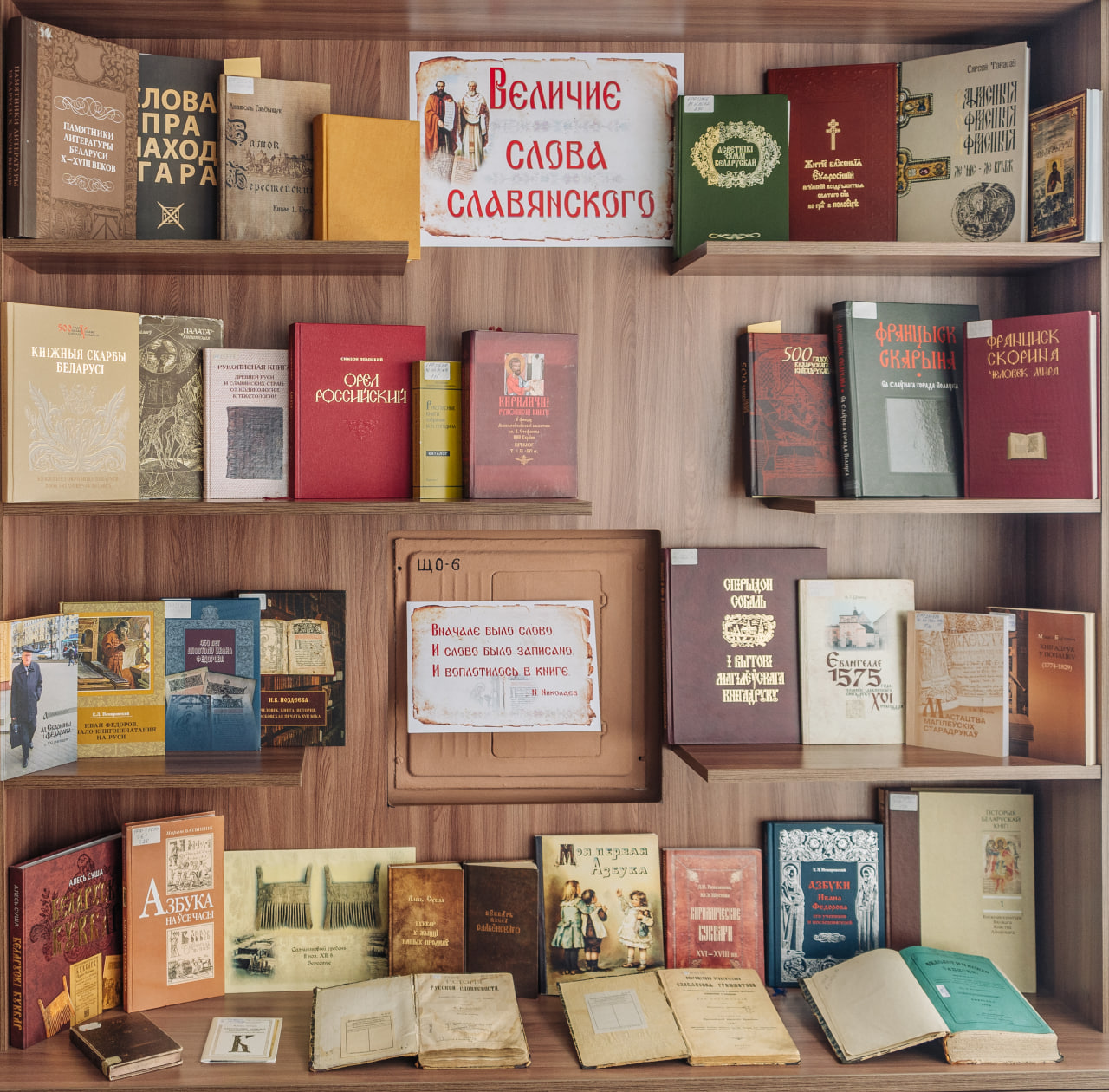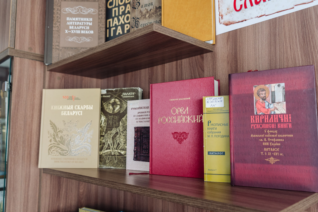 Асаблівай увагі заслугоўваюць прадстаўленыя на выставе выданні, надрукаваныя больш за 100 гадоў таму: «История русской словесности (учебник для средних учебных заведений)» (1902 г.), «Сокращенная практическая славянская грамматика» (1912 г.), журнал «Филологические записки» (1879 г.). У іх можна знайсці інфармацыю аб Кірыле і Мяфодзіі, аб славянскім алфавіце і правапісе, аб царкоўна-славянскай мове з тлумачэннем яе этымалогіі і абазначэннем яе месца сярод іншых славянскіх моў.