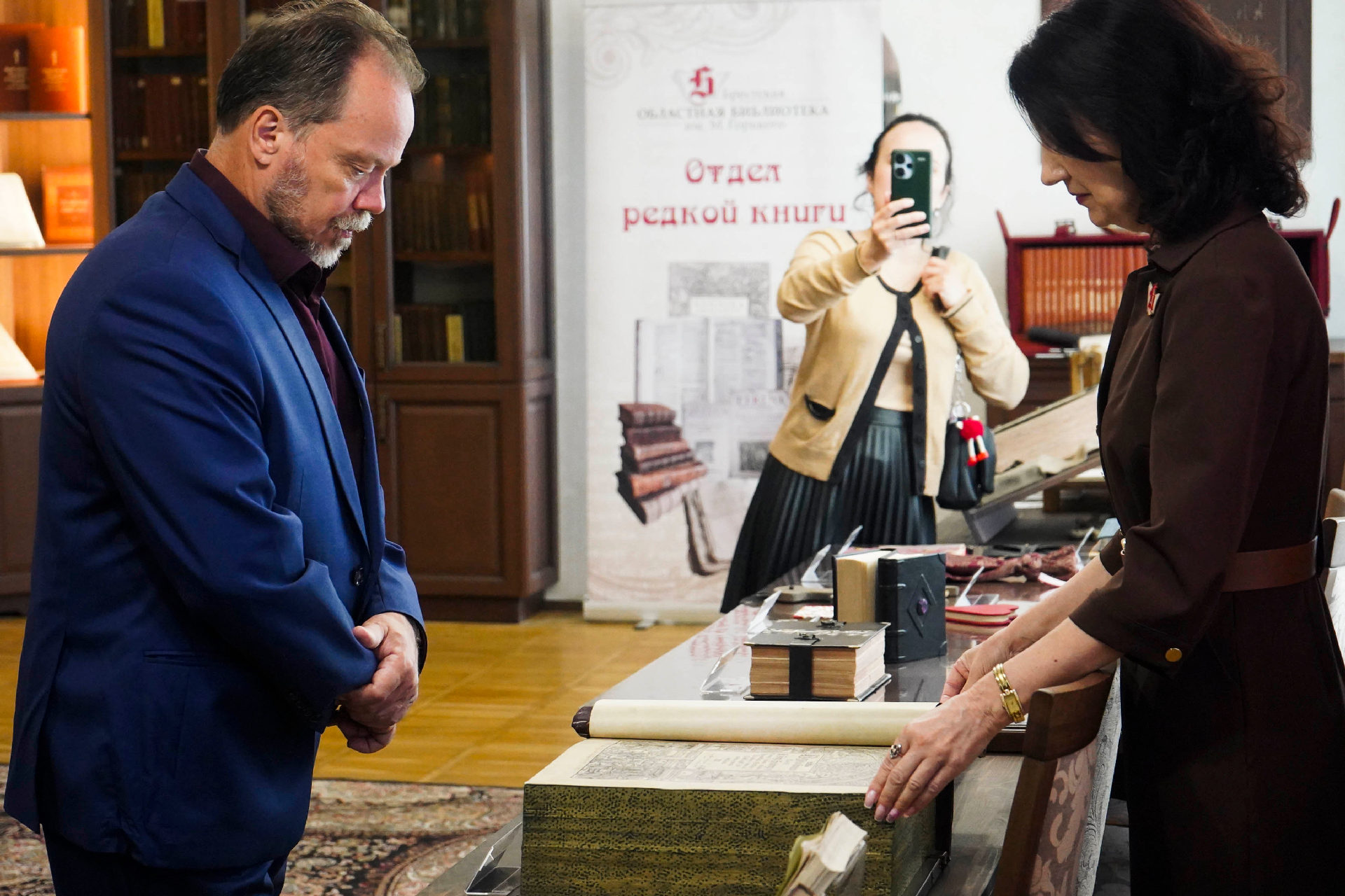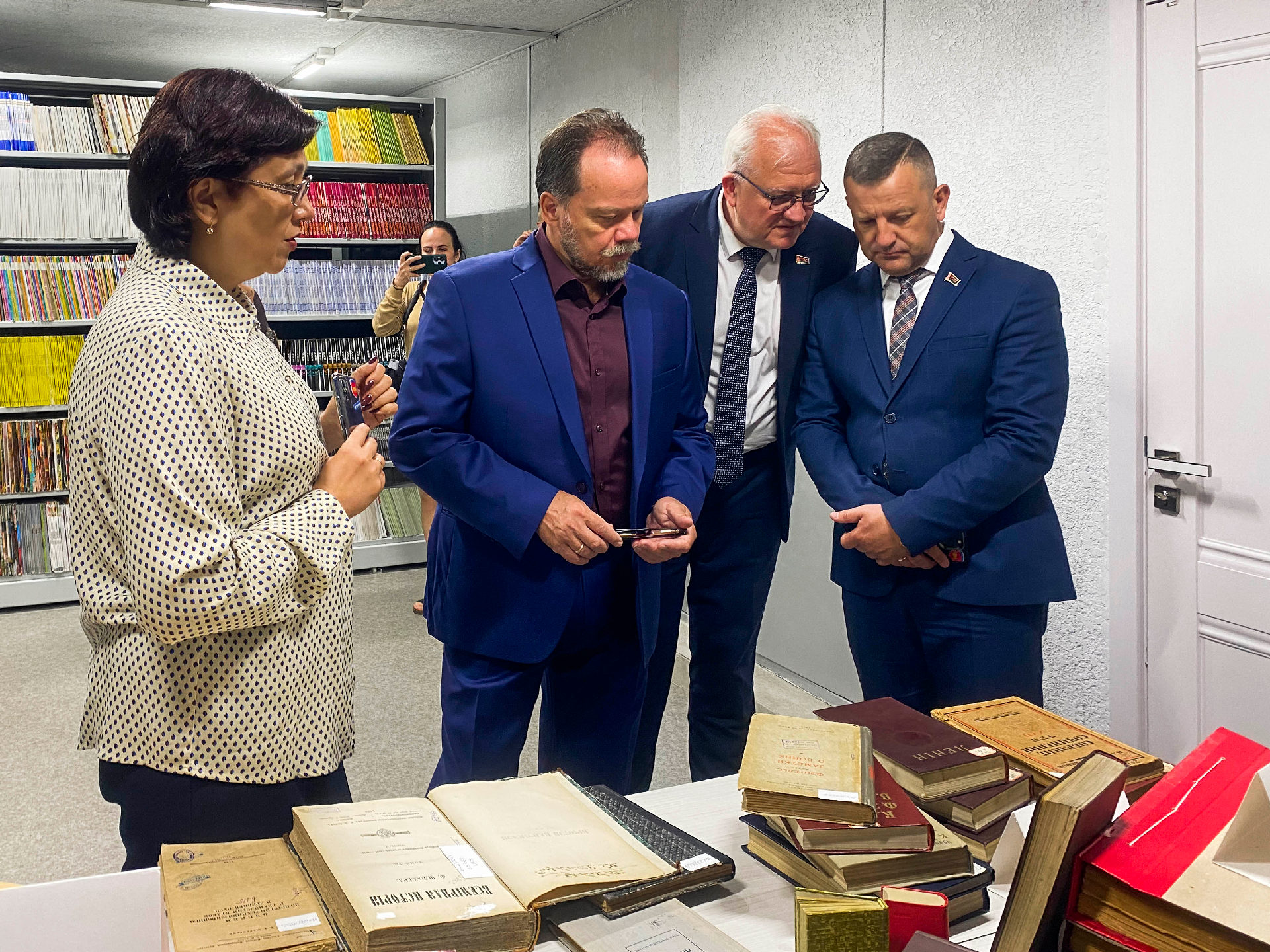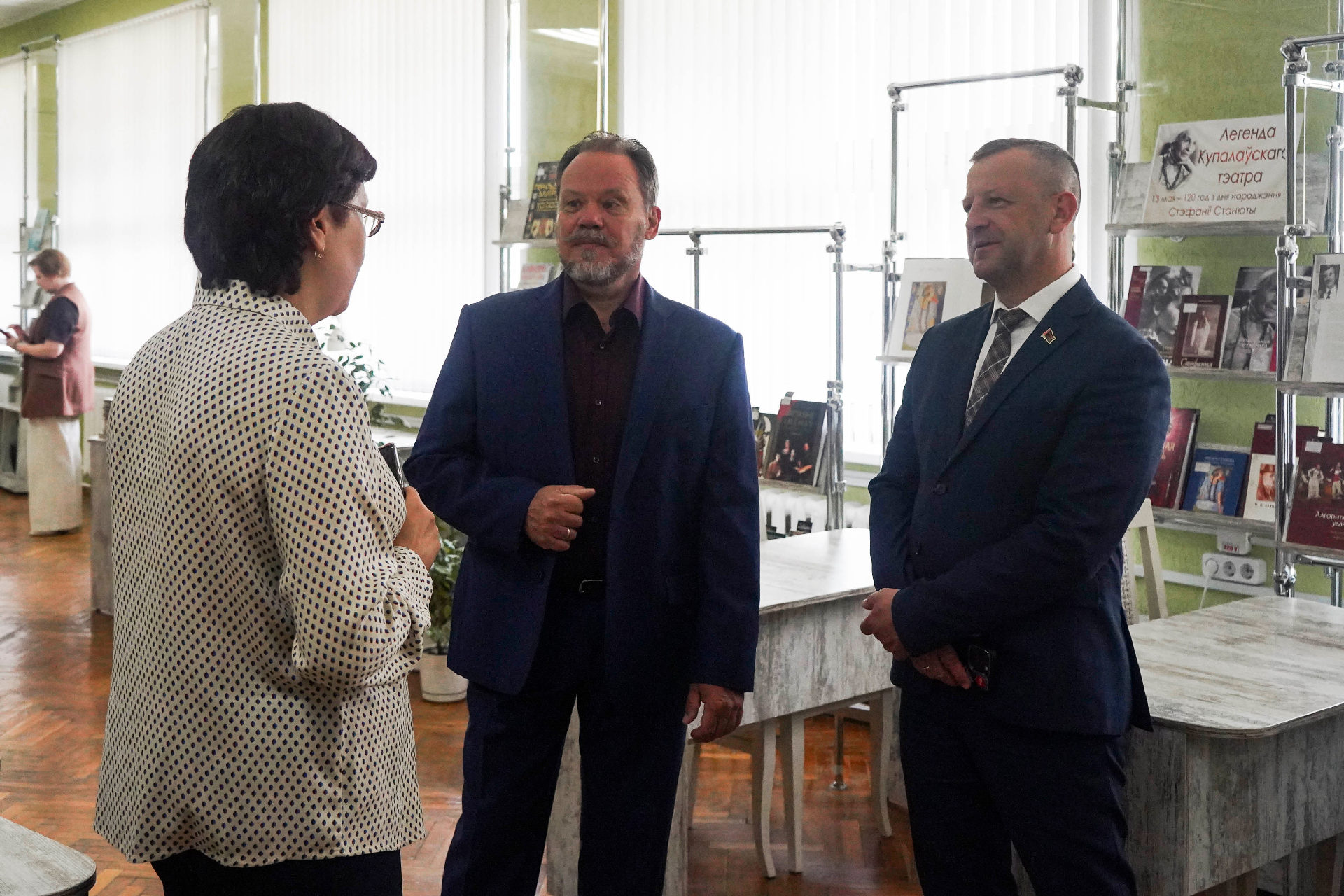 Дырэктар бібліятэкі Алена Якаўлеўна Стрыжэвіч пазнаёміла госця з гісторыяй установы і яе структурнымі падраздзяленнямі: аддзеламі абанемента, захоўвання асноўнага фонду, літаратуры па мастацтве; сектарамі краязнаўства і рэдкай кнігі.