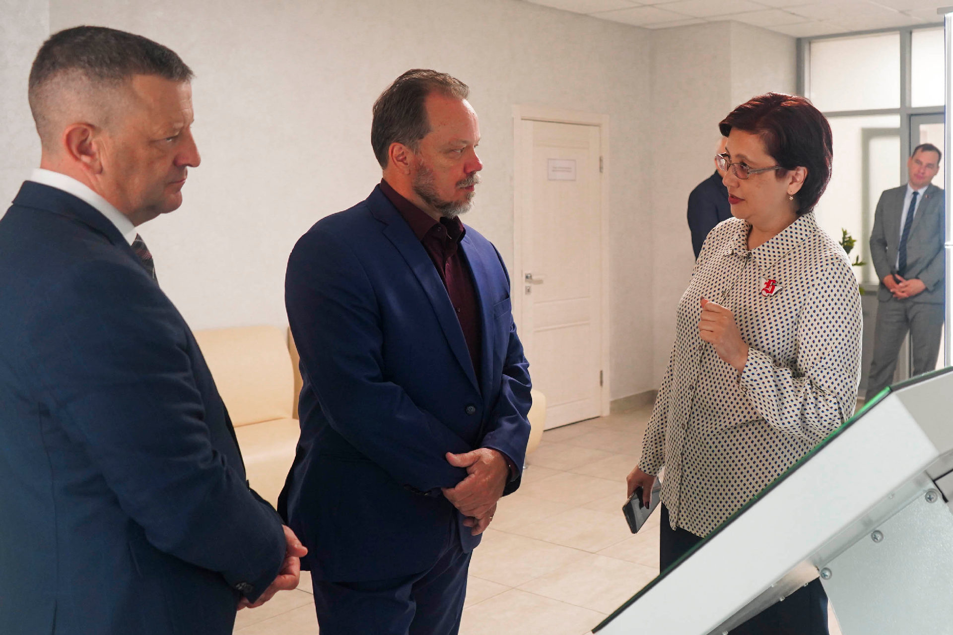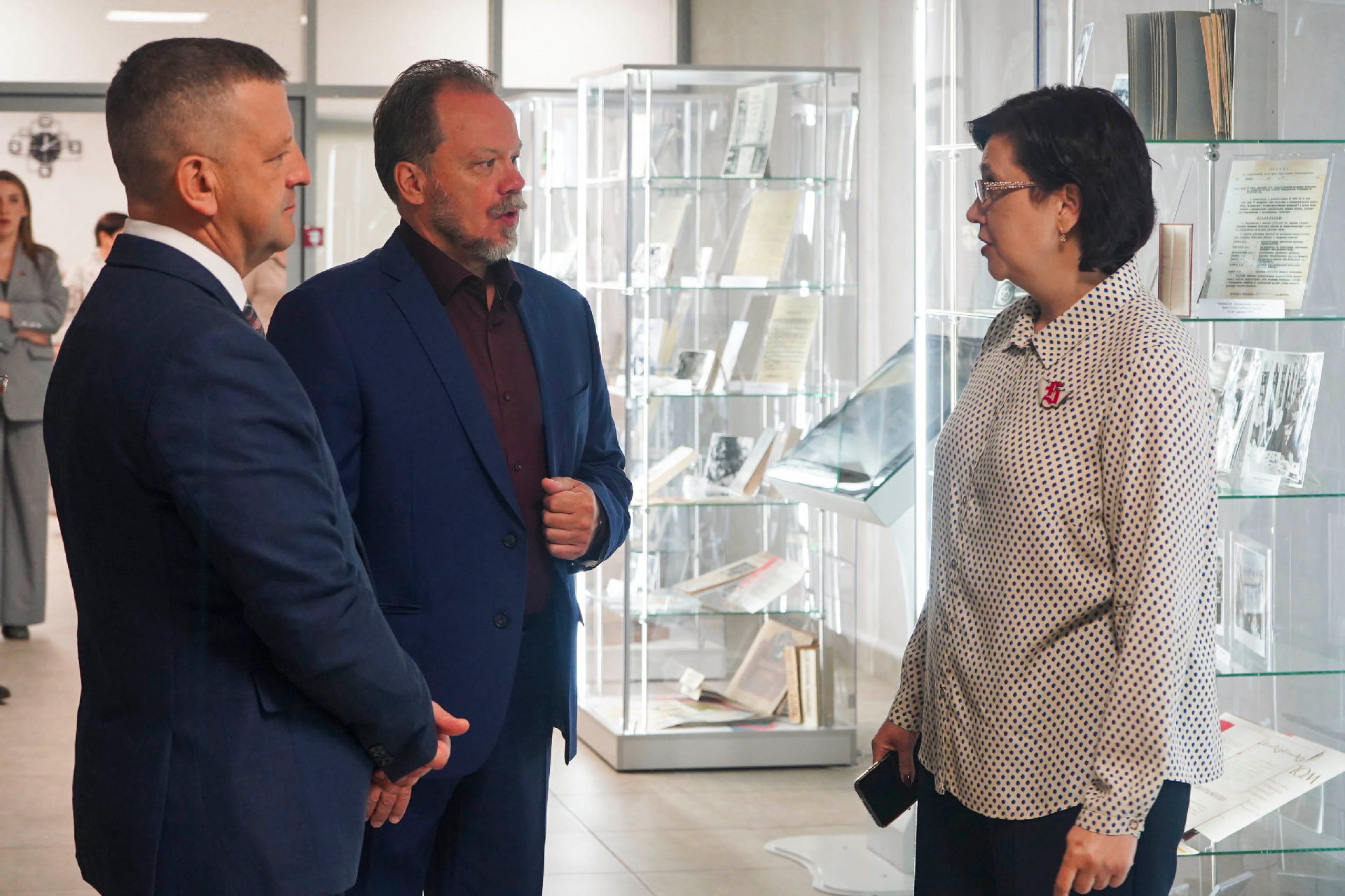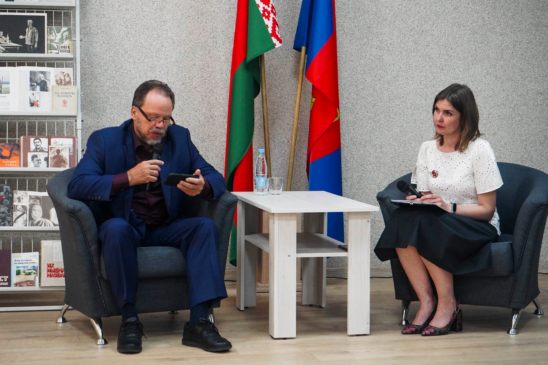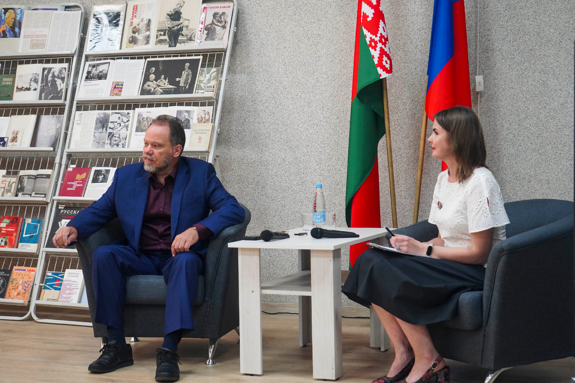 Дырэктар бібліятэкі Алена Якаўлеўна Стрыжэвіч пазнаёміла госця з гісторыяй установы і яе структурнымі падраздзяленнямі: аддзеламі абанемента, захоўвання асноўнага фонду, літаратуры па мастацтве; сектарамі краязнаўства і рэдкай кнігі.