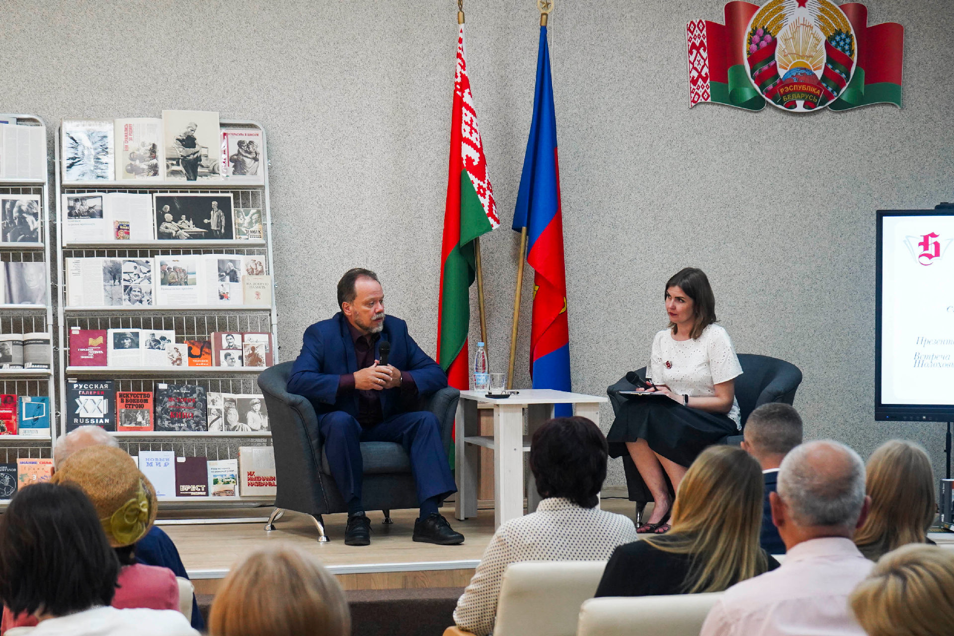 Пасля экскурсіі ў актавай зале прайшла сустрэча Аляксандра Міхайлавіча з жыхарамі Брэста — чытачамі і супрацоўнікамі бібліятэкі, удзельнікамі клуба «КанТэкст», студэнтамі і выкладчыкамі філалагічнага факультэта БрДУ імя А. С. Пушкіна, членамі Брэсцкага абласнога аб'яднання «Руская супольнасць». Казалі пра Міхаіла Шолахава — пісьменніка, грамадскага дзеяча, дзядулю; аб актуальнасці яго творчасці сёння. Міхаіл Аляксандравіч падзяліўся ўспамінамі аб знакамітым продку — яго рысах характару, укладзе жыцця, фенаменальнай памяці і хатняй бібліятэцы. Вядучы бібліятэкар аддзела абанемента Наталля Анатольеўна Равенка прадставіла выставу аб жыцці і творчай спадчыне пісьменніка. Выкладчыкі філалагічнага факультэта Людміла Міхайлаўна Садко і Вольга Мікалаеўна Кавальчук падзяліліся думкамі, чаму вучаць творы Міхаіла Шолахава цяперашняе пакаленне.