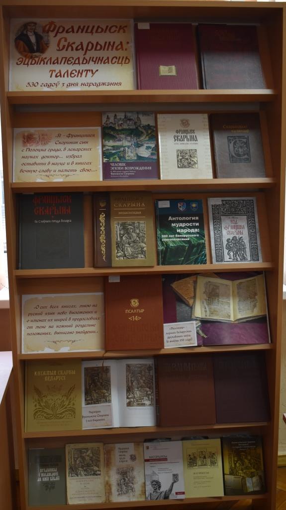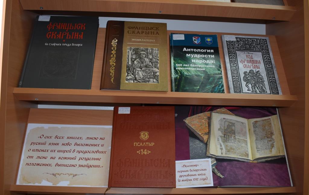 На выставе будуць прадстаўлены факсімільныя і рэпрынтныя выданні Ф. Скарыны, а таксама кнігі пра яго жыццё і дзейнасць.