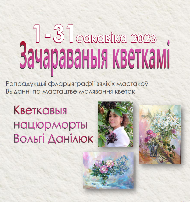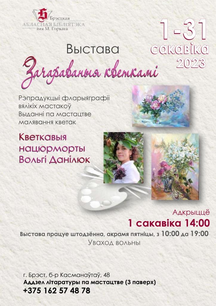 У першы дзень вясны аддзел літаратуры па мастацтве Брэсцкай абласной бібліятэкі імя М. Горкага запрашае на адкрыццё выставы «Зачараваныя кветкамі», на якой будуць прадстаўлены кветкавыя нацюрморты брэсцкай мастачкі Вольгі Данілюк, рэпрадукцыі фларыяграфіі вялікіх мастакоў, выданні па мастацтве малявання кветак.