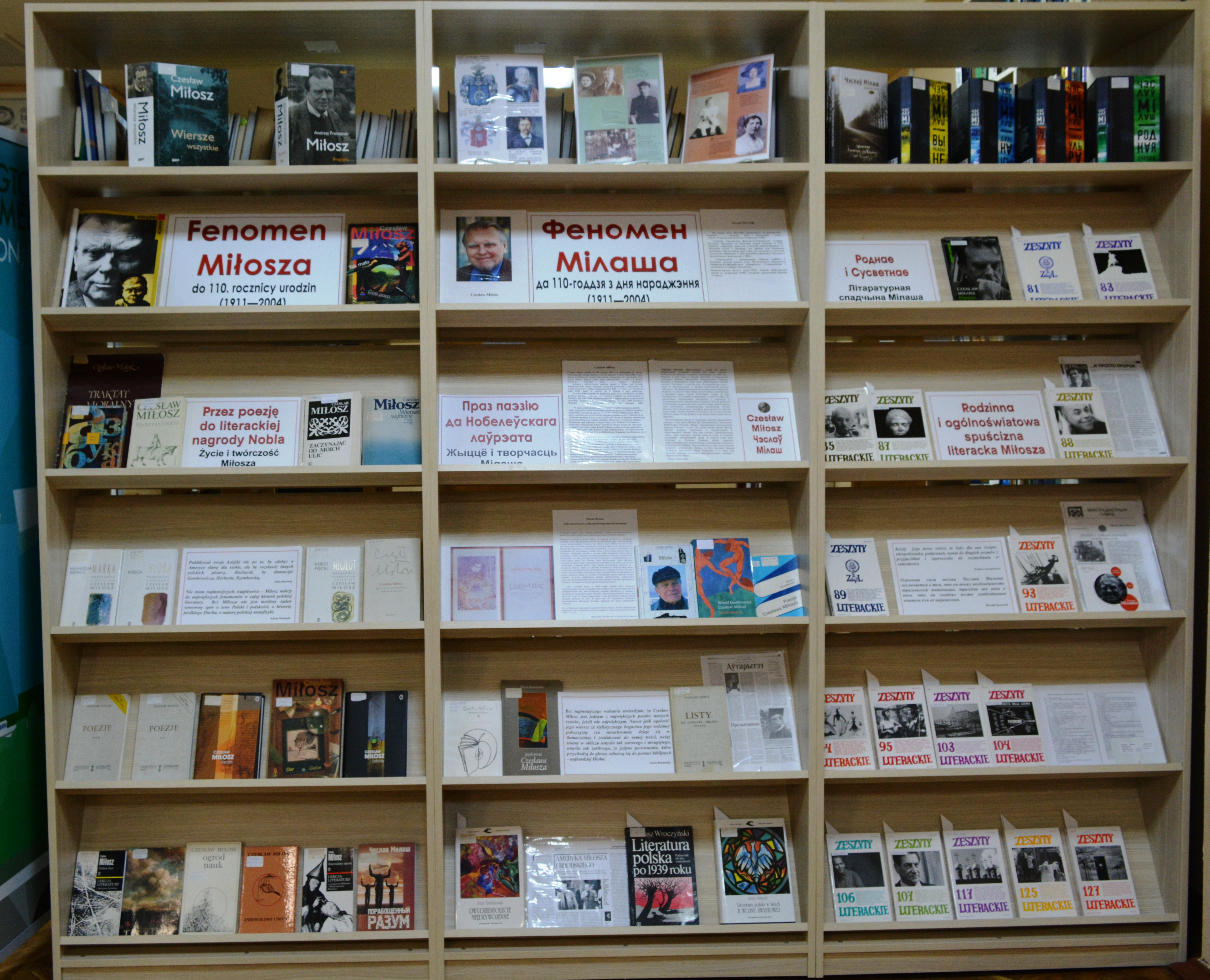 Аддзел літаратуры на замежных мовах Брэсцкай абласной бібліятэкі імя М. Горкага ў памяць пра ўнікальнага паэта і чалавека падрыхтаваў выставу «Fenomen Miłosza: do 110. rocznicy urodzin» («Феномен Мілаша: да 110-годдзя з дня нараджэння»). Гэта кніжная і часопісная падборка з фонду аддзела твораў Чэслава Мілаша і манаграфій пра яго жыццё і творчасць на польскай, беларускай і рускай мовах. Прадстаўлены творы такіх аўтараў як Анджэй Франашак (Andrzej Franaszek), Анджэй Завада (Andrzej Zawada), Бажэна Хшанстоўска (Bożena Chrząstowska), Лешэк Шаруга (Leszek Szaruga), Андрэй Хадановіч, Алесь Разанаў, Ян Чыквін, Юрый Бушлакоў, Уладзімір Брытанішскі, Наталля Гарбанеўская і інш.