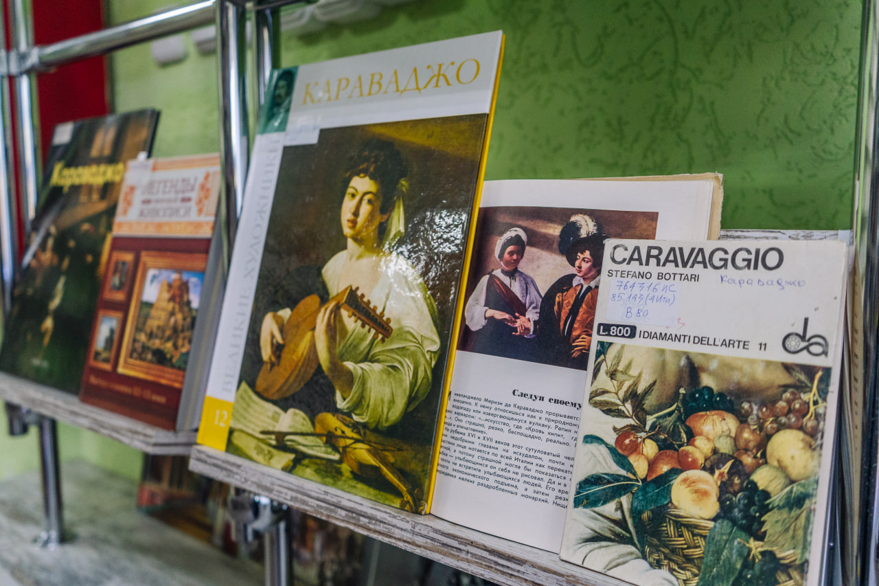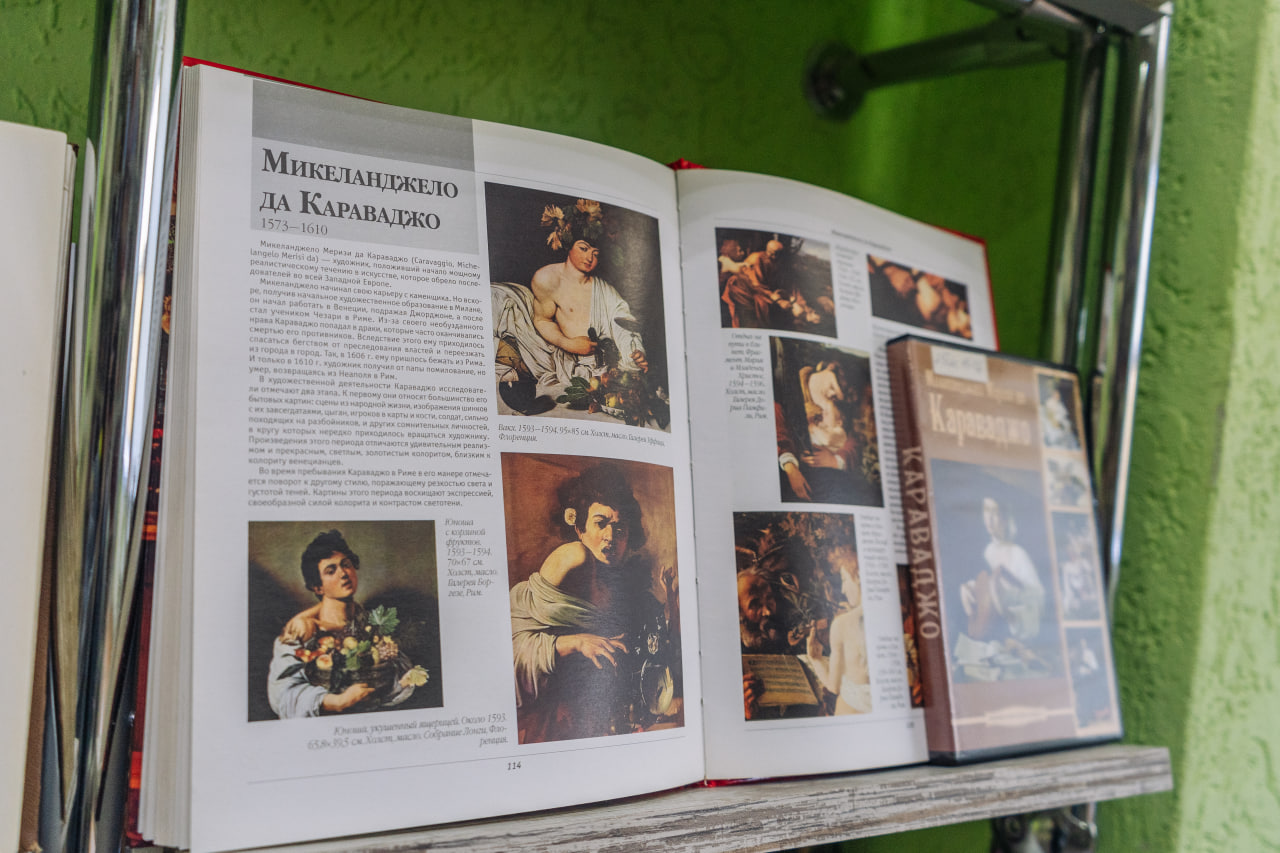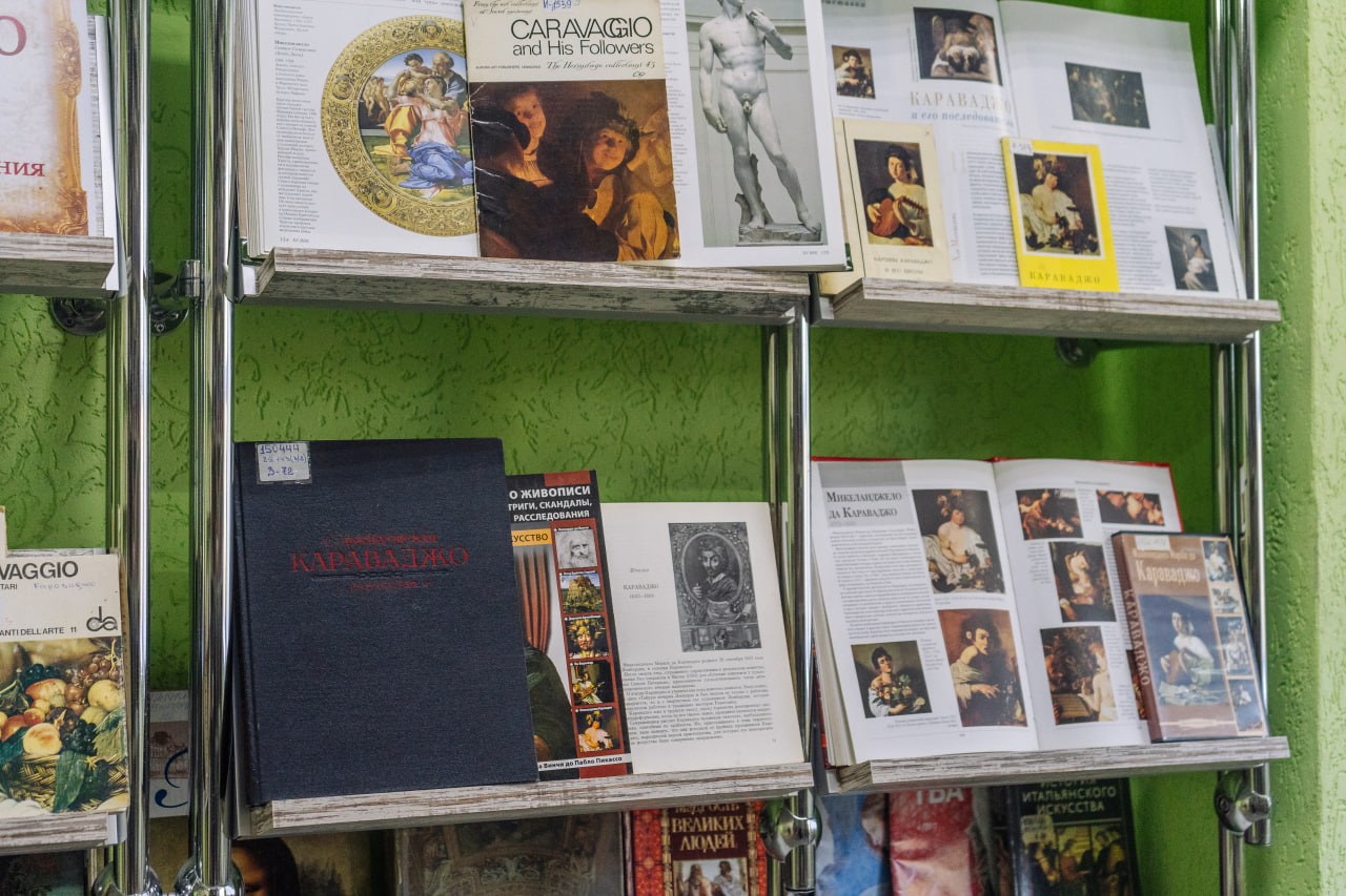 У экспазіцыі прадстаўлены кнігі, паштоўкі, рэпрадукцыі, кампакт-дыскі, перыядычныя выданні. У кнізе Таццяны Знамяроўскай «Микеланджело да Караваджо» (Масква, 1955) прадстаўлены біяграфічны нарыс, праілюстраваны рэпрадукцыямі. Альбом, які выйшаў у серыі «Великие художники» (Масква, 2009), прысвечаны біяграфіі мастака і гісторыі стварэння карцін. У выданні «Микеланджело да Караваджо: документы, воспоминания современников» (Масква, 1975) сабраны сведчанні пра жыццё мастака, расказаныя яго сучаснікамі, водгукі пра яго жывапіс, судовыя і іншыя дакументы.