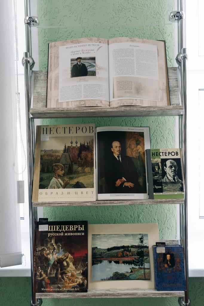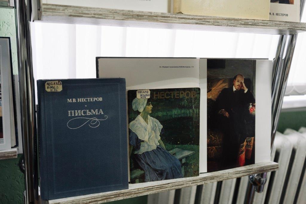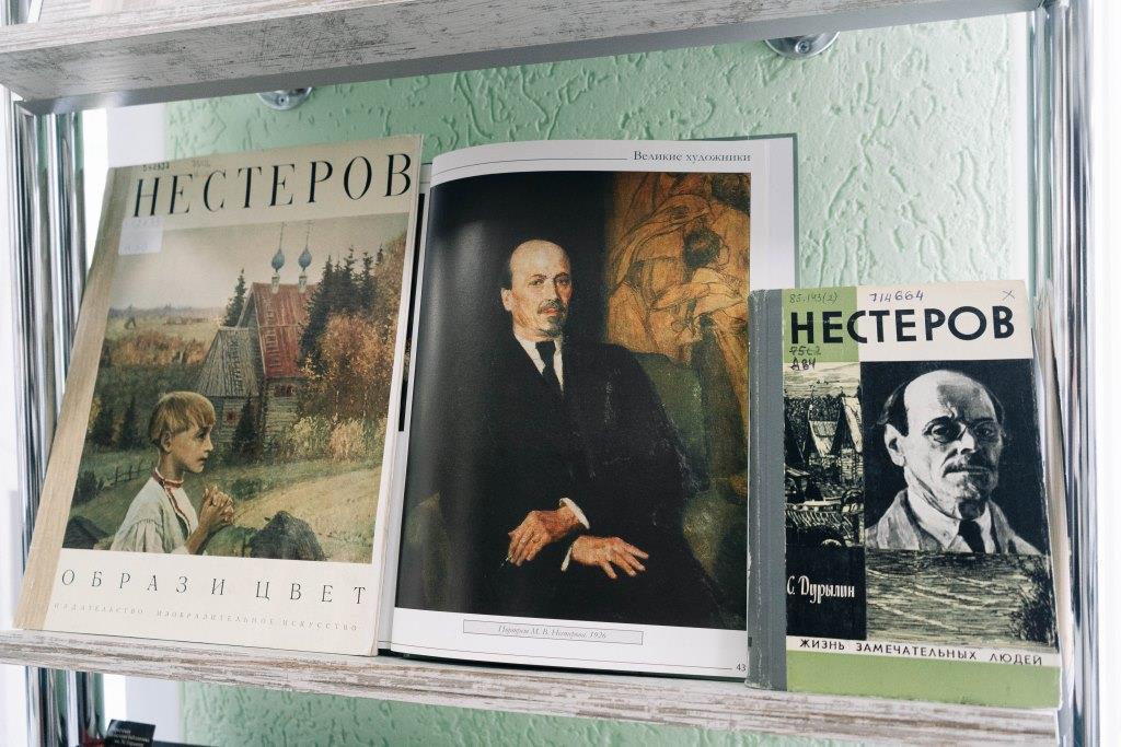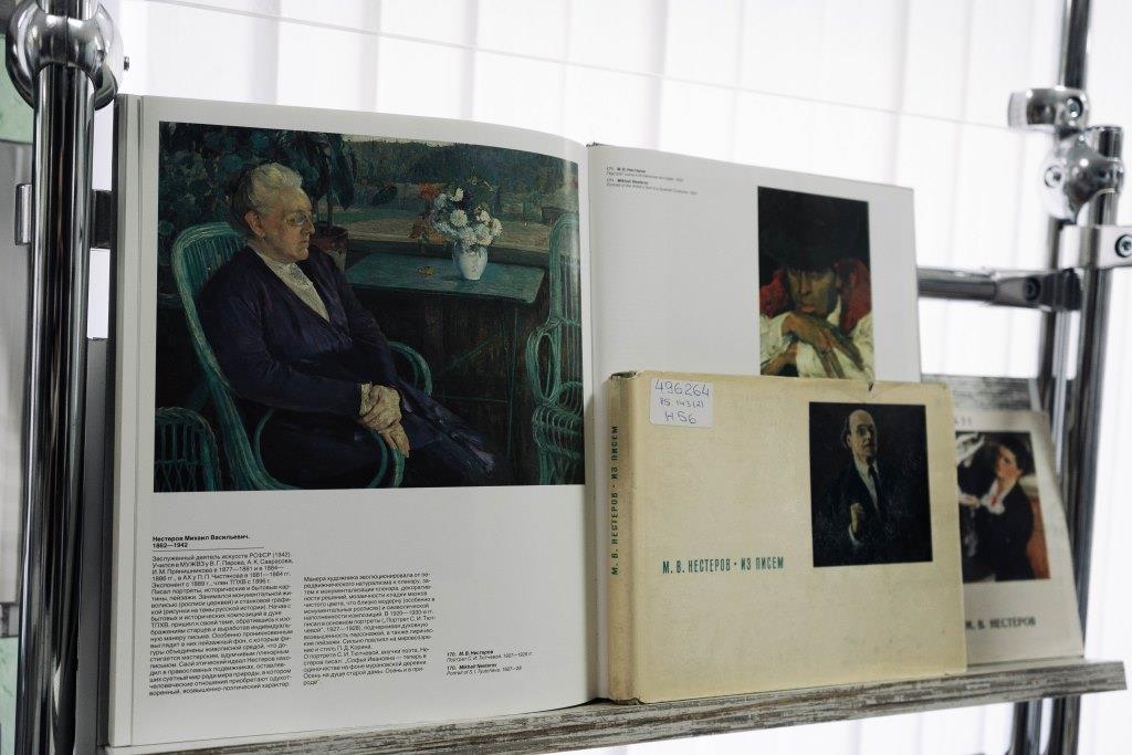У экспазіцыі прадстаўлены кнігі і часопісныя артыкулы пра жыццё і творчасць М. В. Несцерава, альбомы і асобныя рэпрадукцыі яго карцін, камплекты паштовак, энцыклапедыі, зборнікі пісьмаў і ўспамінаў. Несумненную цікавасць выклічуць мемуары самога мастака «О пережитом. 1862–1917 гг. Воспоминания» (Масква, 2006), манаграфія А. Міхайлава «Михаил Васильевич Нестеров. Жизнь и творчество» (Масква, 1958), кніга С. Дурыліна «Нестеров-портретист» (Масква, 1949), альбомы «Михаил Нестеров» (Масква, 2001) і «Михаил Васильевич Нестеров, 1862–1942» (Масква, 2011).
