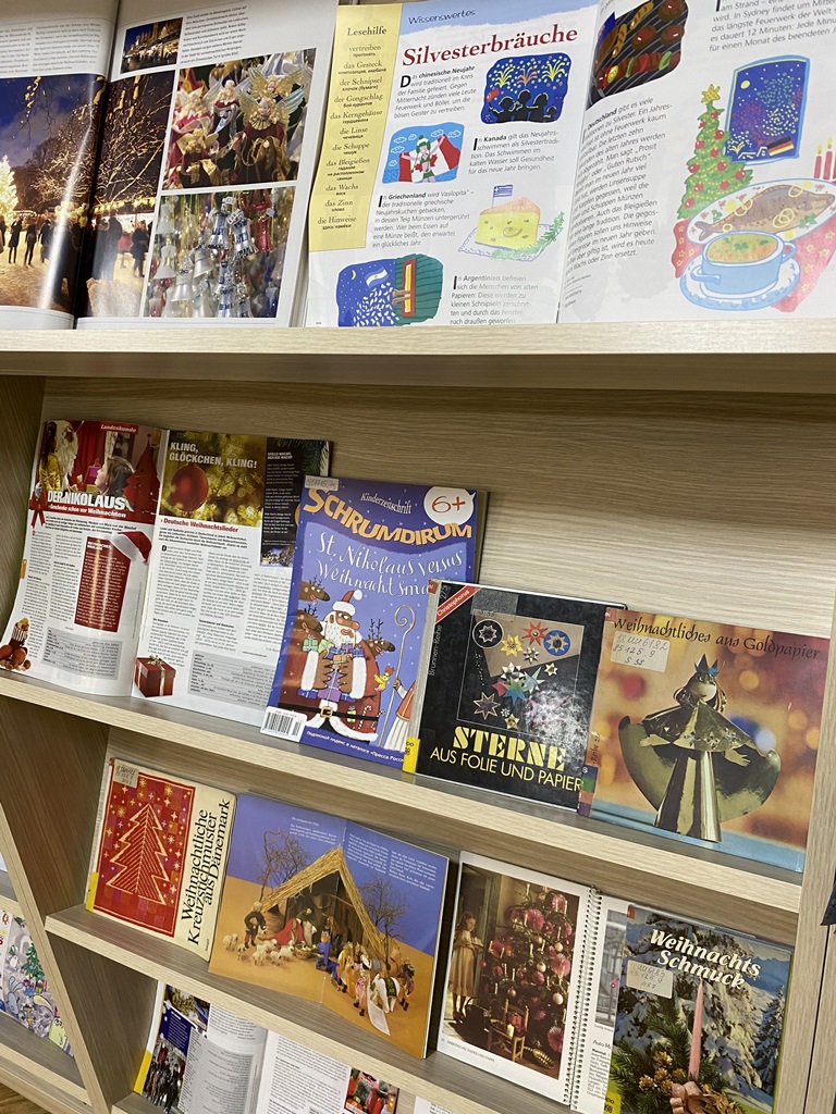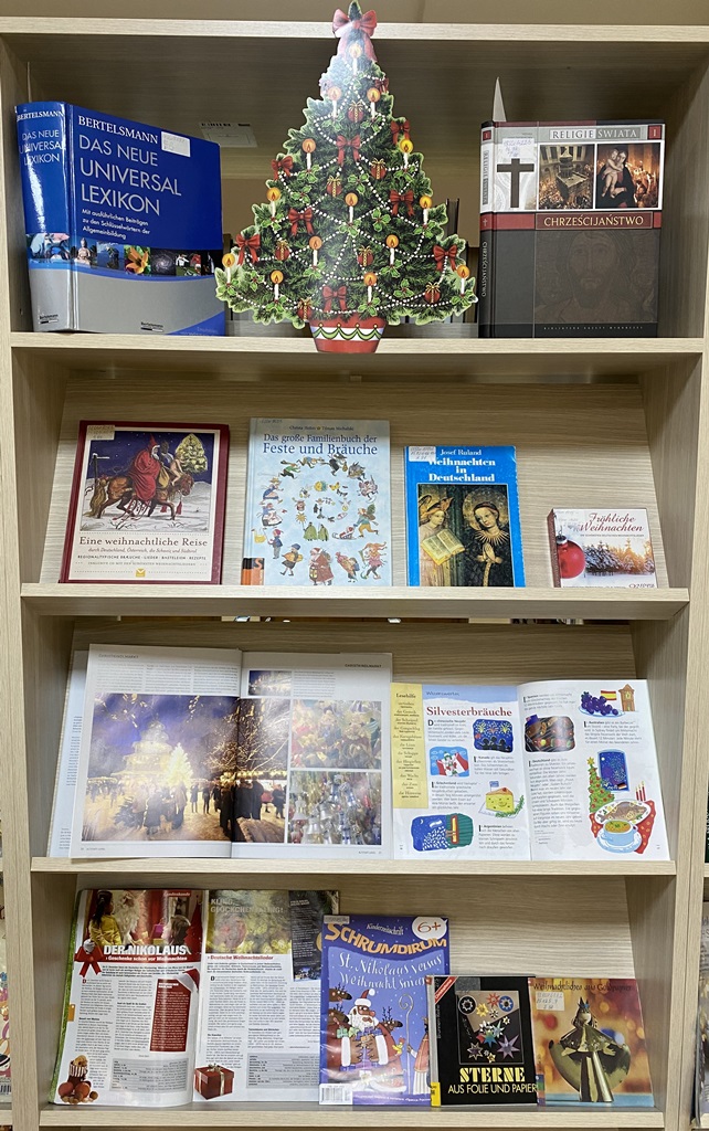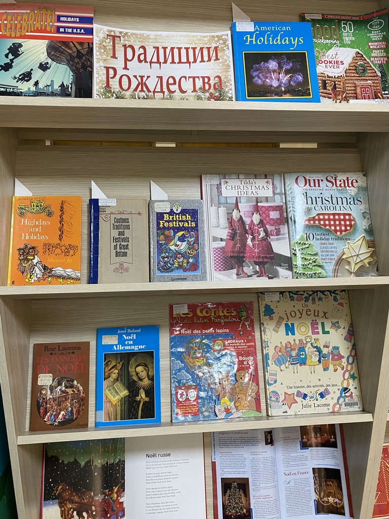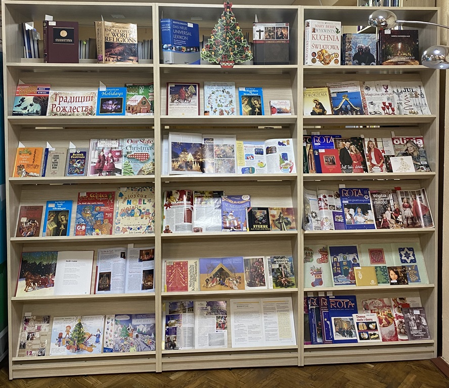 Важна! На выставе кнігі і перыёдыка на англійскай, нямецкай, французскай і польскай мовах аб тым, як людзі ў розных краінах праводзяць перадкалядны перыяд: ад чакання і падрыхтоўкі да сямейных традыцый упрыгожвання дома, вырабаў у розных тэхніках (арыгамі, вышыўка, вязанне, выраб фігурак з цеста, гліны і інш.), кулінарных рэцэптаў, святочных убораў, традыцыйных віншаванняў і калядных песень, якія склаліся на працягу стагоддзяў.