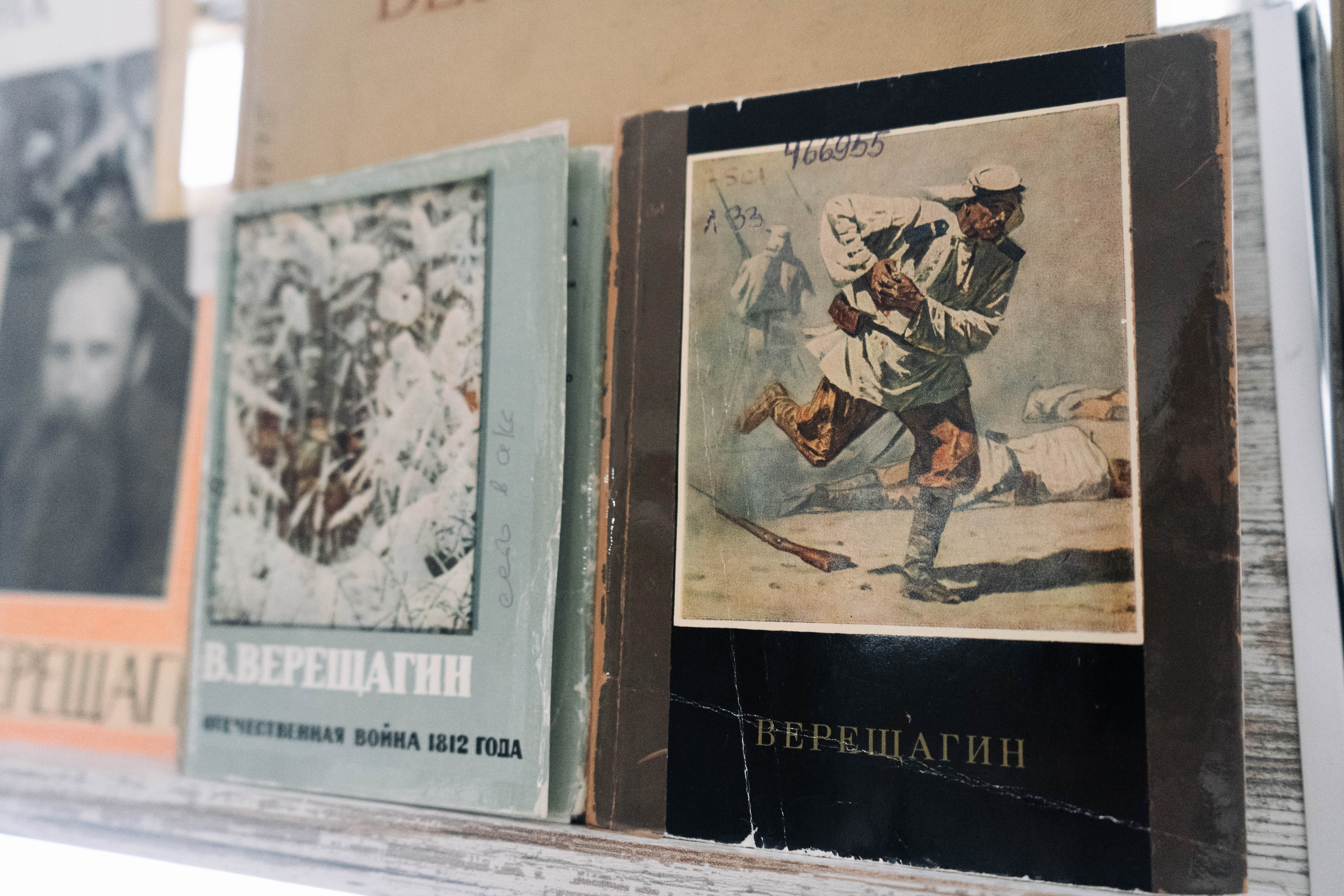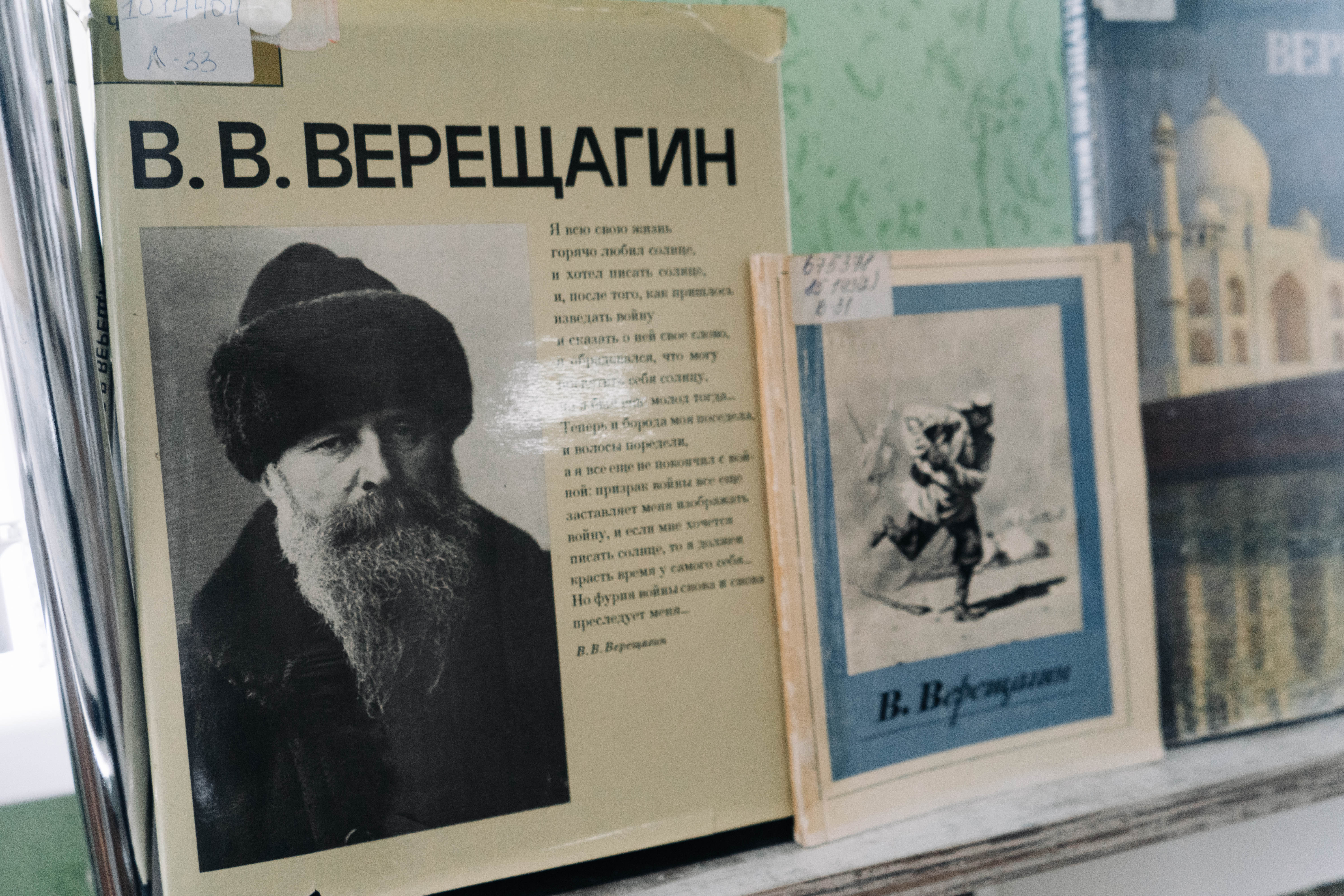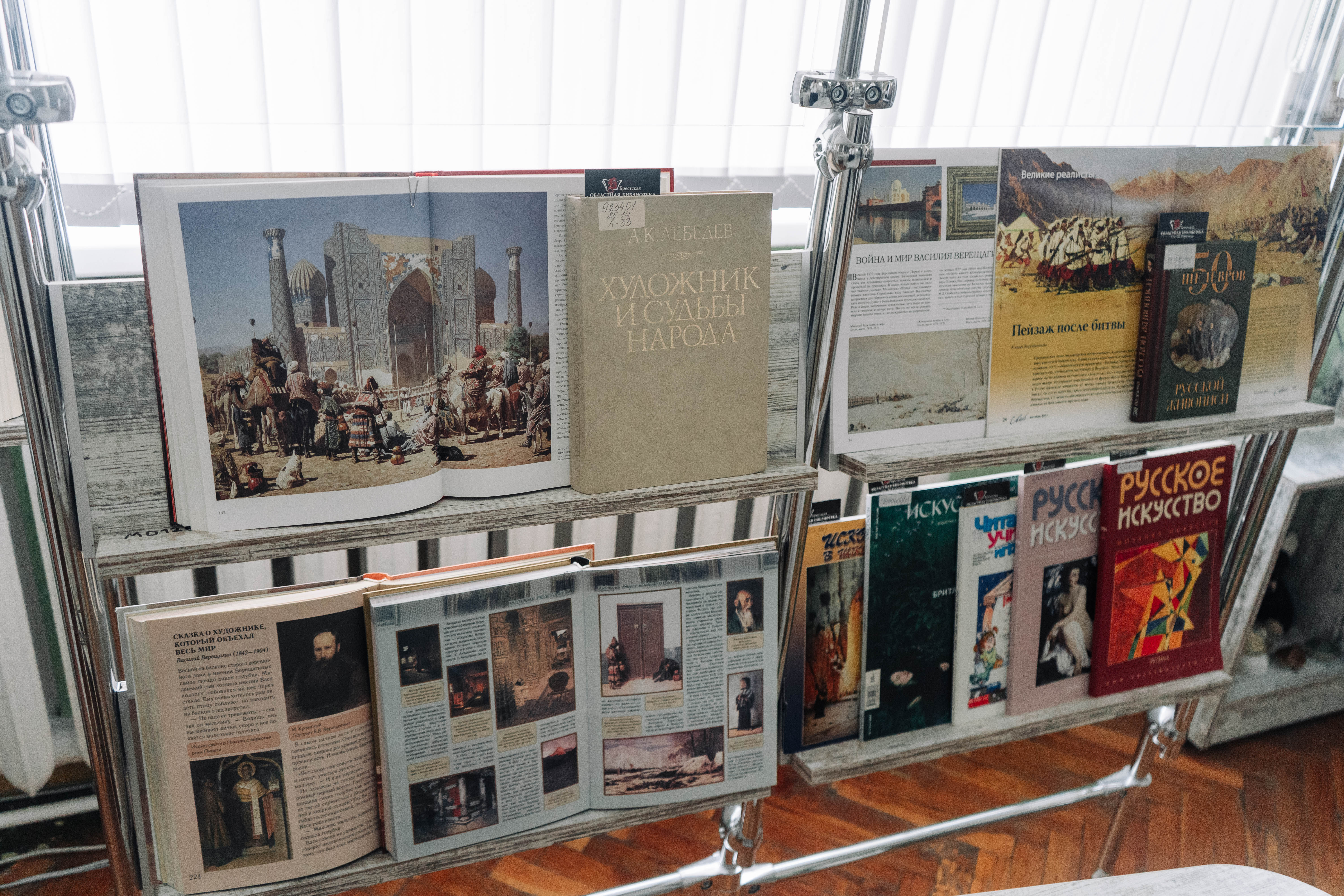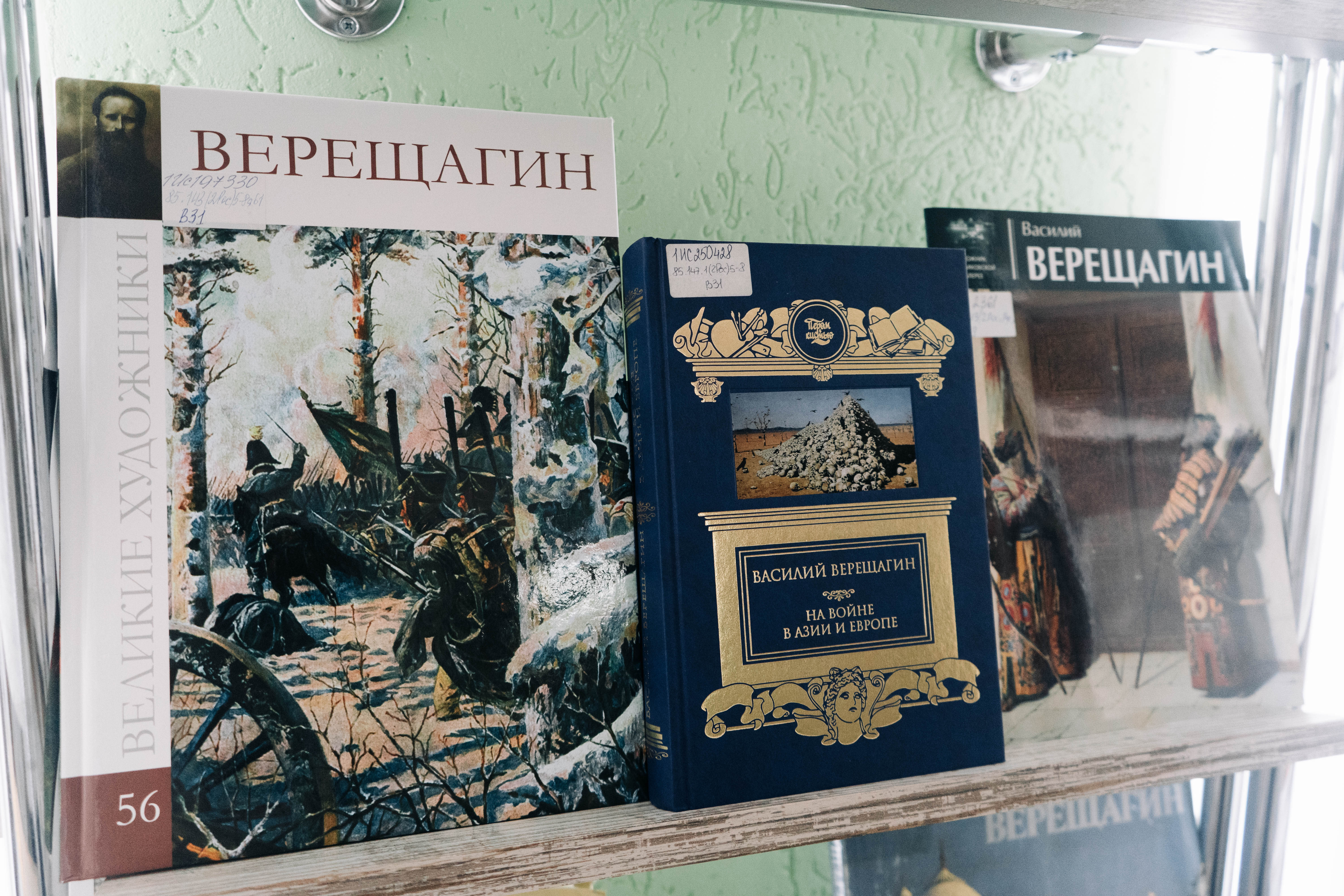 У экспазіцыі прадстаўлены кнігі, энцыклапедыі, мастацкія альбомы, перыядычныя выданні, камплекты паштовак, асобныя рэпрадукцыі. Цікавасць уяўляе альбом Я. Брука «Василий Верещагин» (Масква, 2004), які падрыхтаваны да юбілейнай выставы мастака. У выданне ўваходзяць артыкулы, напісаныя вядучымі расійскімі і замежнымі мастацтвазнаўцамі, дзе разглядаюцца розныя аспекты творчасці мастака. Альбом Я. У. Завадскай (Масква, 1986) прысвечаны жыццю і творчасці В. Верашчагіна. Аўтар распавядае пра вытокі творчасці мастака і школу майстэрства. Кніга «Василий Васильевич Верещагин» (Масква, 2010) з серыі «Великие художники» — гэта багата ілюстраваная манаграфія аб жыцці і творчасці Верашчагіна. У альбоме больш за 50 ілюстрацый, біяграфія мастака і гісторыі стварэння карцін.