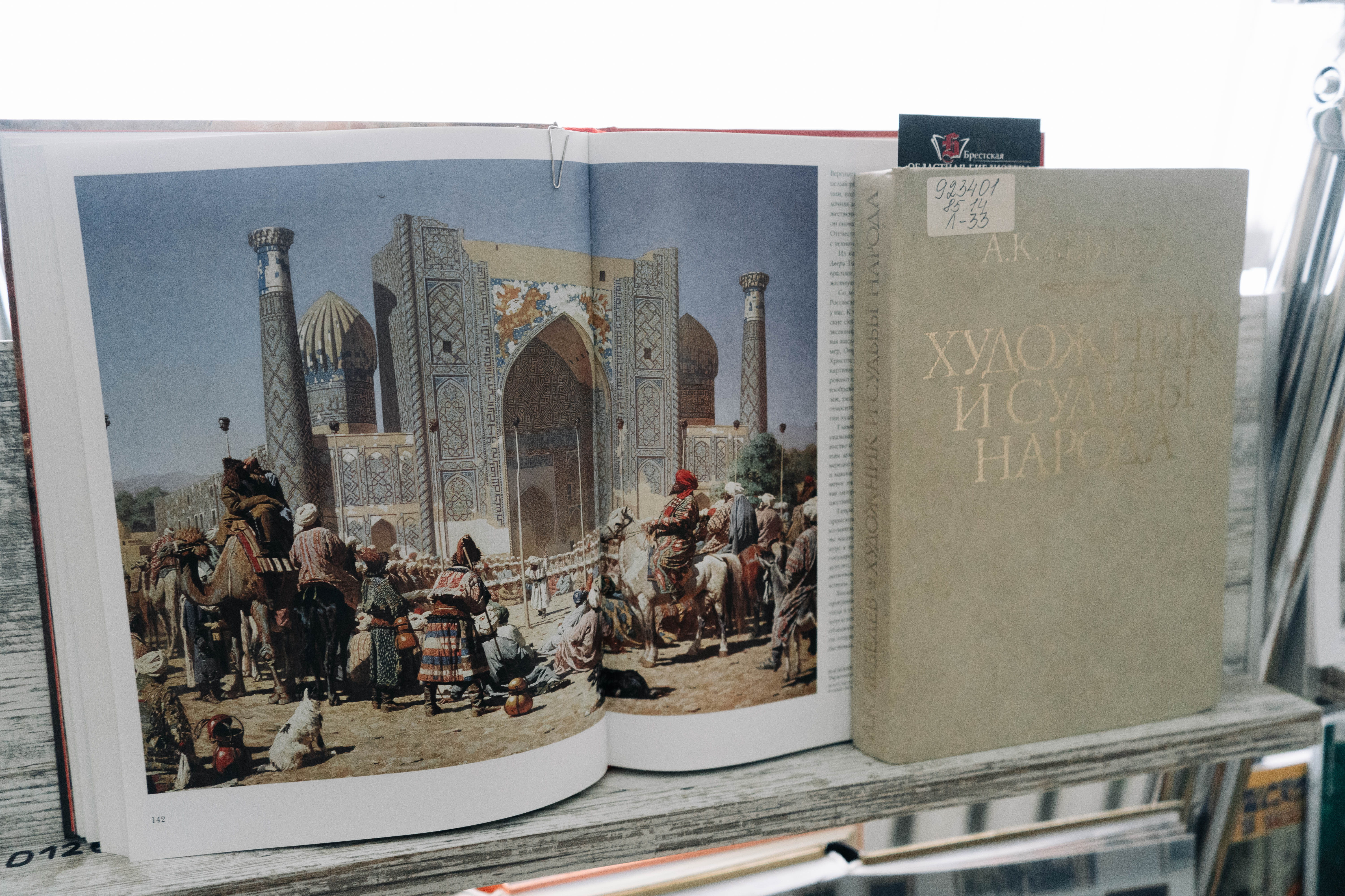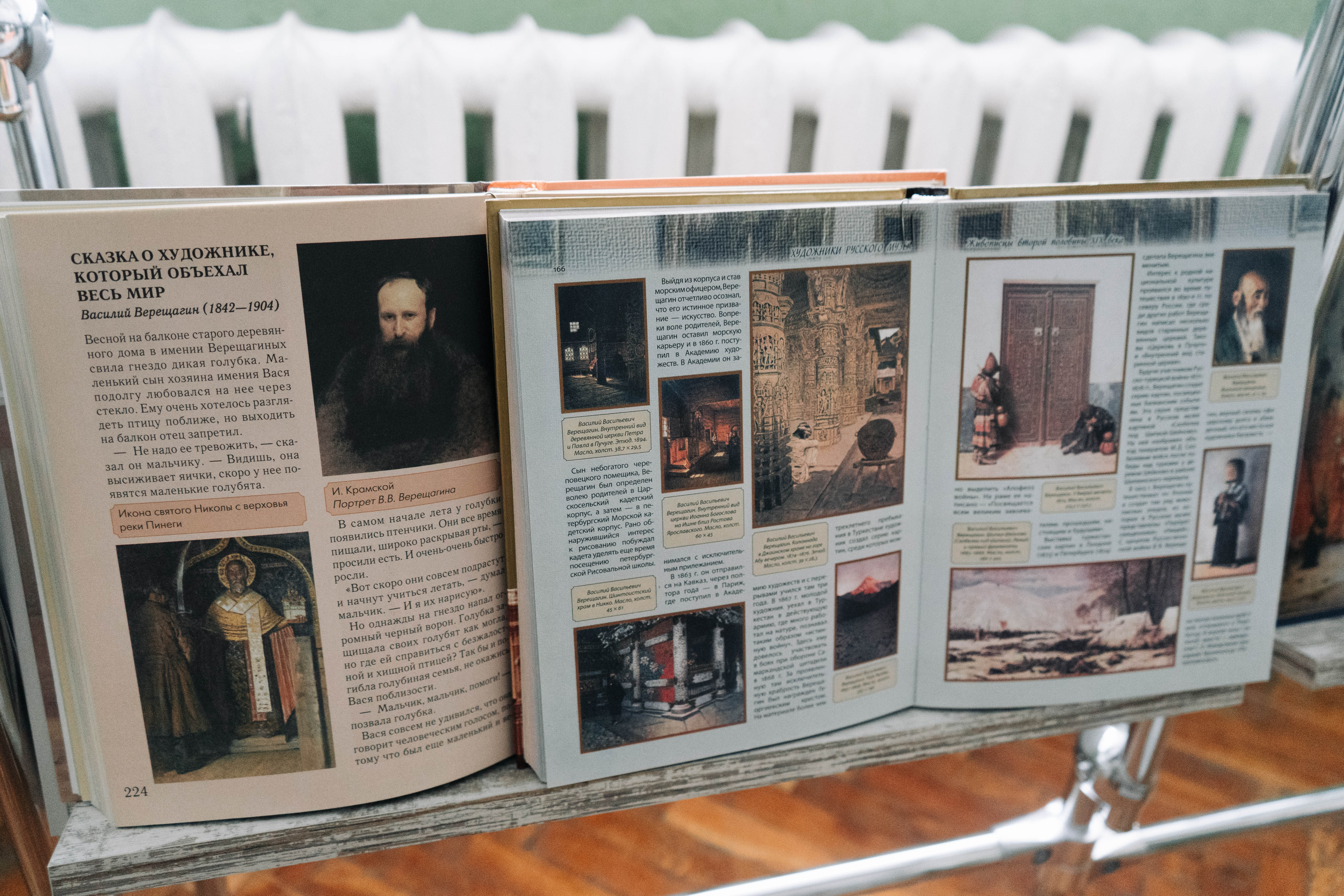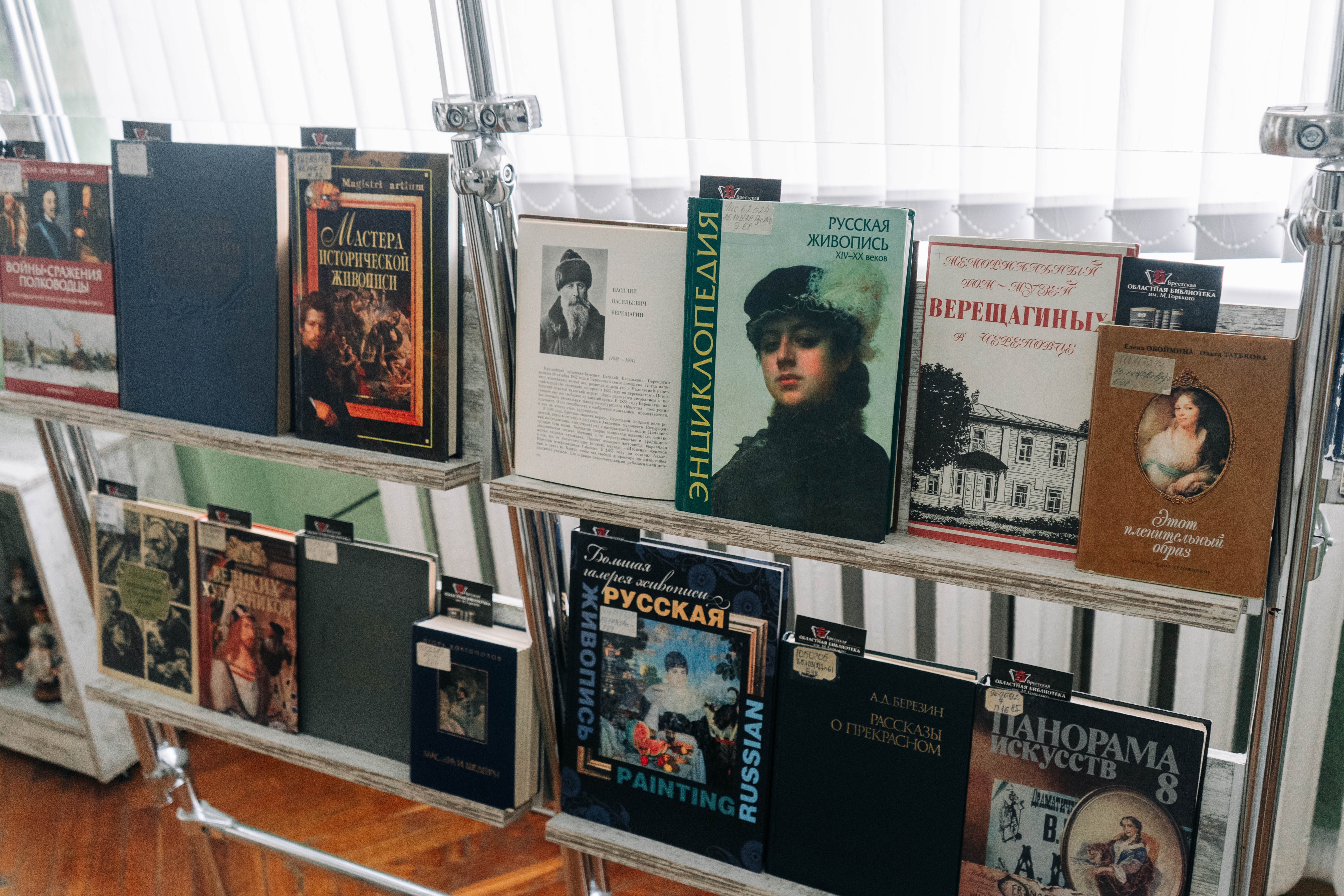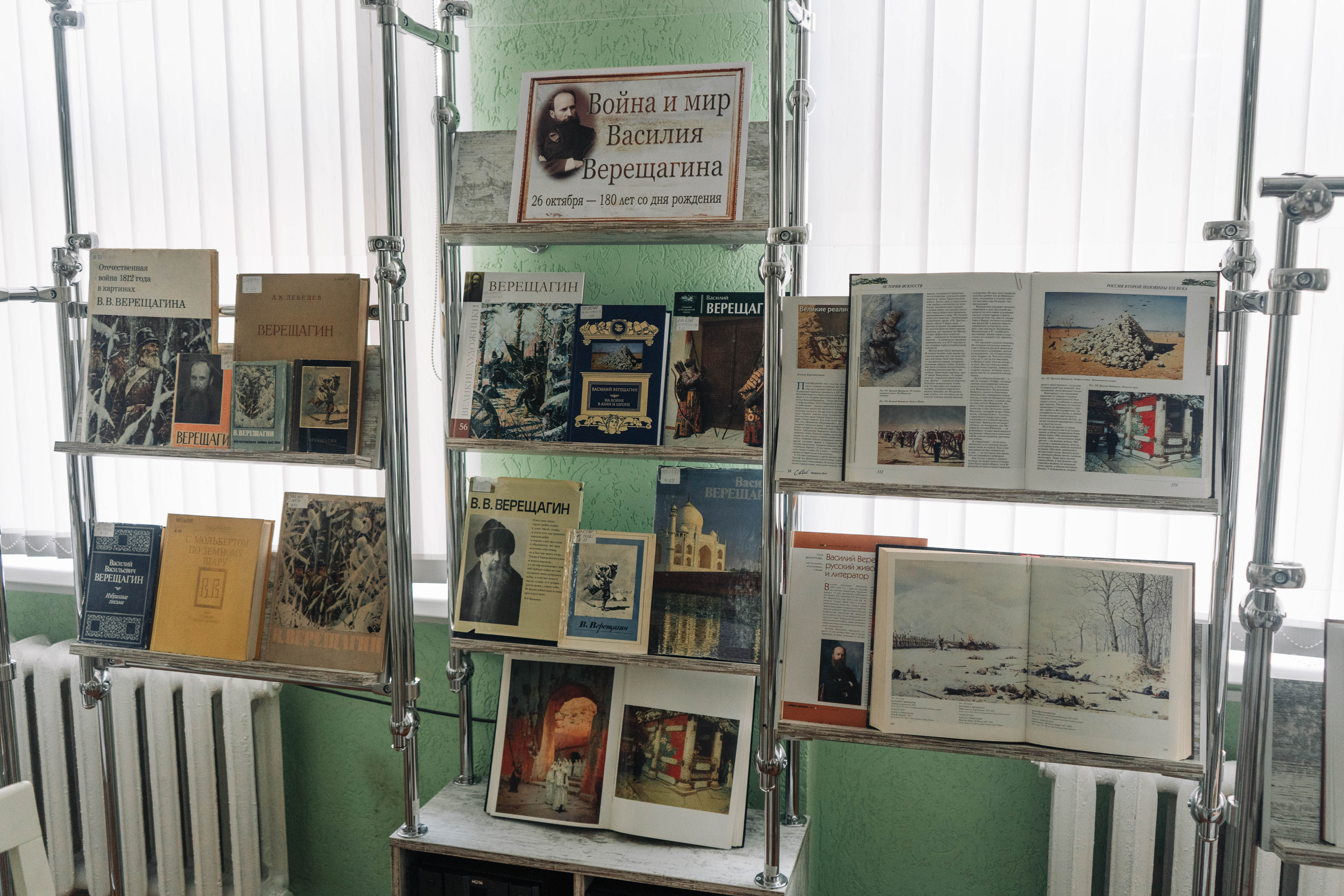 У экспазіцыі прадстаўлены кнігі, энцыклапедыі, мастацкія альбомы, перыядычныя выданні, камплекты паштовак, асобныя рэпрадукцыі. Цікавасць уяўляе альбом Я. Брука «Василий Верещагин» (Масква, 2004), які падрыхтаваны да юбілейнай выставы мастака. У выданне ўваходзяць артыкулы, напісаныя вядучымі расійскімі і замежнымі мастацтвазнаўцамі, дзе разглядаюцца розныя аспекты творчасці мастака. Альбом Я. У. Завадскай (Масква, 1986) прысвечаны жыццю і творчасці В. Верашчагіна. Аўтар распавядае пра вытокі творчасці мастака і школу майстэрства. Кніга «Василий Васильевич Верещагин» (Масква, 2010) з серыі «Великие художники» — гэта багата ілюстраваная манаграфія аб жыцці і творчасці Верашчагіна. У альбоме больш за 50 ілюстрацый, біяграфія мастака і гісторыі стварэння карцін.