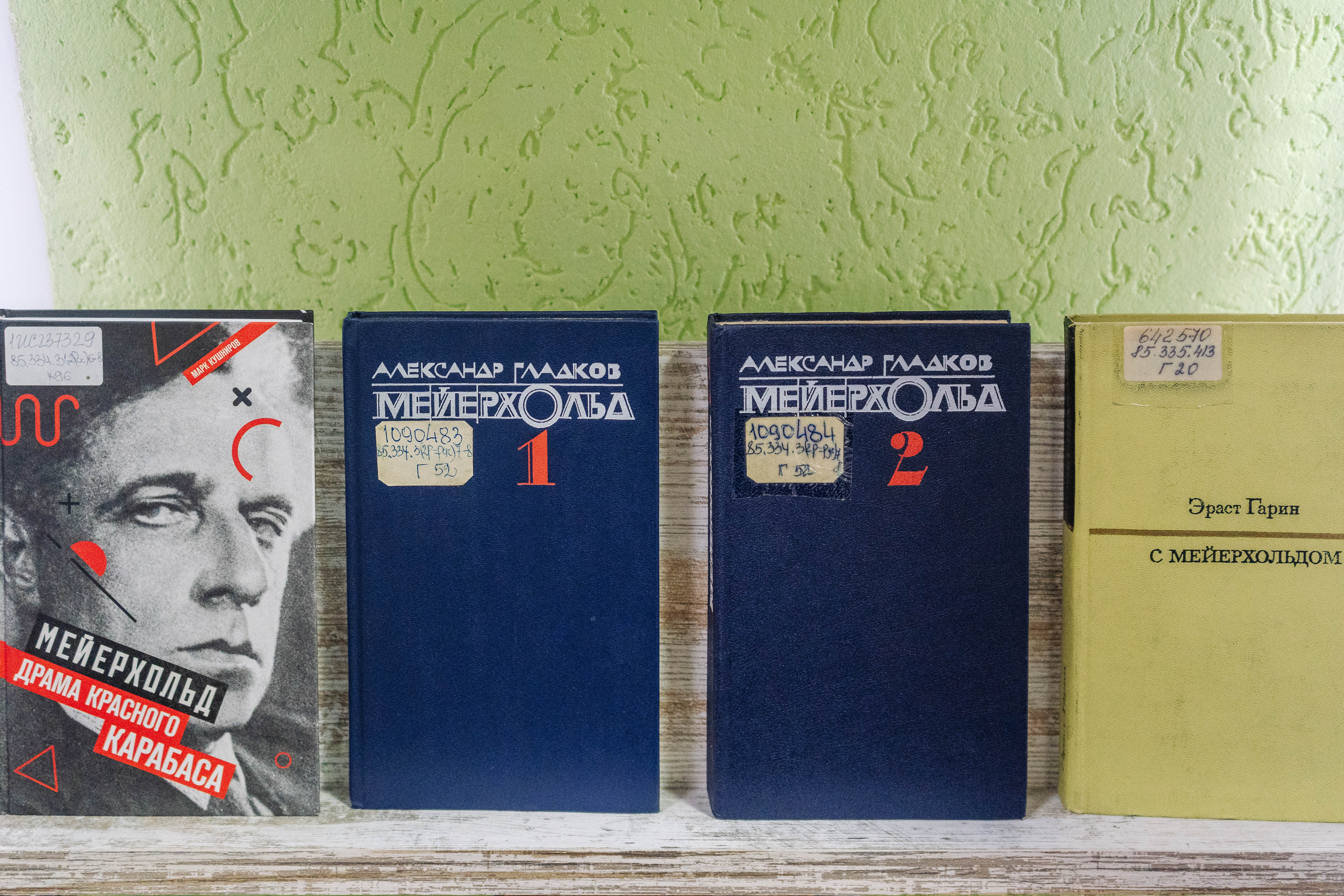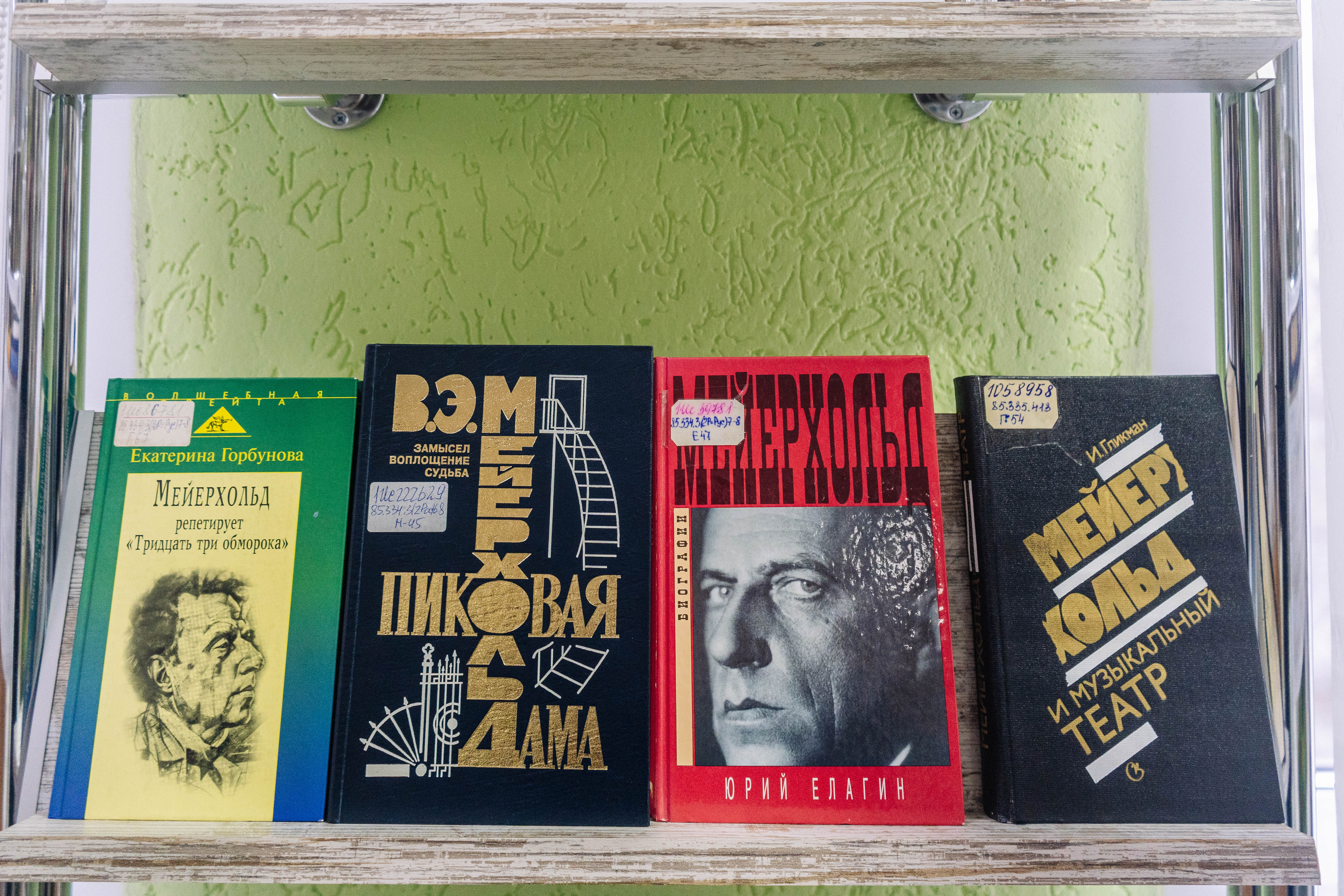 У экспазіцыі прадстаўлены кнігі, паштоўкі, рэпрадукцыі, кампакт-дыскі, перыядычныя выданні, якія знаёмяць з жыццём і творчасцю рэжысёра. Імя Усевалада Эмілевіча Меерхольда праслаўлена ў гісторыі расійскага тэатра. Ён прайшоў шлях ад правінцыйнага юнака, які робіць першыя крокі на сцэне, да знакамітага рэжысёра. Няўменне ісці на кампрамісы стала прычынай закрыцця яго тэатра, а потым і яго гібелі. Самалюбівы, капрызны, геній, цудоўны акцёр, самаўладны — такім паўстае Меерхольд у кнізе культуролага Марка Кушнірова «Мейерхольд. Драма красного Карабаса» (Масква, 2018). Кніга Юрыя Елагіна «Всеволод Мейерхольд. Тёмный гений» (Масква, 1998) — адна з лепшых творчых біяграфій. Увага ў кнізе акцэнтуецца на падзеях і фактах жыццёвага шляху Меерхольда, якія аказалі найбольшы ўплыў на яго творчасць. Зборнік «В. Э. Мейерхольд. „Пиковая дама“. Замысел. Воплощение. Судьба» прысвечаны пастаноўцы оперы Чайкоўскага «Пиковая дама» на сцэне Ленінградскага Малога опернага тэатра. У кнізе ўпершыню сабраныя разам дакументы маскоўскіх і пецярбургскіх архіваў, якія дазваляюць прасачыць ход рэпетыцыйнай працы. Прадстаўлены рэцэнзіі, пісьмы, успаміны ўдзельнікаў спектакля.