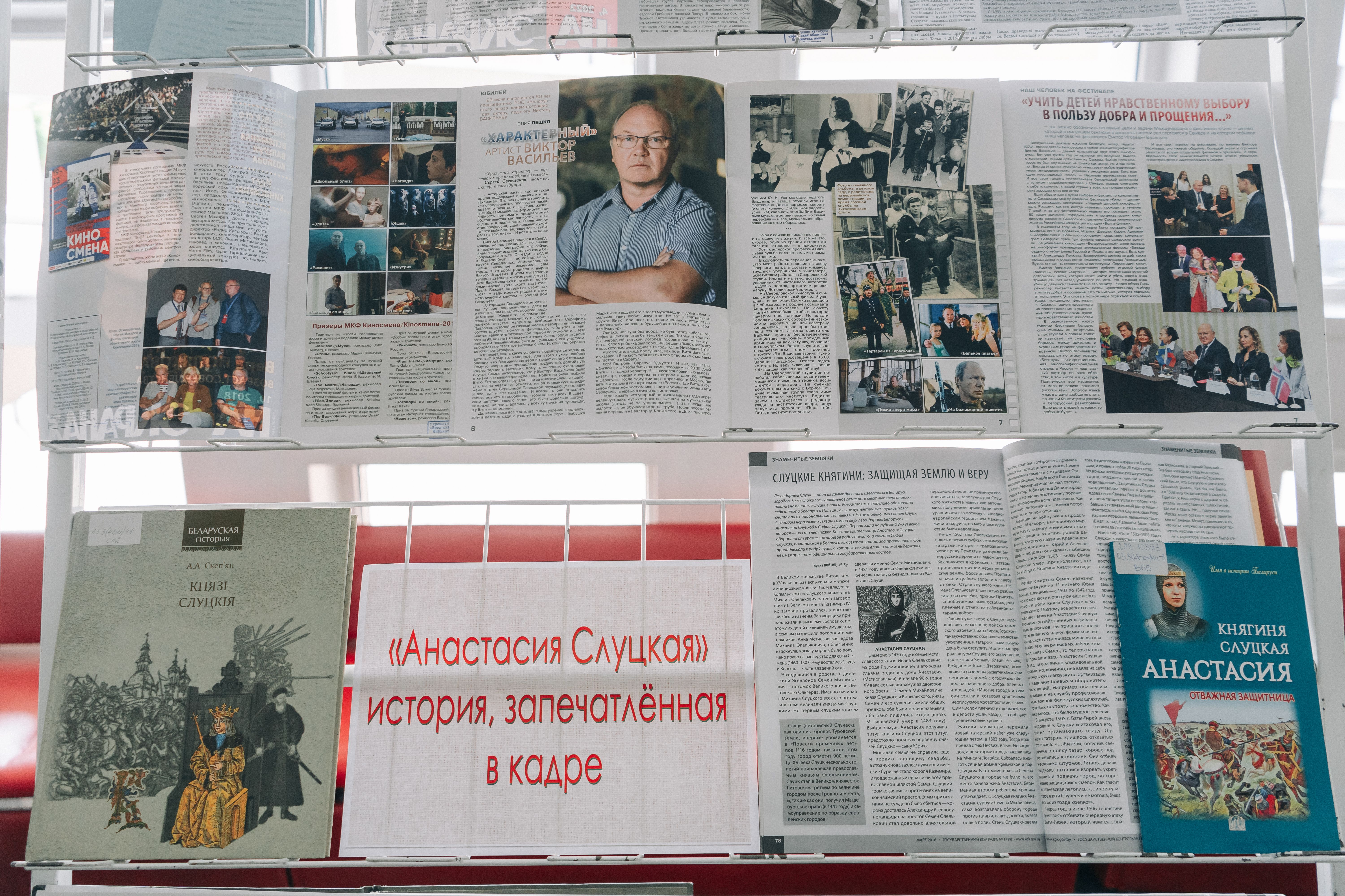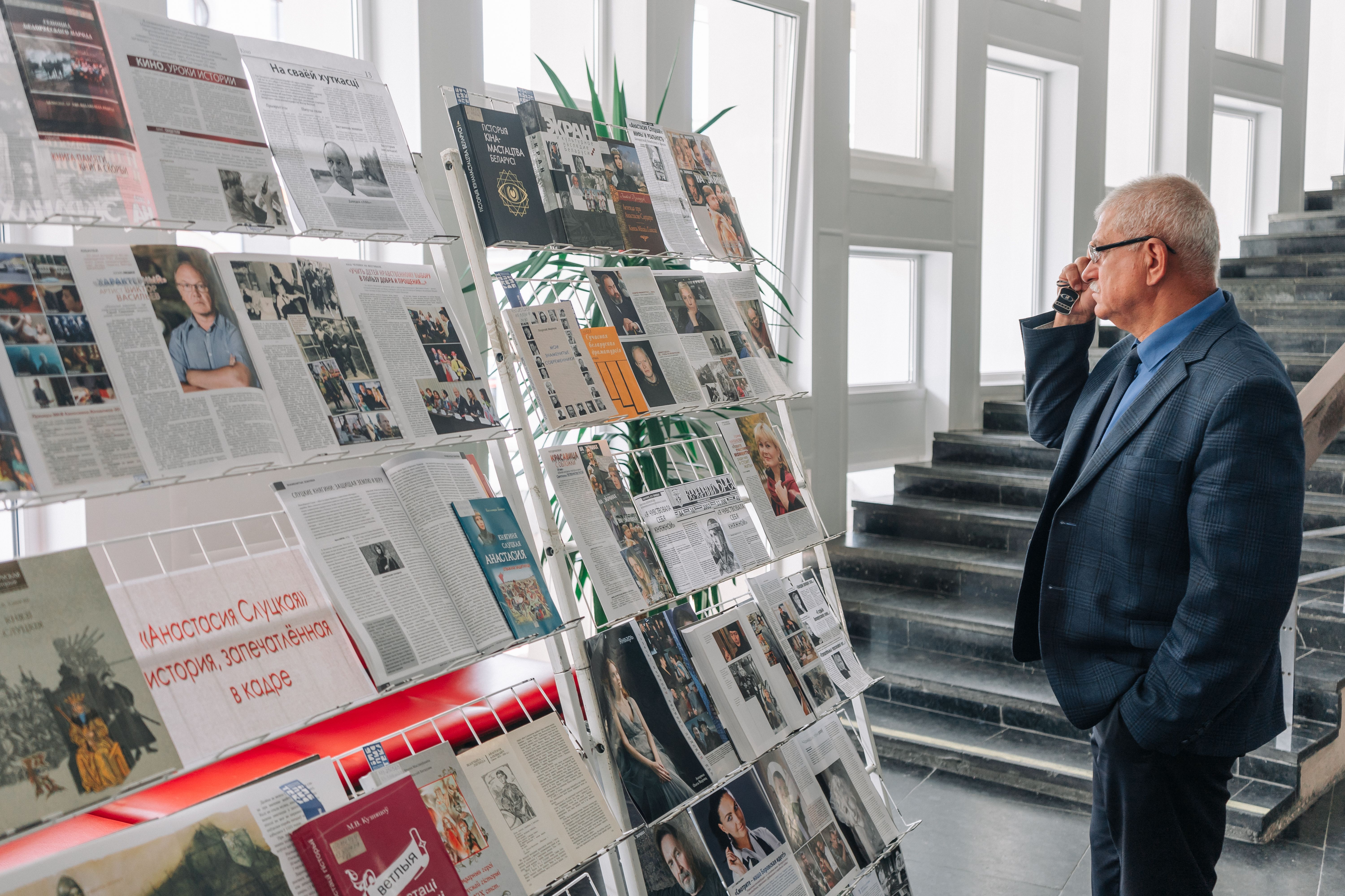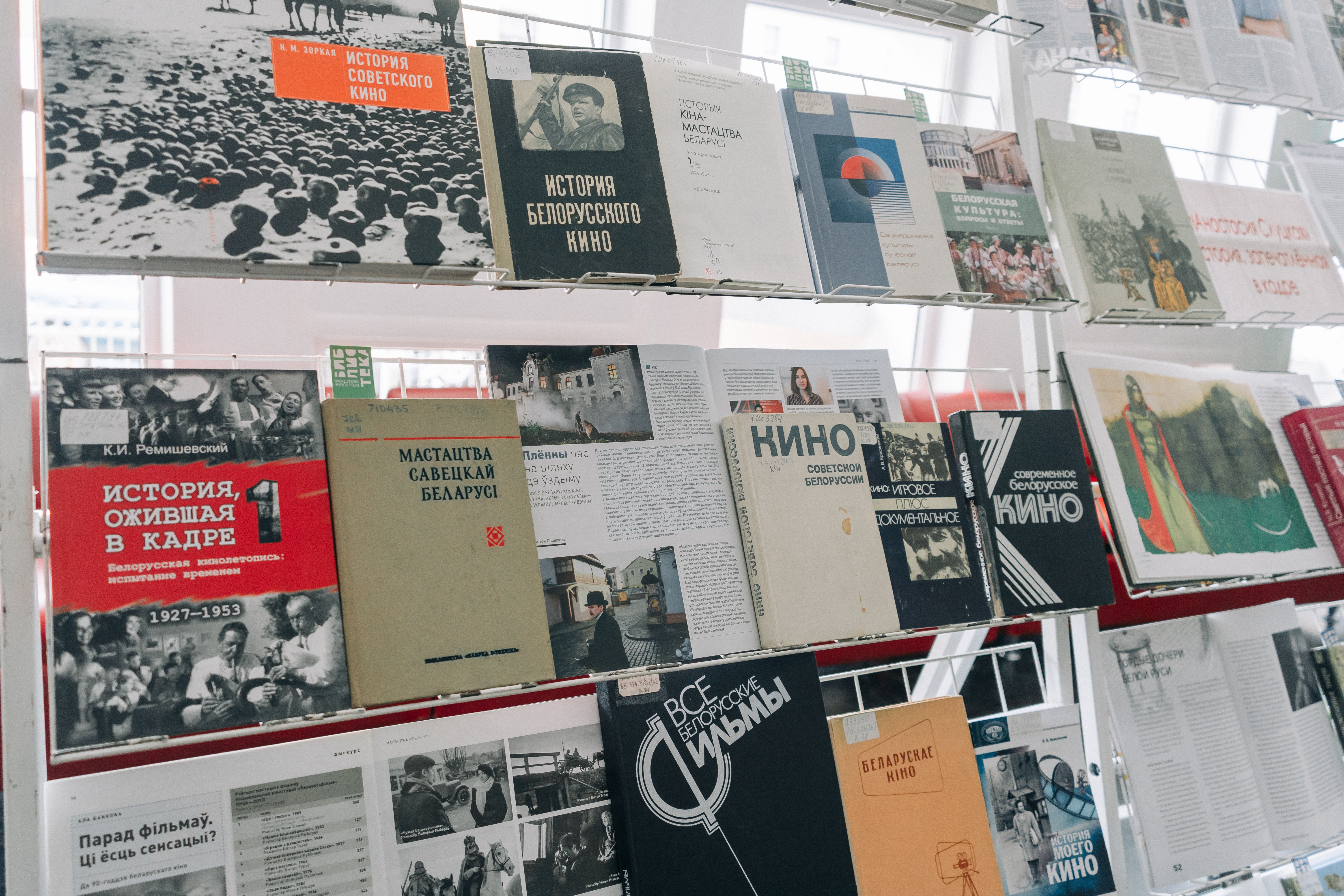 Прадстаўленыя на выстаўцы кніжныя і перыядычныя выданні расказваюць аб адлюстраванні культурнай спадчыны і гістарычных падзей у экранным мастацтве Беларусі. Асобным блокам выставы прадстаўлена падборка матэрыялаў, якія прысвечаны Анастасіі Слуцкай, беларускай кіраўніцы, усё жыццё якой стала прыкладам патрыятызму і самаахвярнага служэння Радзіме. Сярод матэрыялаў — публікацыі, якія знаёмяць са стваральнікамі і акцёрамі кінакарціны.