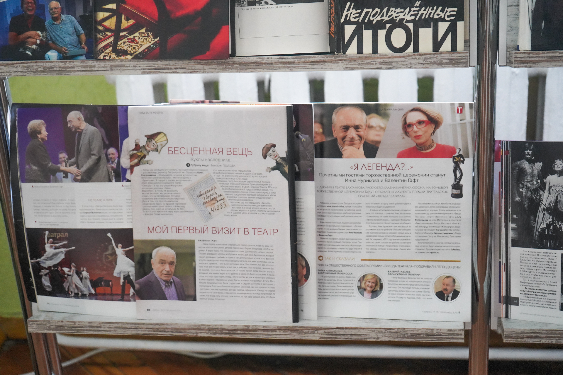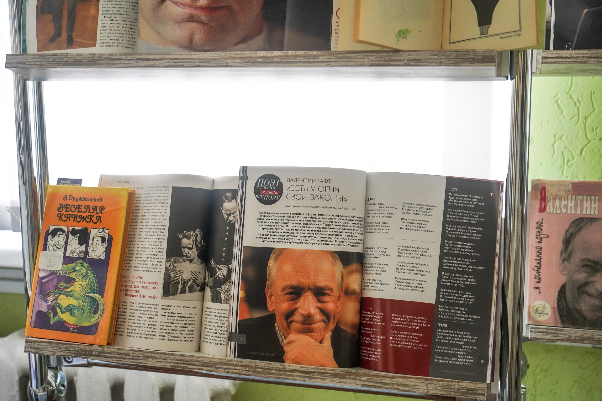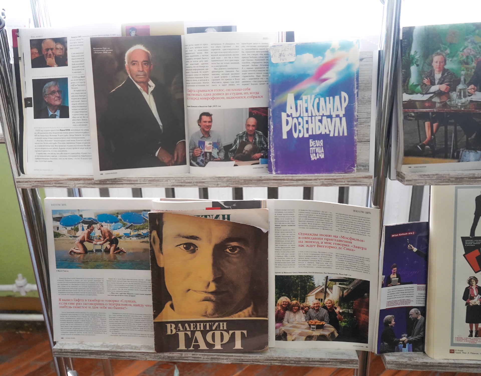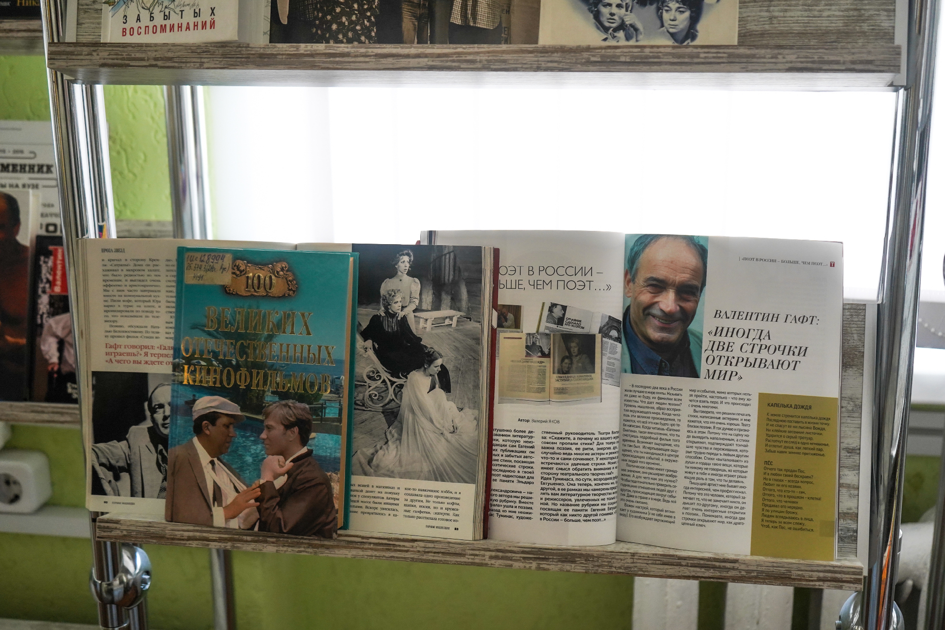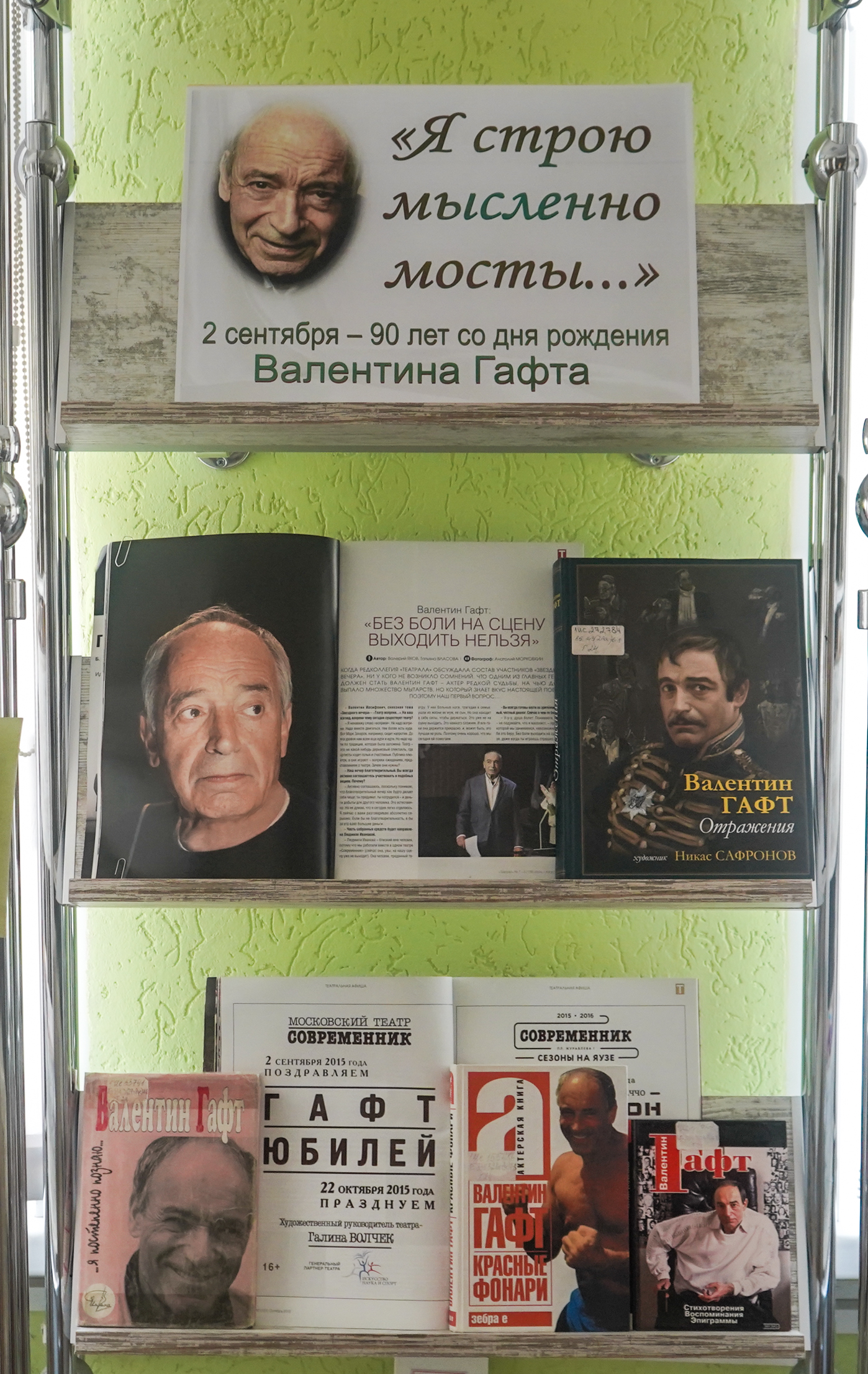 Наша экспазіцыя — гэта літаратура аб жыцці і творчасці Валянціна Гафта. На выставе прадстаўлена каля 40 дакументаў: кніг і перыядычных выданняў. Пра біяграфію і гісторыю ўзнікнення твораў акцёра распавядаюць наступныя кнігі: Раззакоў Ф. «Актеры всех поколений» (2001); Гафт В. «Красные фонари» (2008), Додалеў Я. «24 кадра правды pro кино» (2014) і інш.