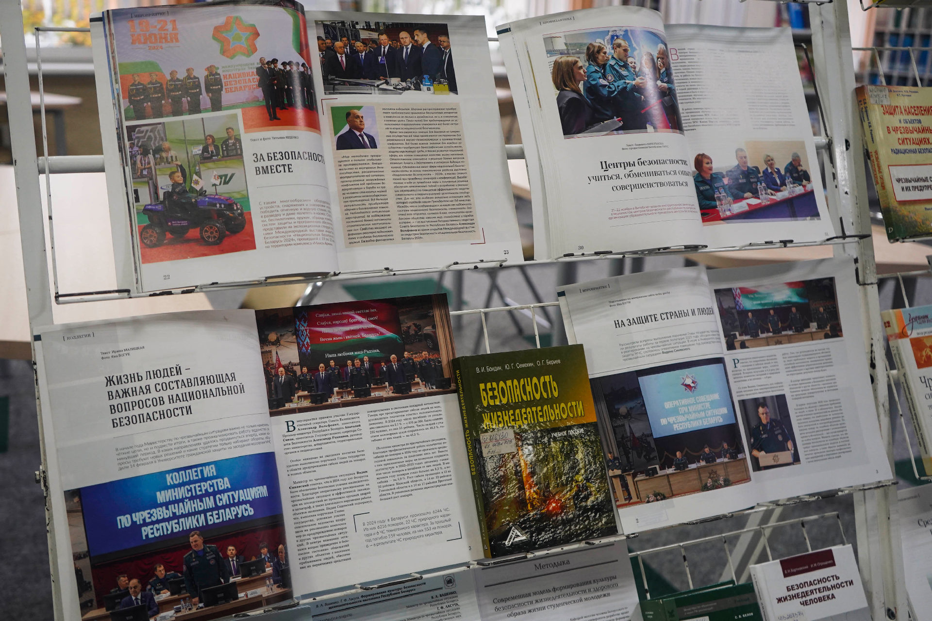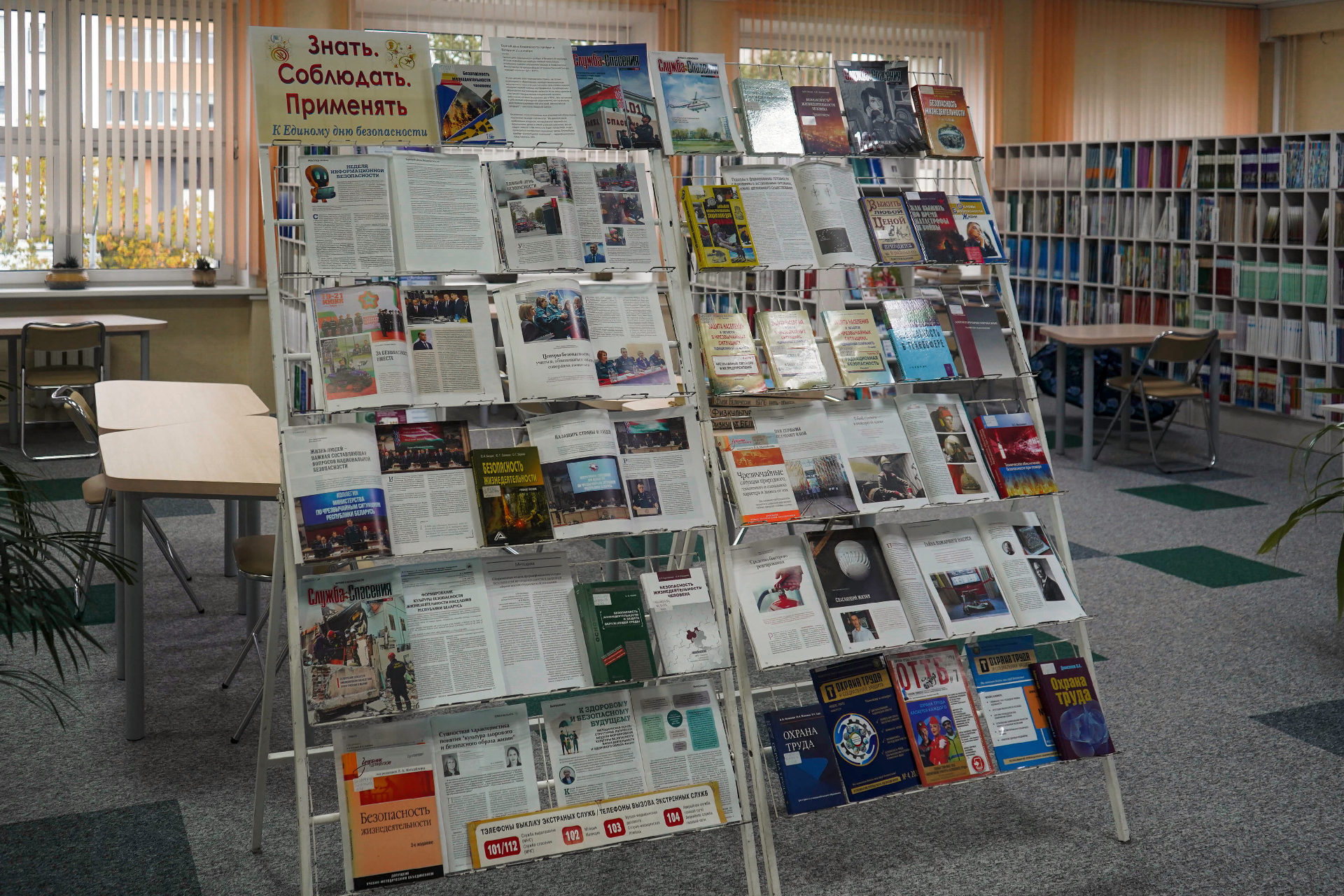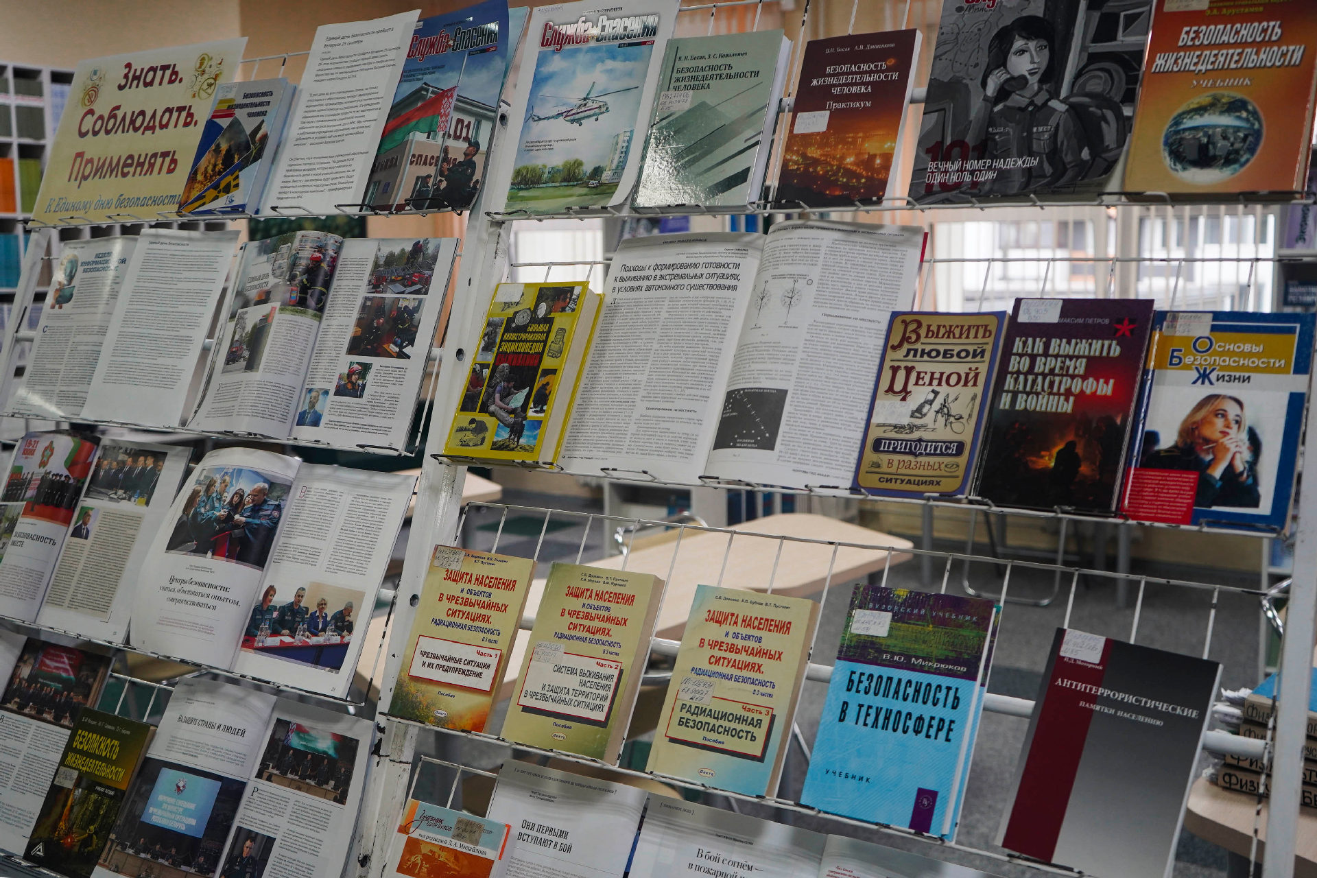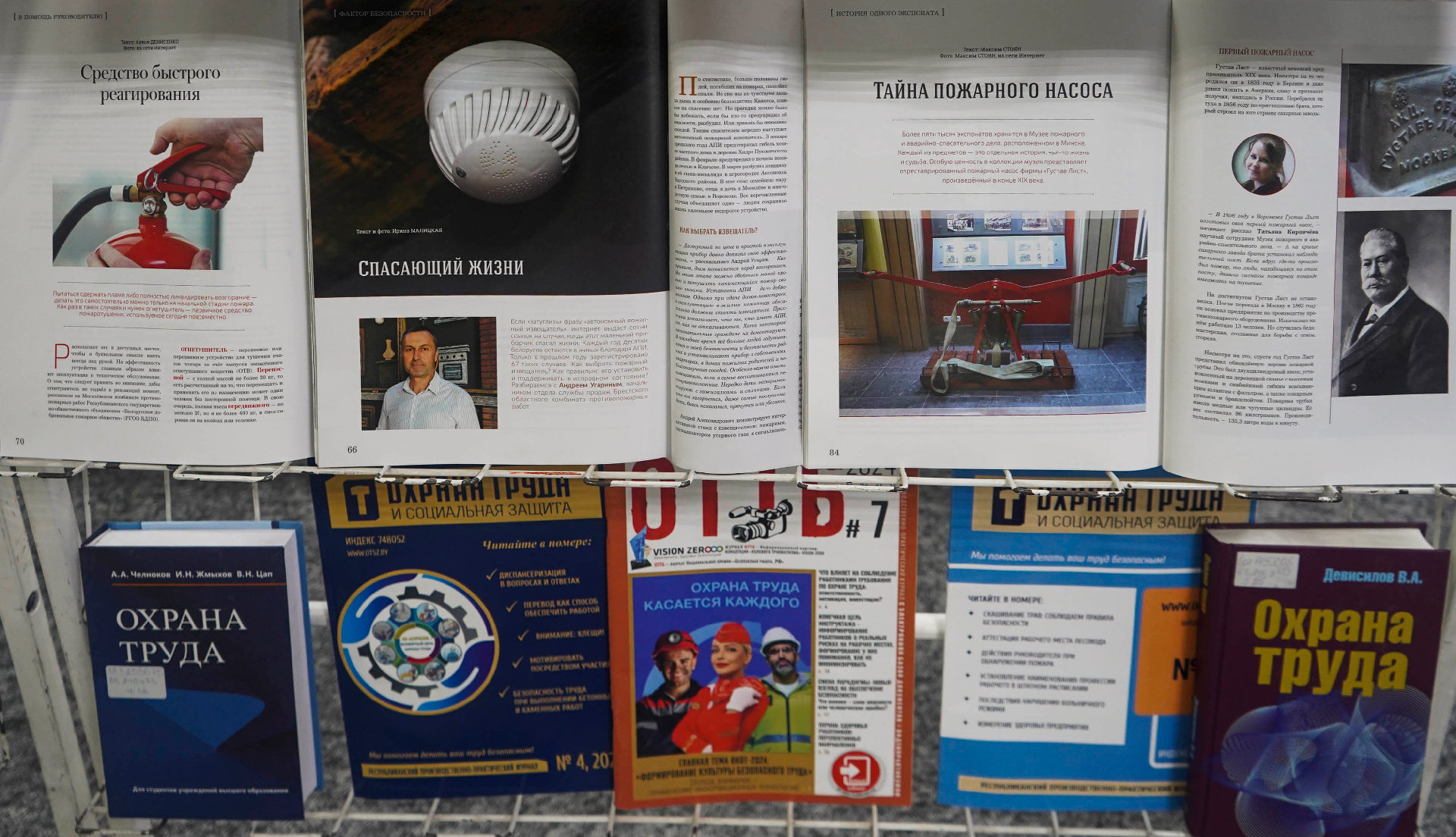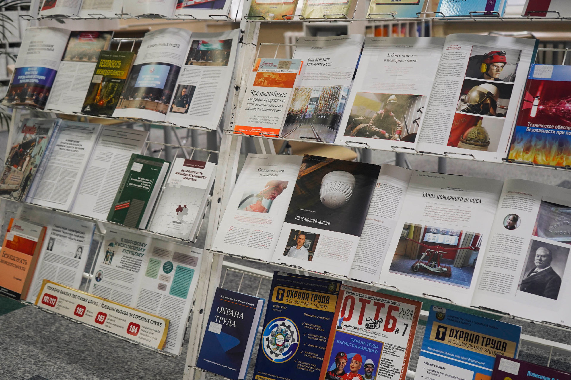 Сярод матэрыялаў экспазіцыі — як кнігі, так і свежыя публікацыі з перыядычных выданняў («Охрана труда и социальнавя защита», «ОТТБ. Охрана труда. Технологии безопасности» и «Служба спасения»).