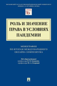 Роль и значение права в условиях пандемии : монография по итогам Международного онлайн-симпозиума / [А. П. Алексеенко и др.] ; под общей редакцией В. В. Блажеева, М. А. Егоровой ; Московский государственный юридический университет им. О. Е. Кутафина (МГЮА). - Москва : Проспект, 2021. - 288 с.