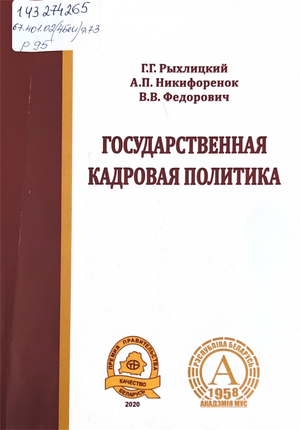 Рыхлицкий, Г. Г. Государственная кадровая политика : учебное пособие для обучающихся учреждений высшего образования Министерства внутренних дел Республики Беларусь по специальности 1-26 80 08 «Государственное управление и право» / Г. Г. Рыхлицкий, А. П. Никифоренок, В. В. Федорович ; под общей редакцией Г. Г. Рыхлицкого ; Учреждение образования «Академия Министерства внутренних дел Республики Беларусь». – Минск : Академия МВД, 2022. – 147 с.