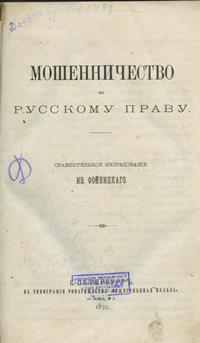 Фойницкий, И. Я. Мошенничество по русскому праву : сравнительное исследование Ив. Фойницкого / И. Я. Фойницкий. – С.-Петербург : Типография товарищества «Общественная польза», 1871. – VIII, 289 с.