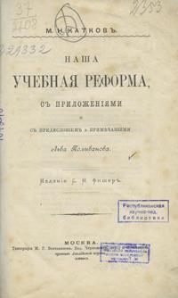 Катков, М. Н. Наша учебная реформа, с приложениями и с предисловием и примечаниями Льва Поливанова / М. Н. Катков. – Москва : Издание С. Н. Фишер : Типография М. Г. Волчанинова, 1890. – XII, 166, [1] с.