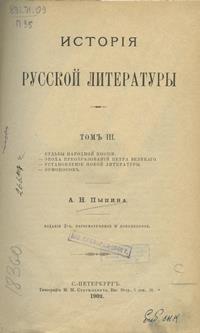 Пыпин, А. Н. История русской литературы : [в 4 т. / сочинения] А. Н. Пыпина. – Санкт-Петербург : Типография М. М. Стасюлевича, 1902–1903. Т. 3 : Судьбы народной поэзии. Эпоха преобразований Петра Великого. Установление новой литературы. Ломоносов. – 1902. – X, 543 с.