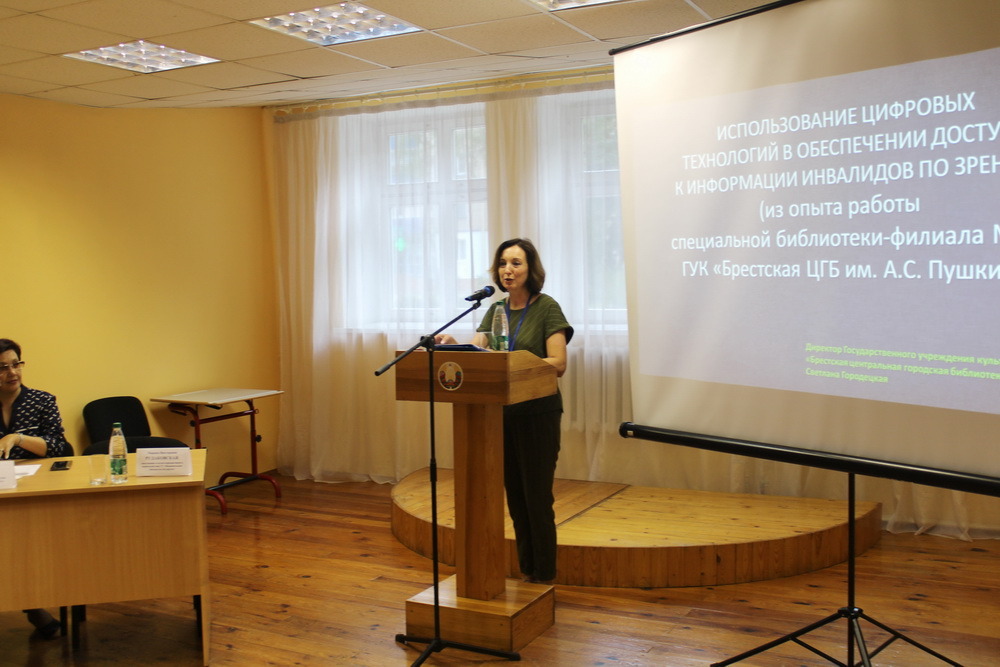 В выступлении С. И. Городецкой, директора ГУК «Брестская ЦГБ им. А. С. Пушкина», был затронут важный аспект информационно-библиотечной деятельности — предоставление доступа к информации инвалидам по зрению.