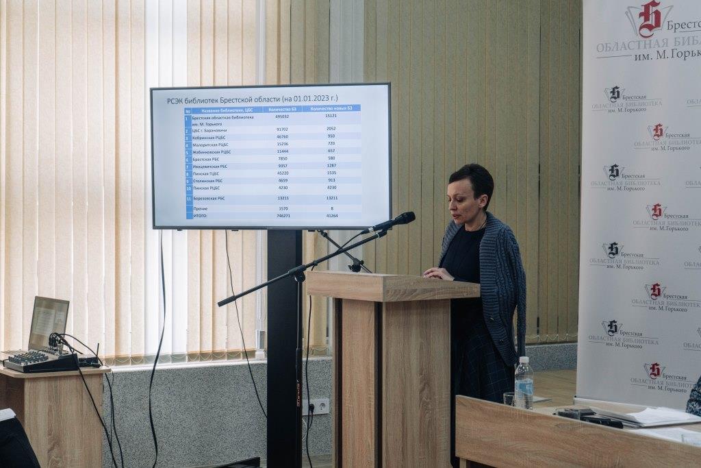 Открыла мероприятие А. С. Кузьмина, зав. отделом библиотековедения Брестской областной библиотеки им. М. Горького с анализом работы публичных библиотек Брестской области в 2022 году. Зав. отделом формирования библиотечного фонда Брестской областной библиотеки им. М. Горького С. Г. Говоруха рассказала об изменениях в «Інструкцыі аб парадку арганізацыі бібліятэчных фондаў і выключэння з іх дакументаў», а с докладом «Функционирование Регионального сводного электронного каталога библиотек Брестской области» выступила Ю. В. Цандо, зав. отделом организации каталогов Брестской областной библиотеки им. М. Горького.